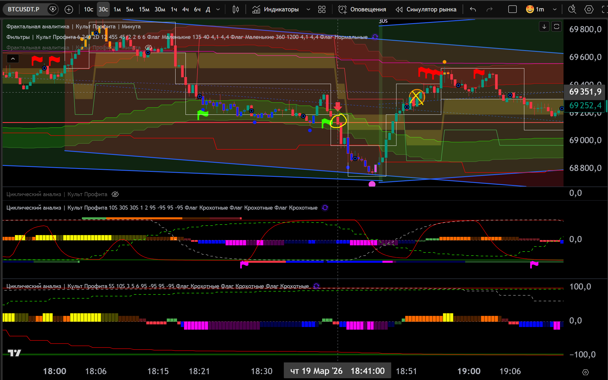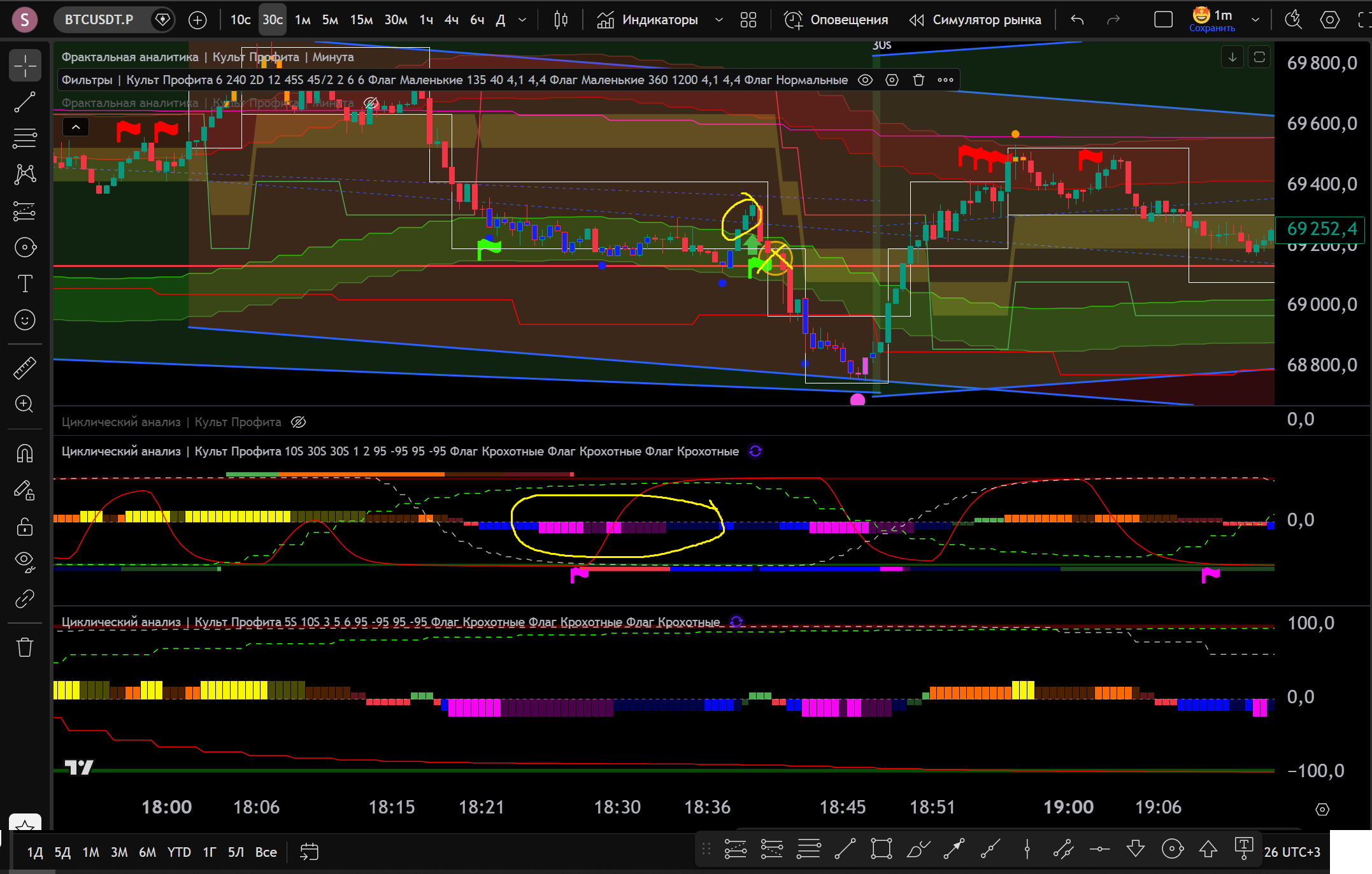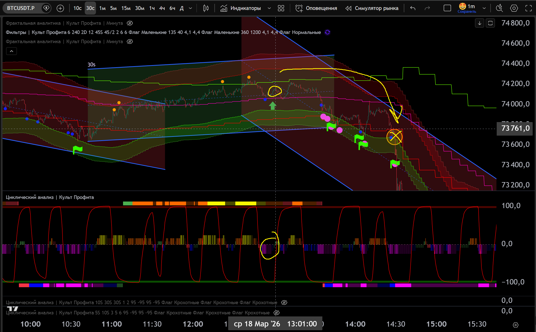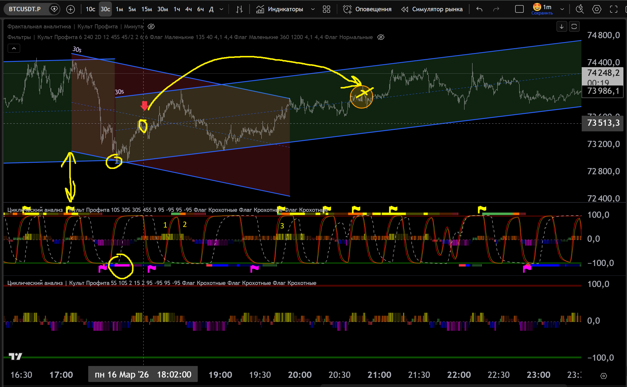Заходил в Шорт в откат до нижней границы часа, потом сломали канал 30s в Шорт и я добрал на Желтом Хаю 10s - тейк Фиолетовый Лой на 30s