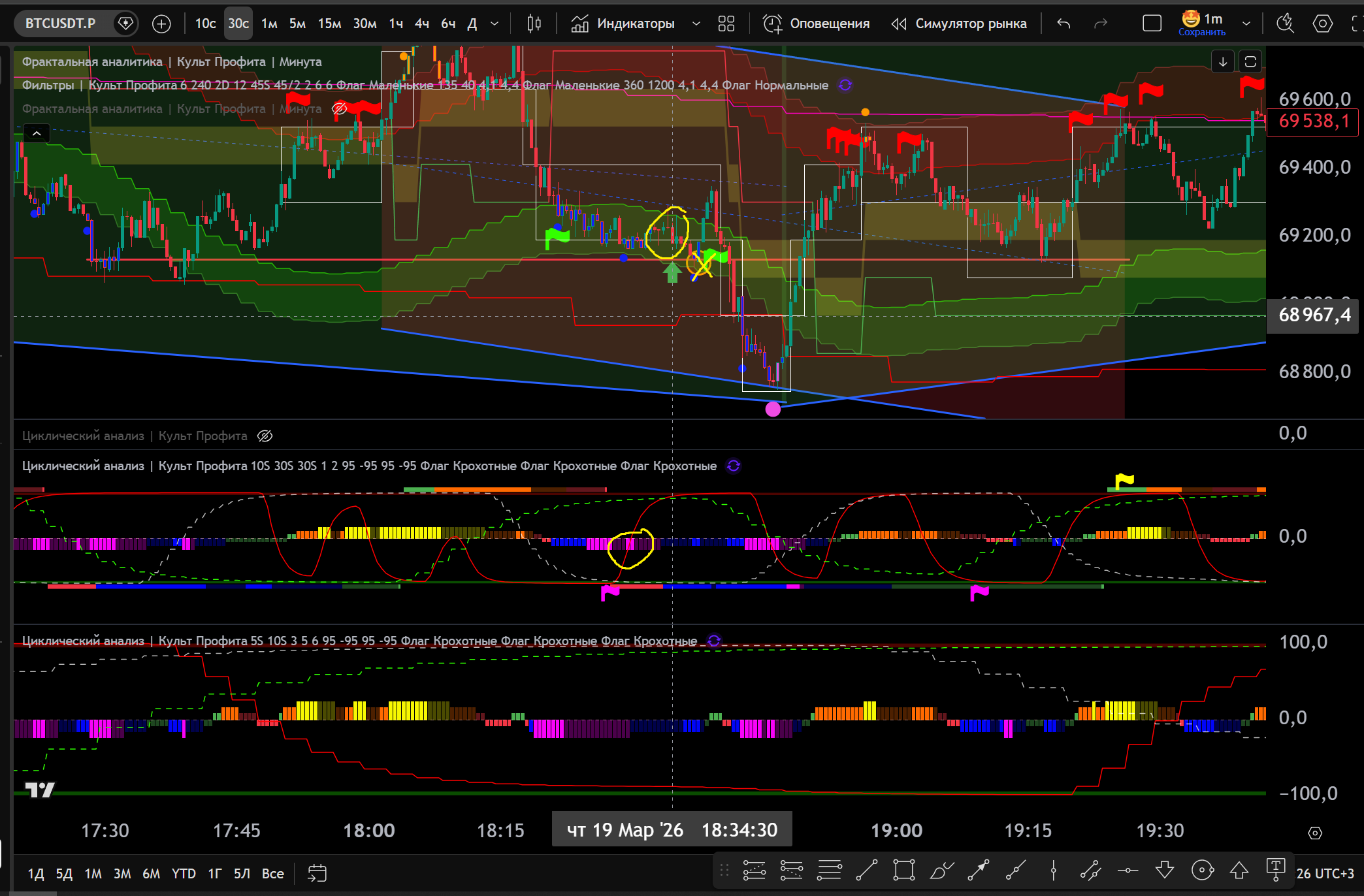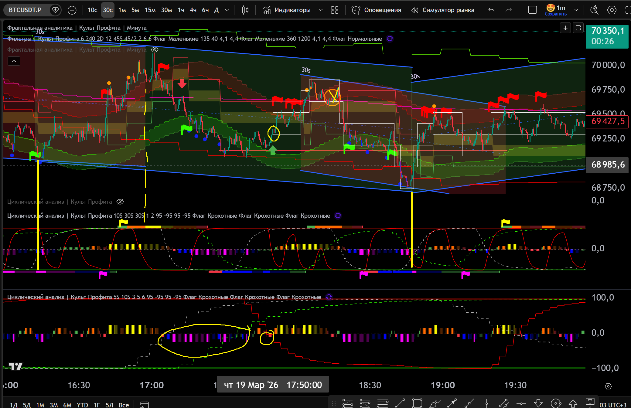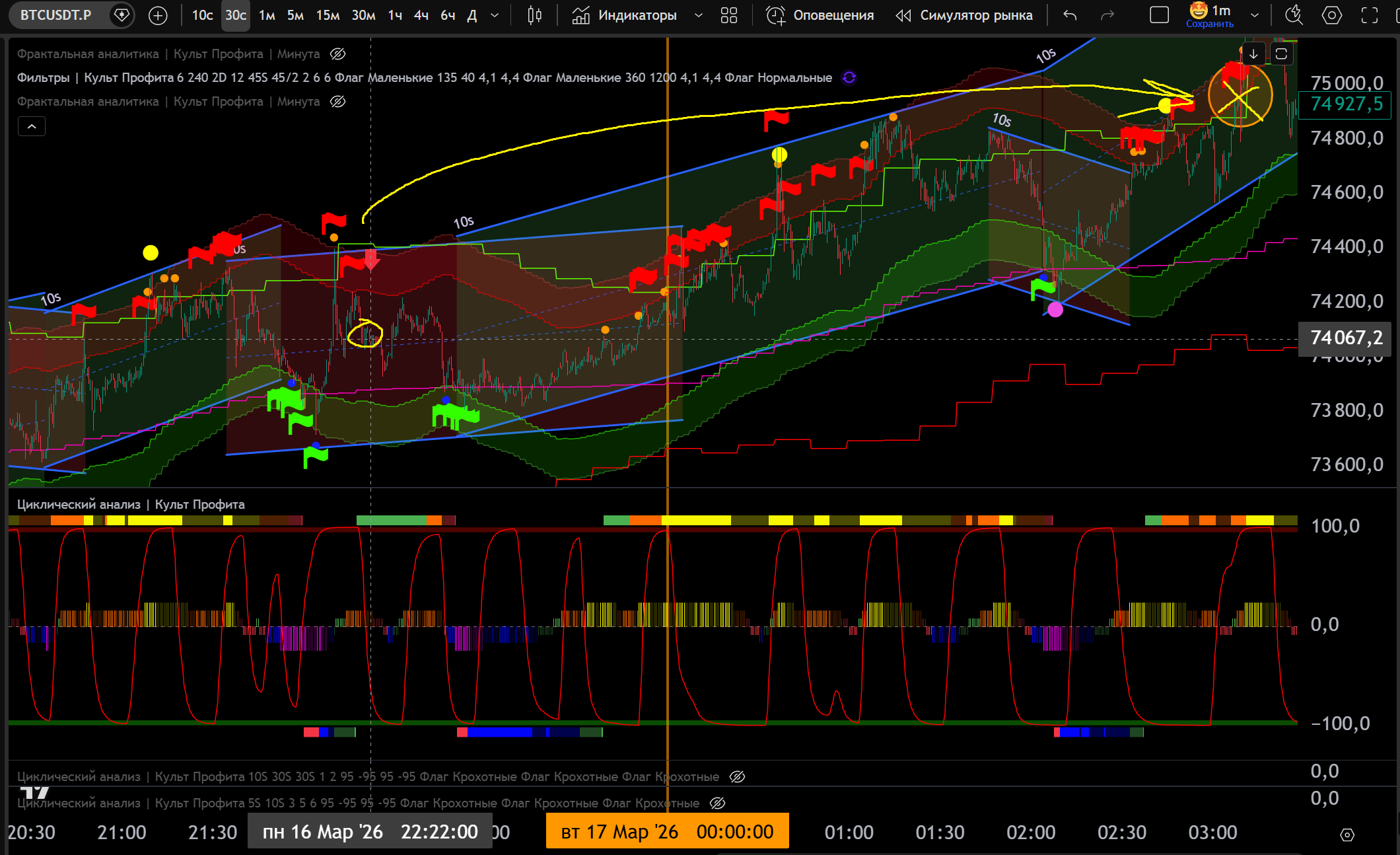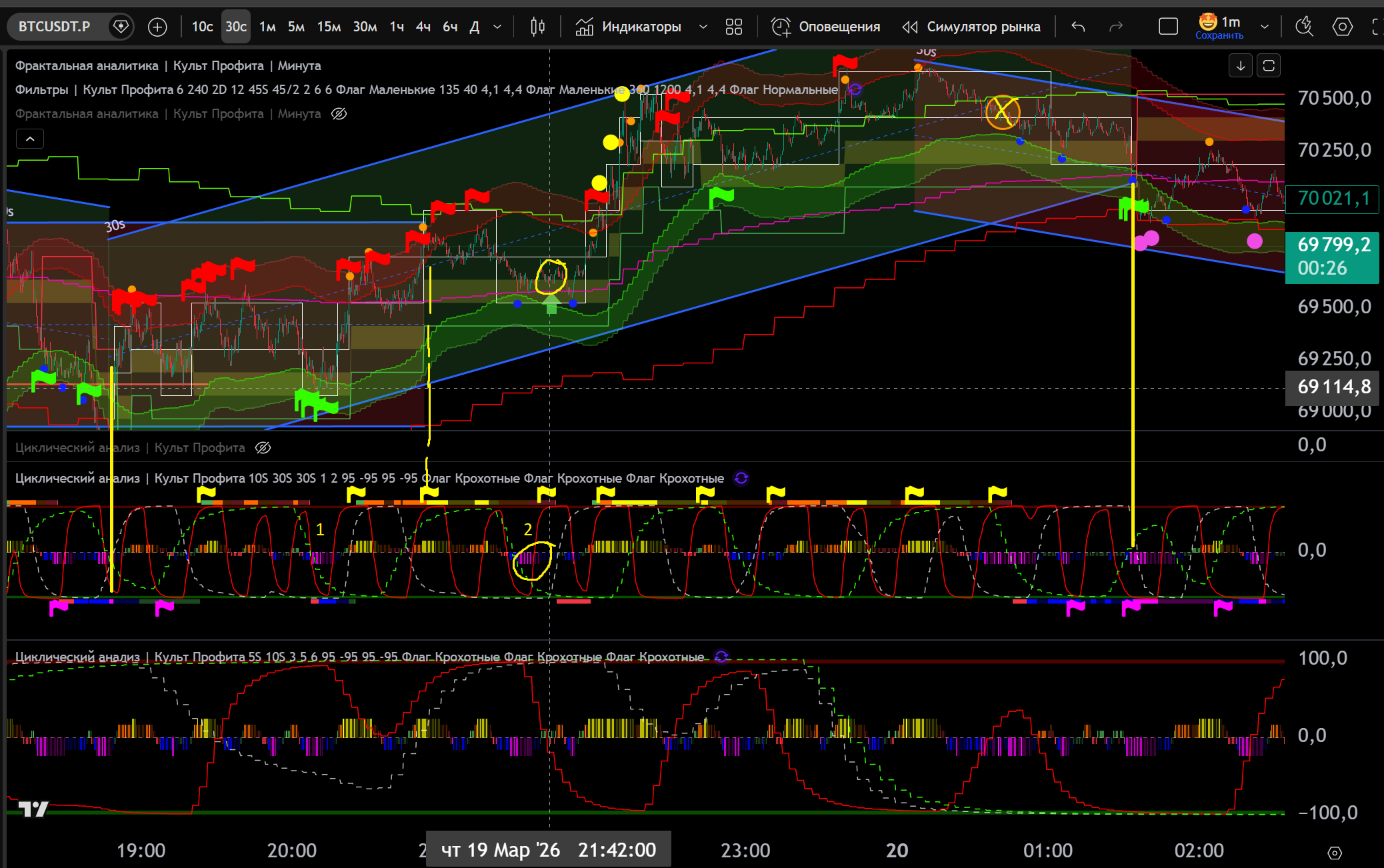 Заходил в Шорт в откат до нижней границы часа, потом сломали канал 30s в Шорт и я добрал на Желтом Хаю 10s - тейк Фиолетовый Лой на 30s