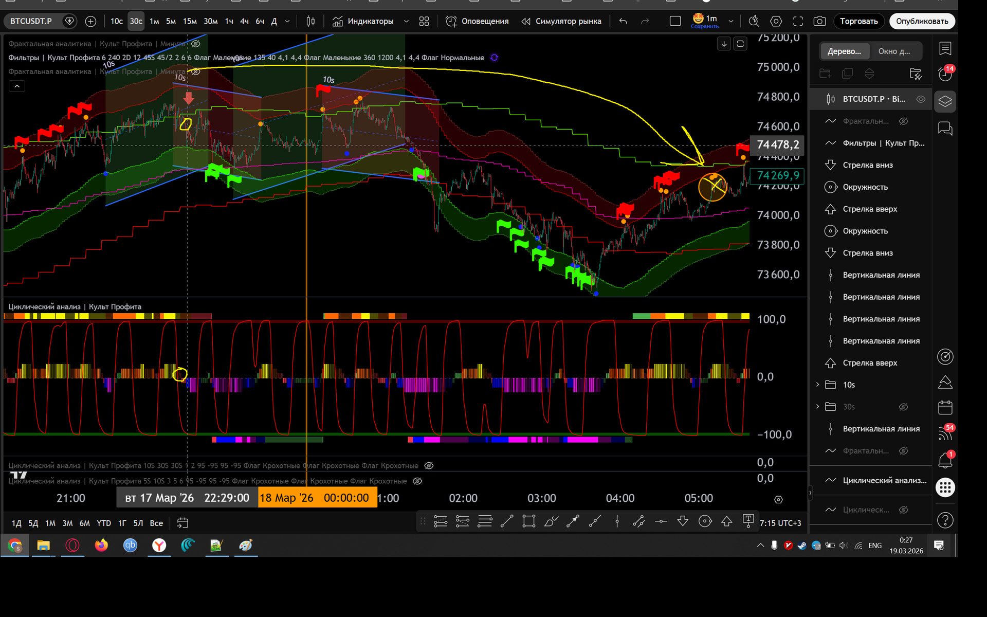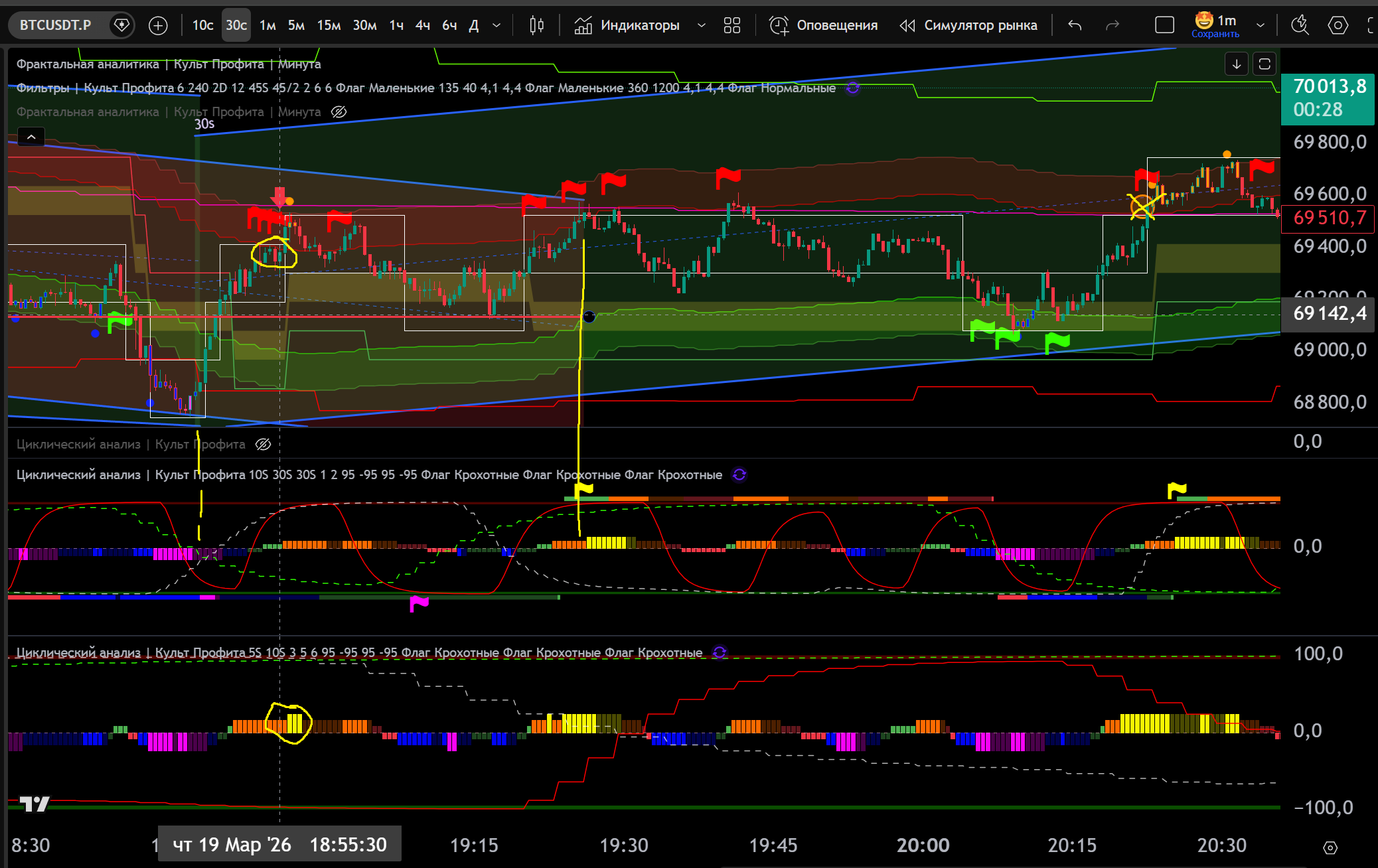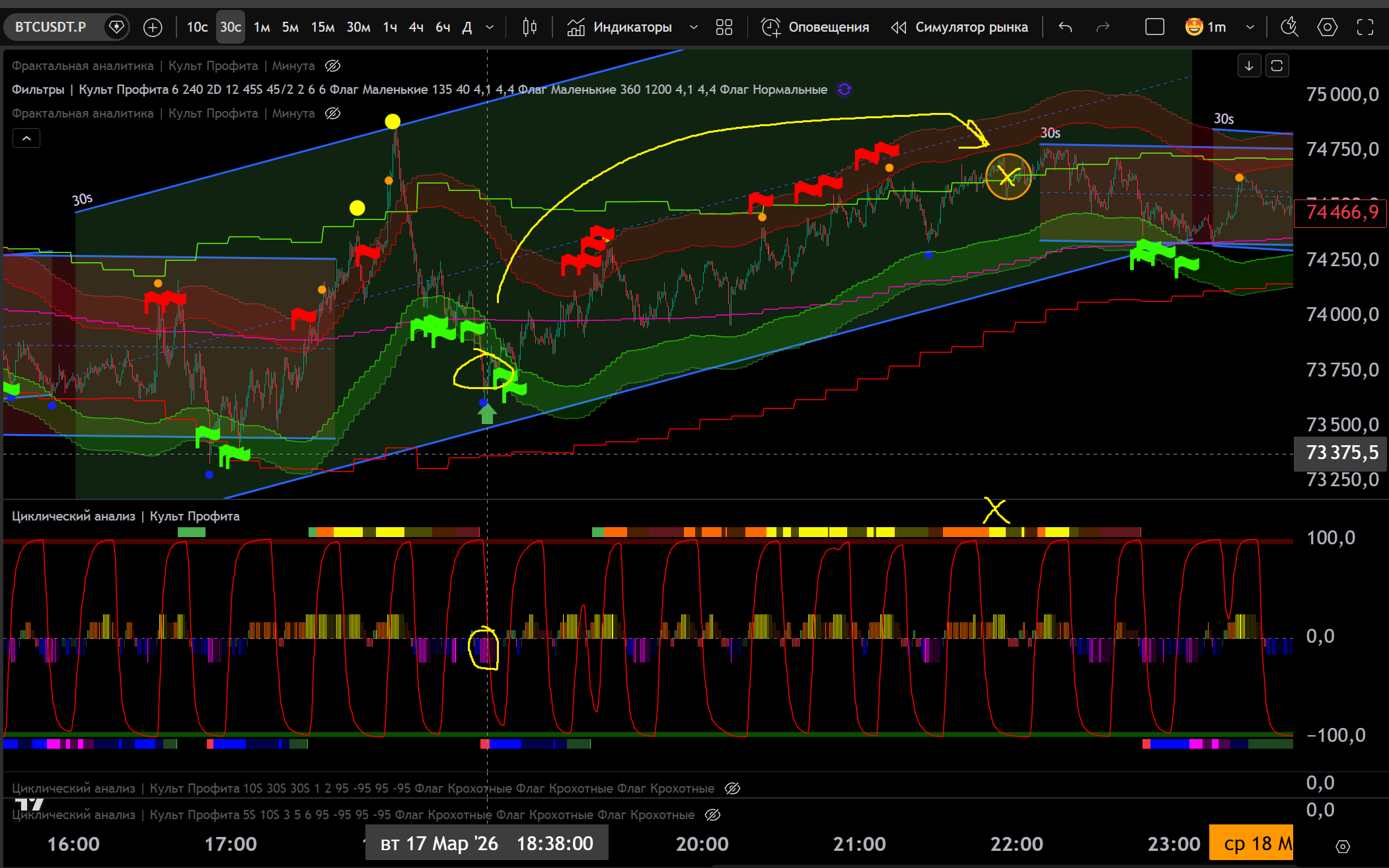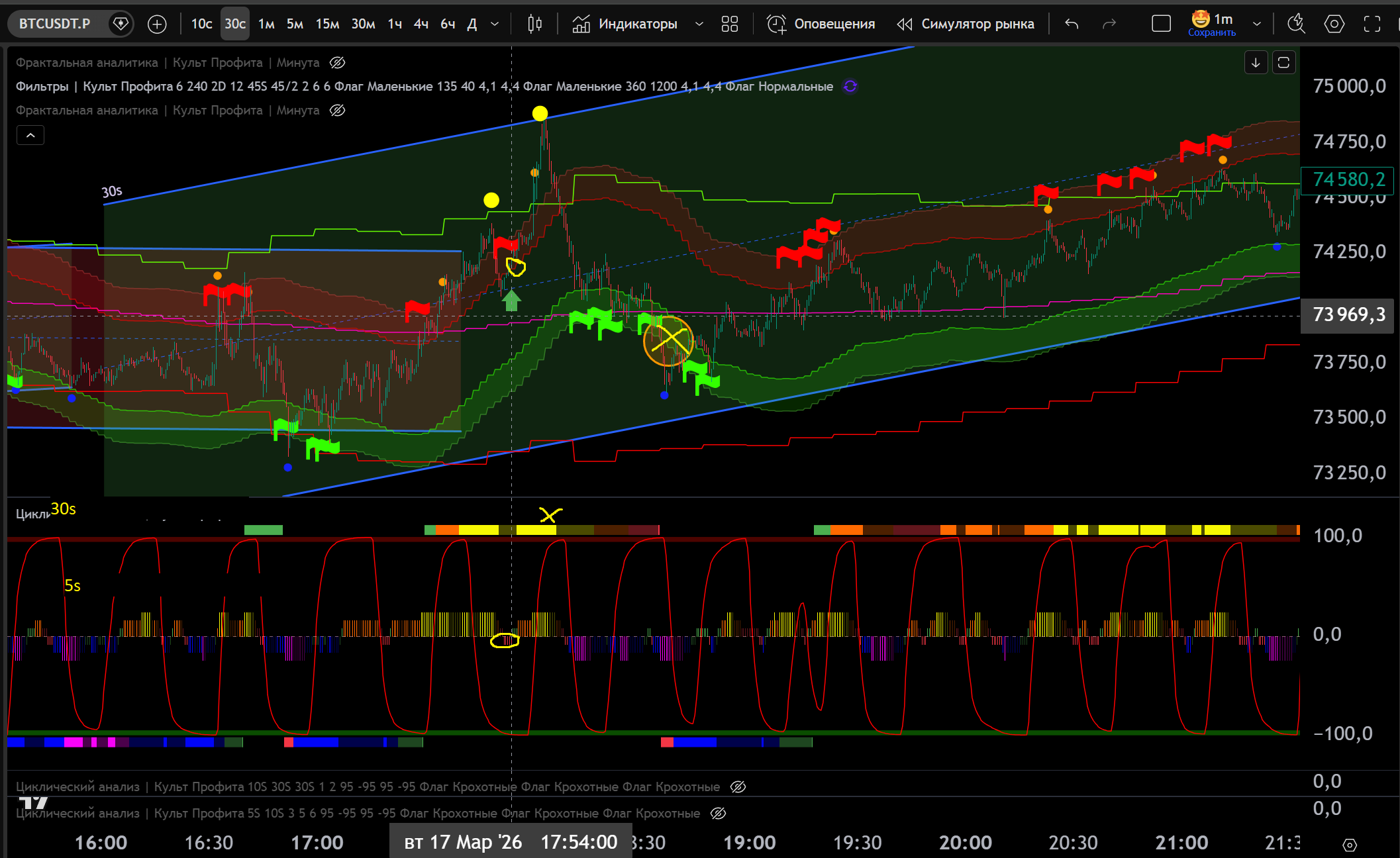 Заходил в Шорт в откат до нижней границы часа, потом сломали канал 30s в Шорт и я добрал на Желтом Хаю 10s - тейк Фиолетовый Лой на 30s