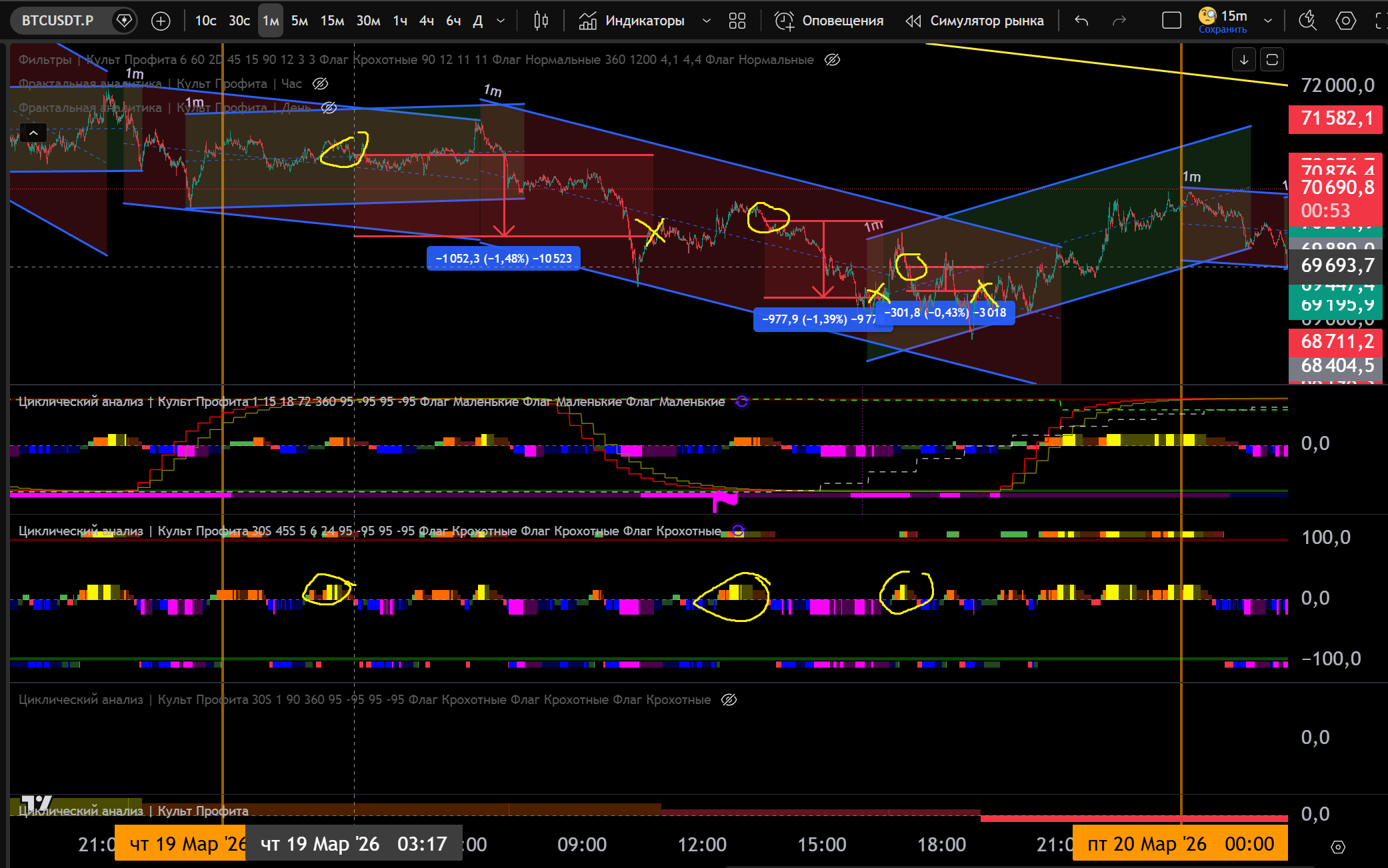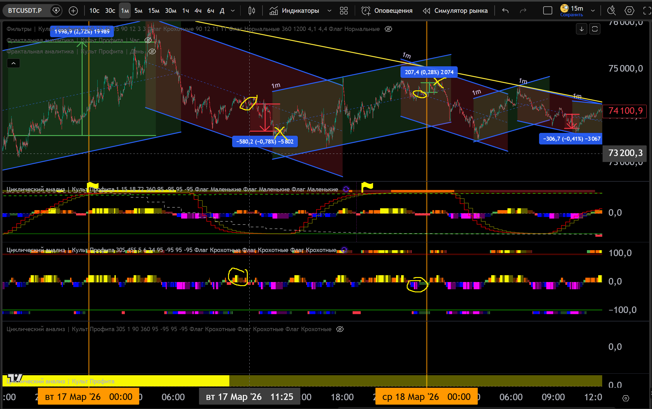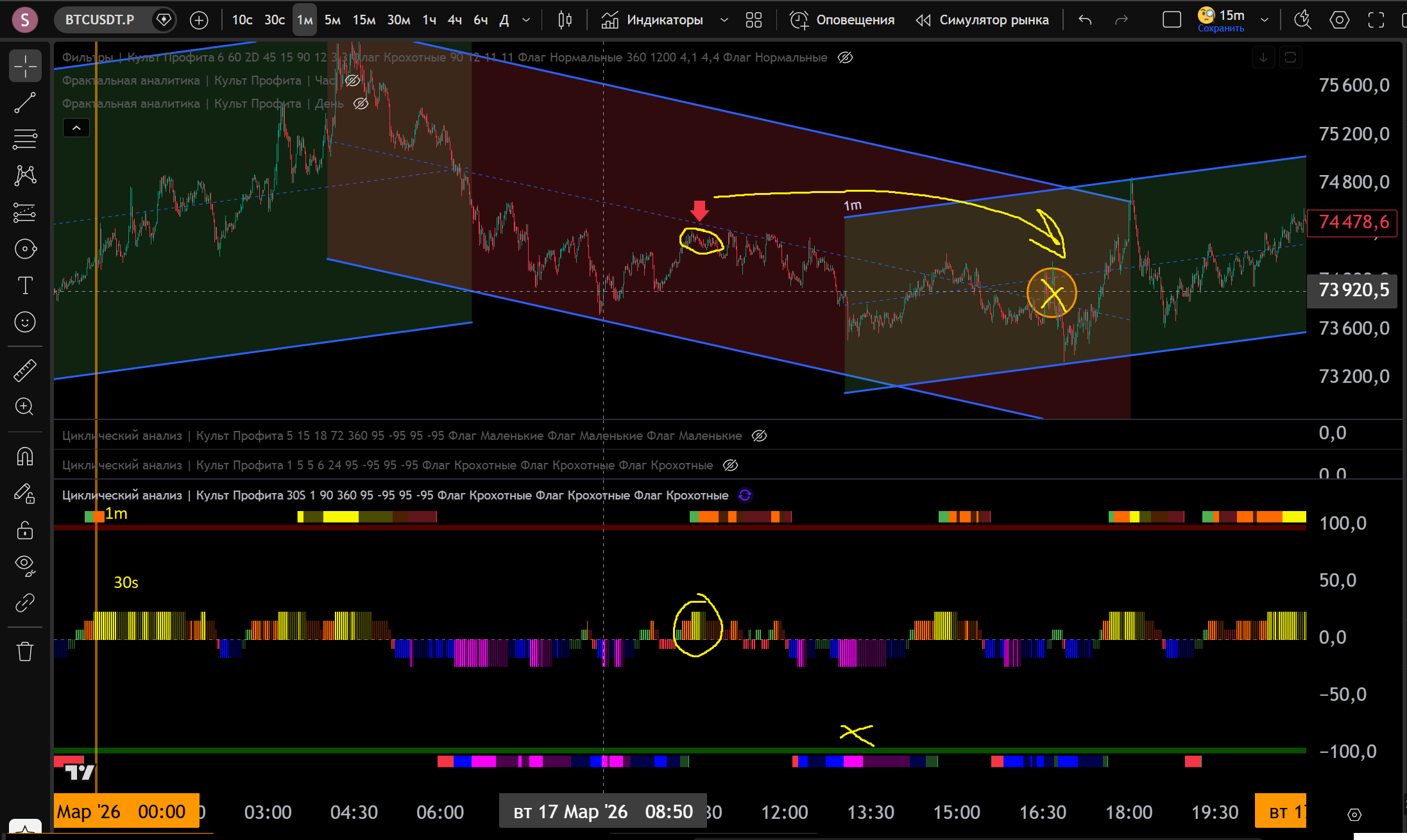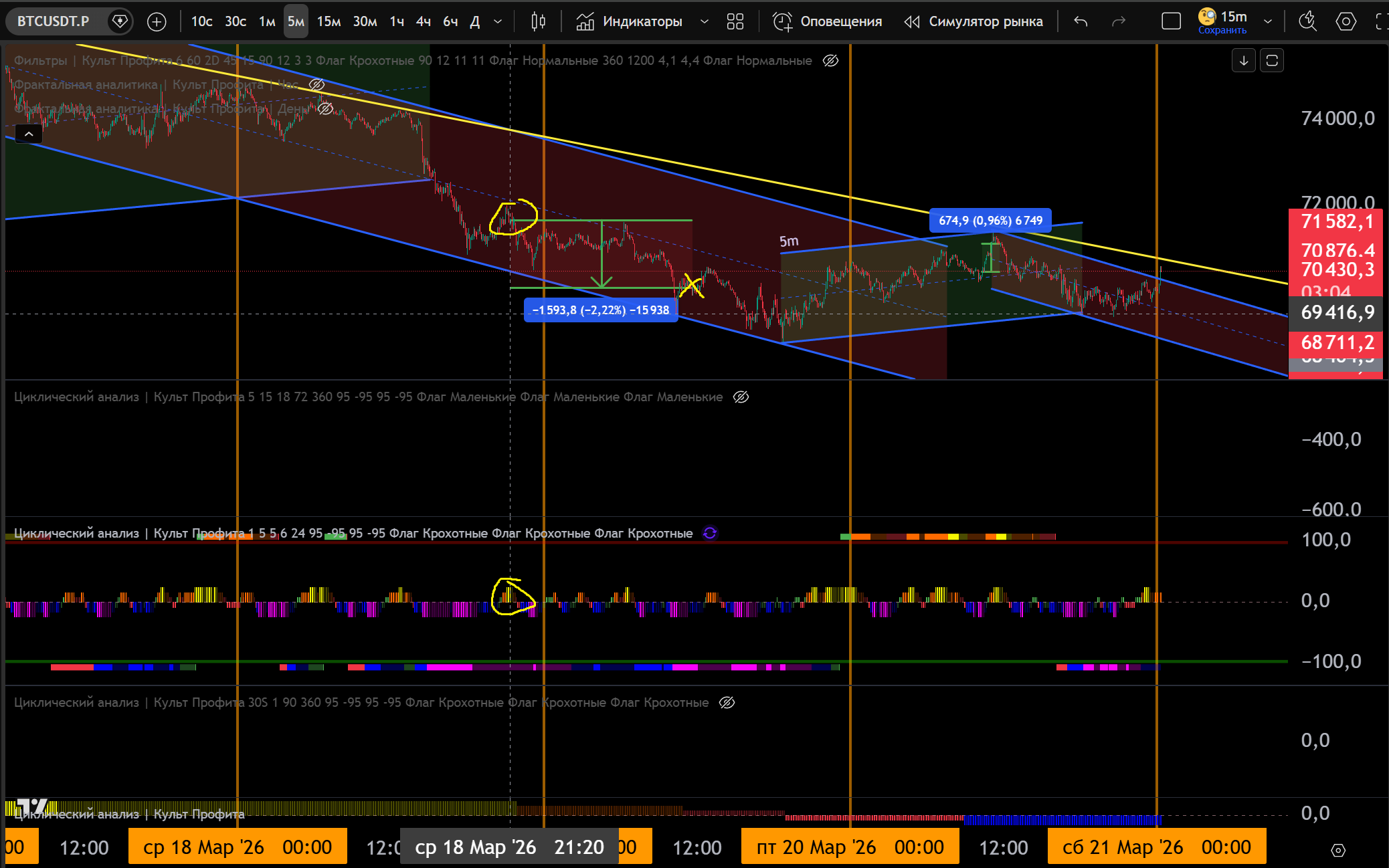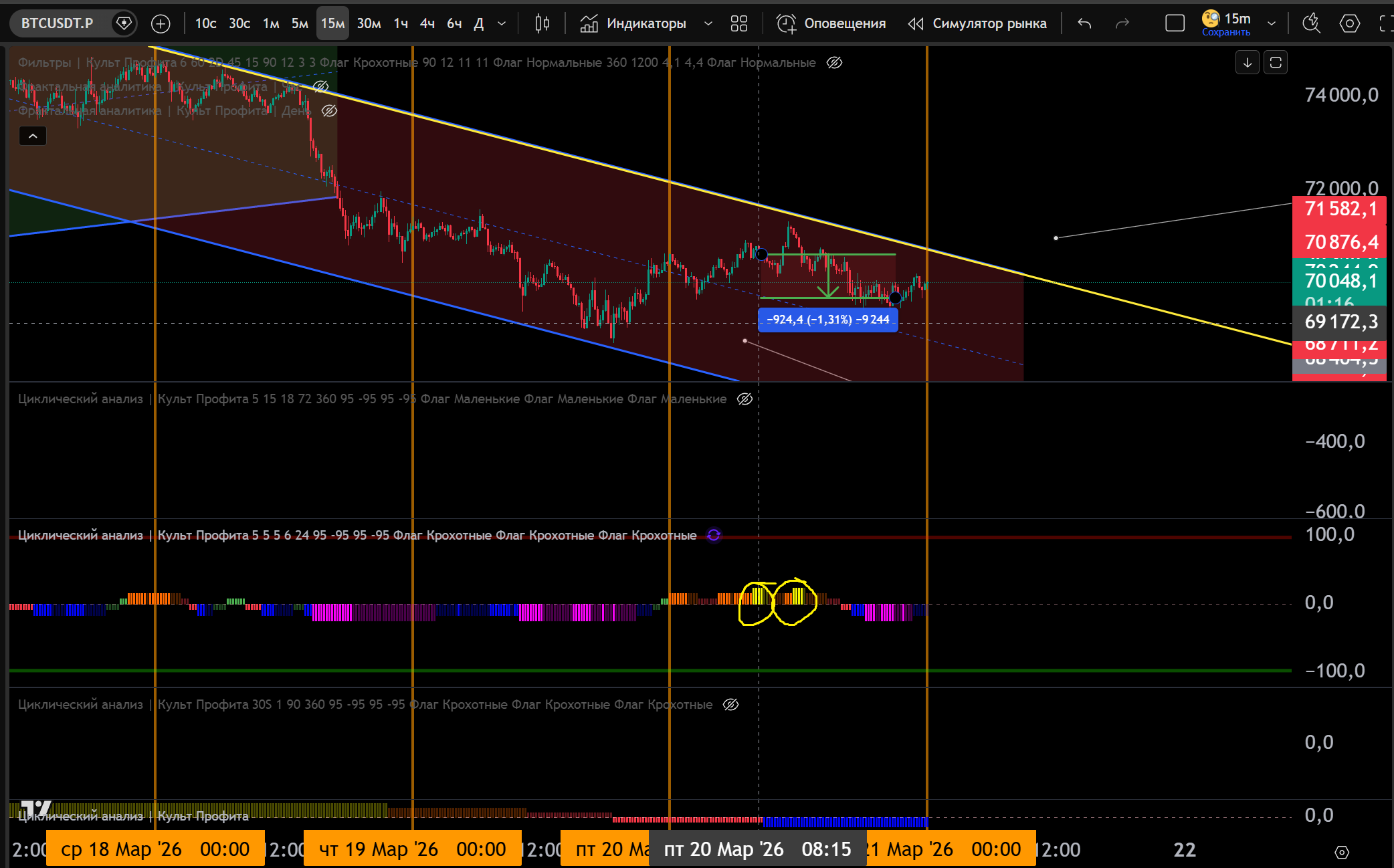 1 Сделка на 15m: 15m канал Шорт, заходим в Шорт от Желтого Хая 5m - 1.3% движения.