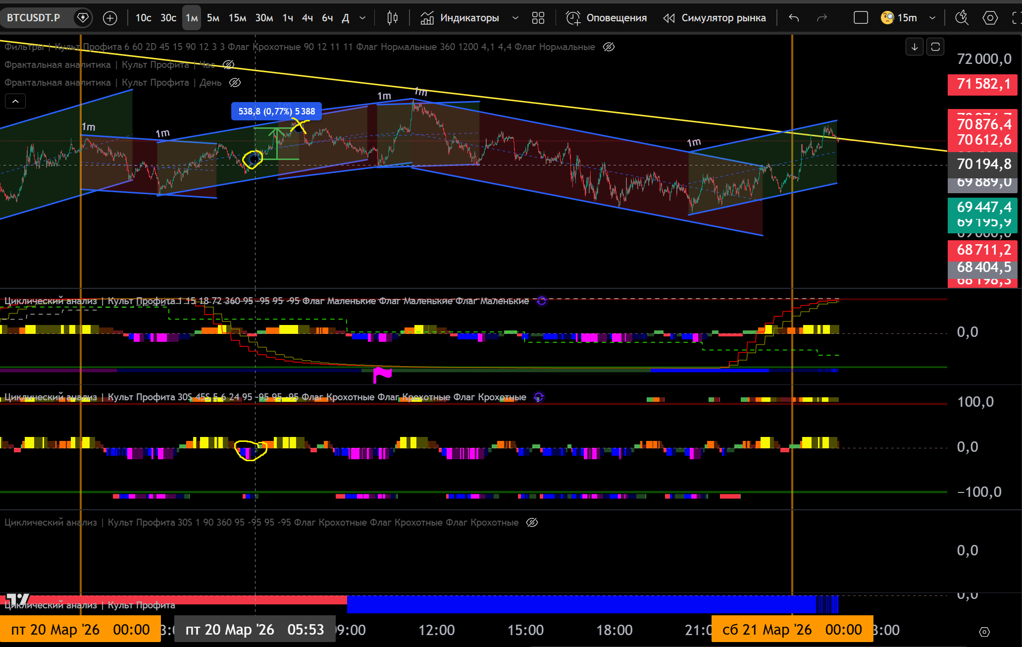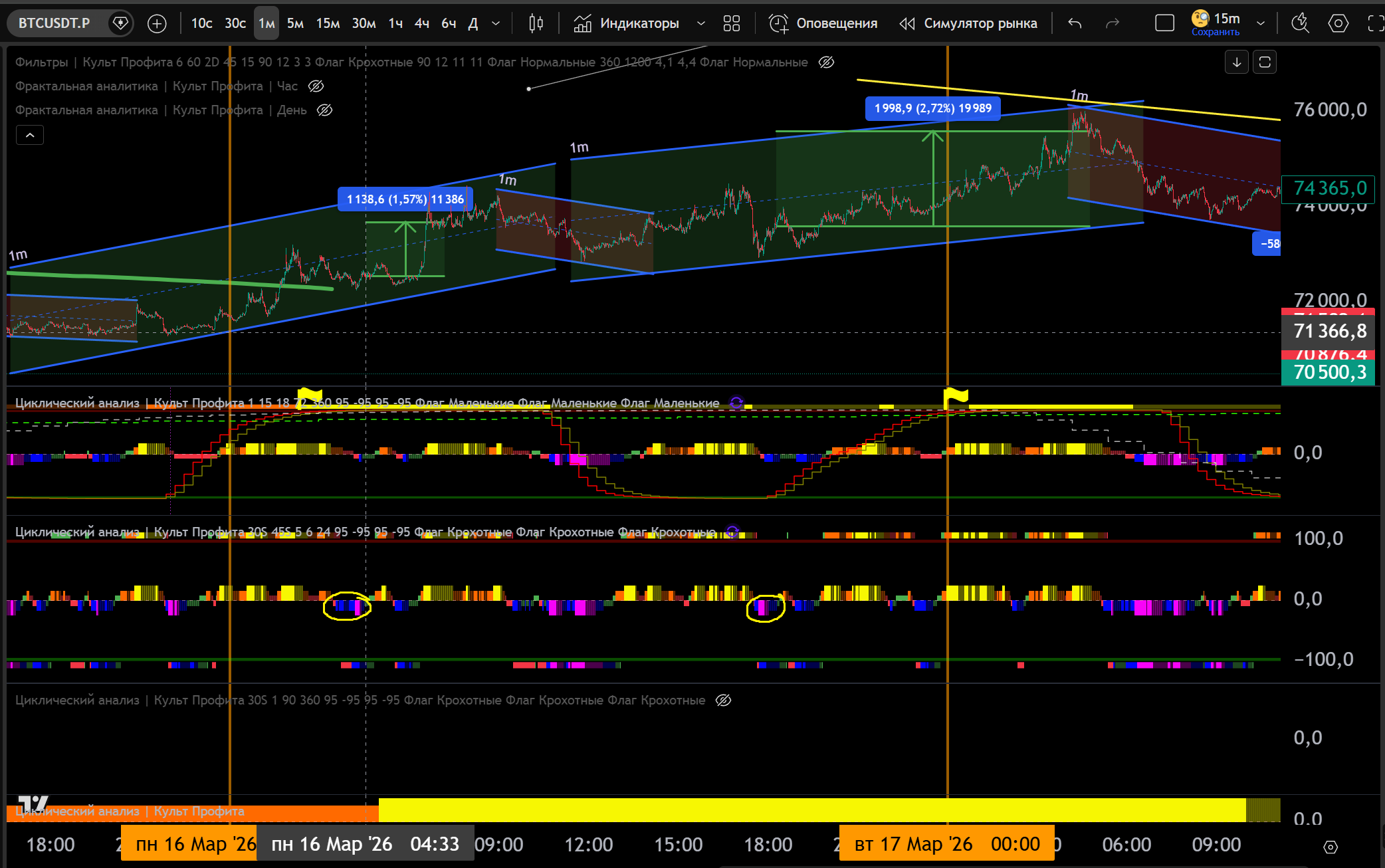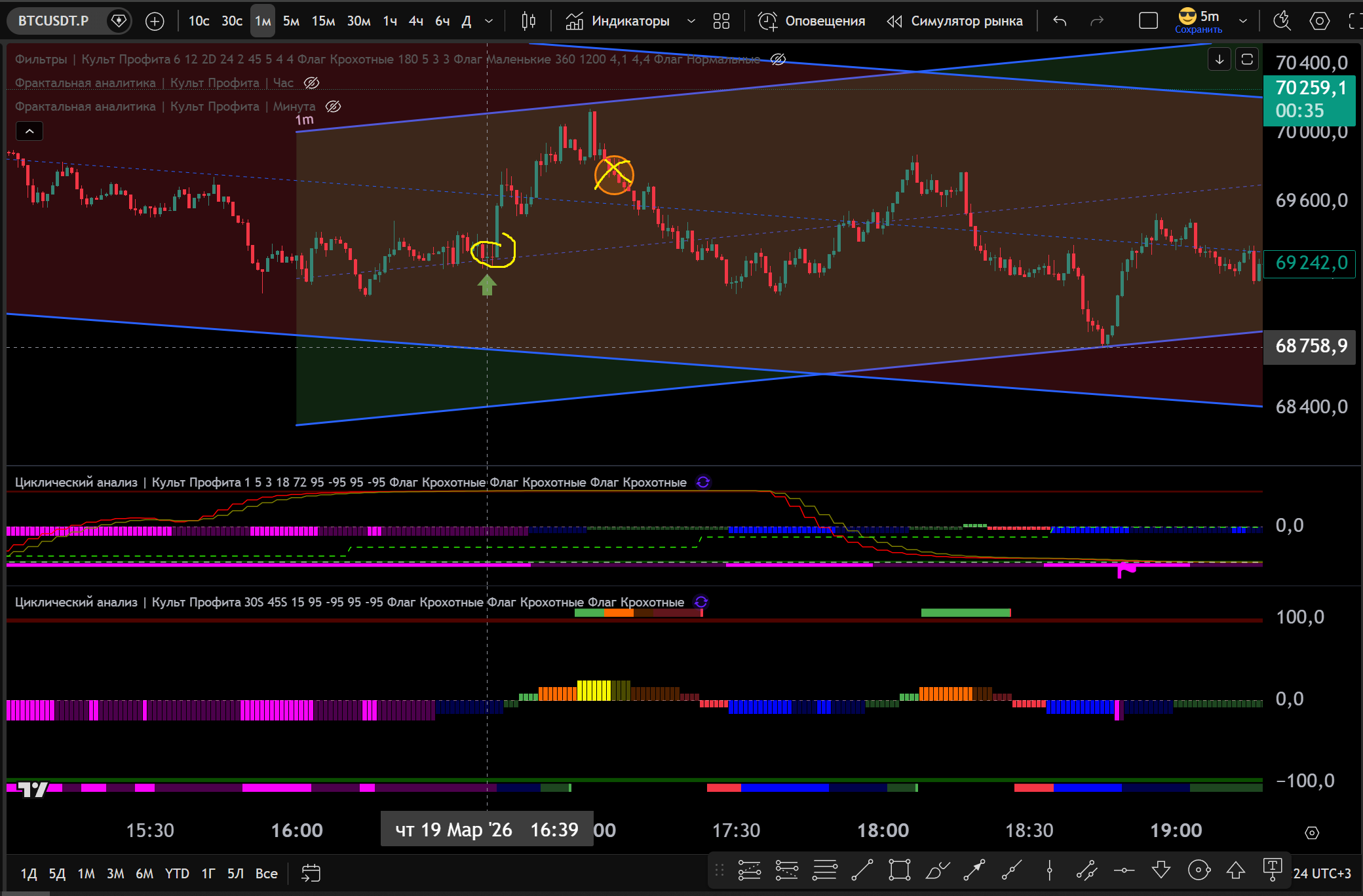 1 Сделка на 1m: 1m канал Лонг, заходим в Лонг от Фиолетового Лоя на 30s, тейк Желтый Хай 1m - 0.7% движения.