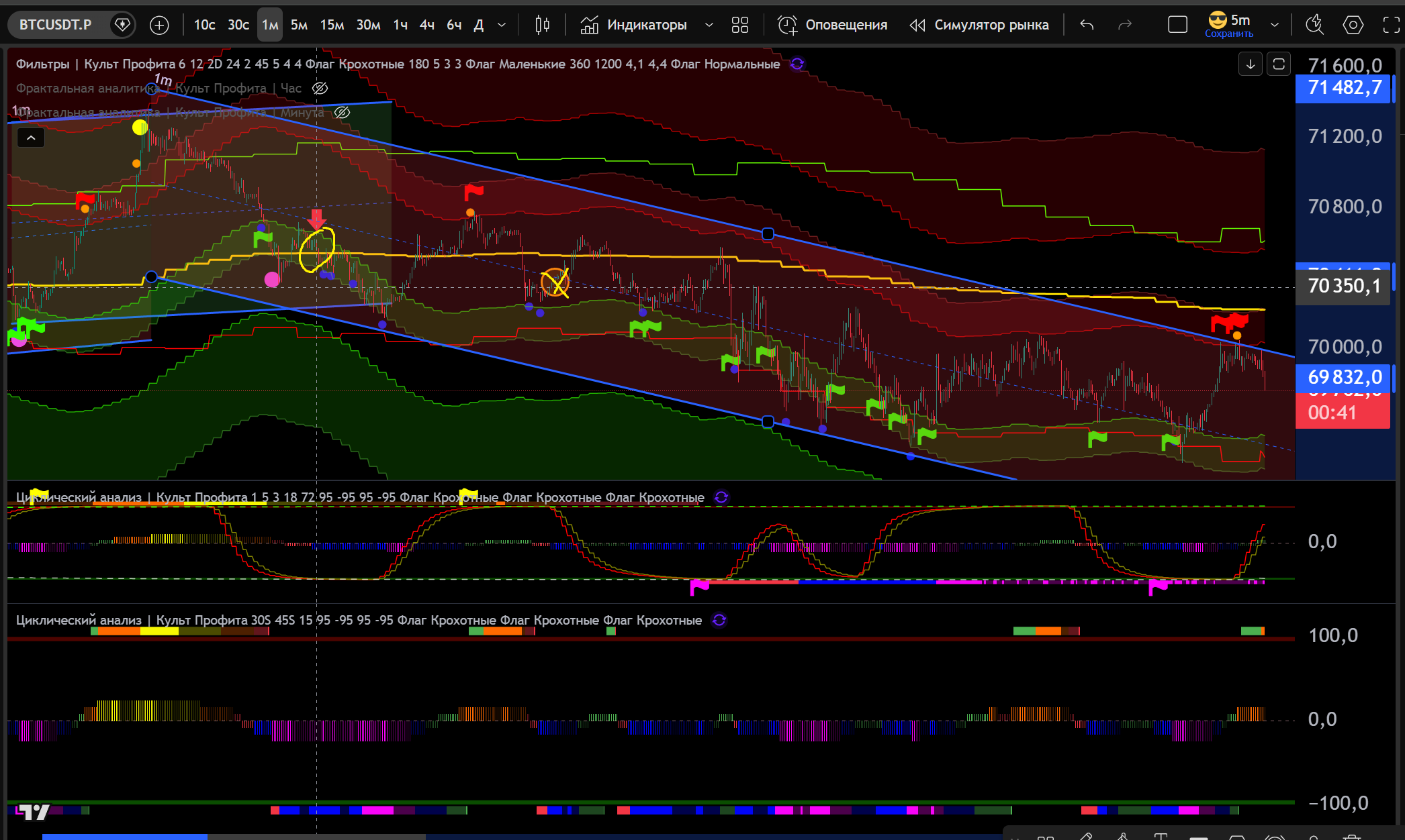 1 сделка 1m Шорт - вход Желтый Хай на 30s - тейк Фиолетовый Лой 1m - 0.7% движения