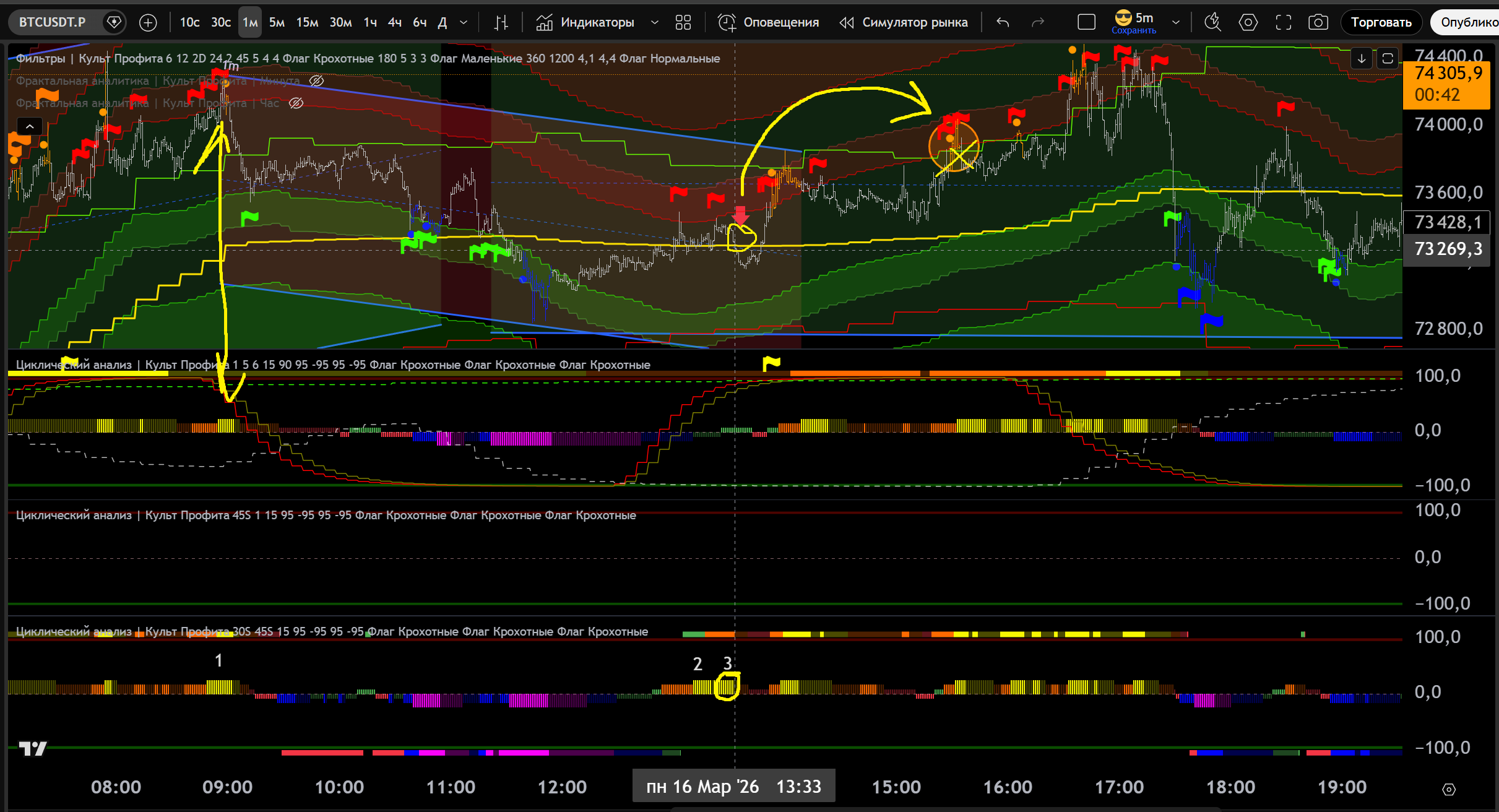 2 сделки на 1m Шорт: вход Желтый Хай на 30s - тейк Фиолетовый Лой 1m - 1,4+1,3 = 2,7% движения