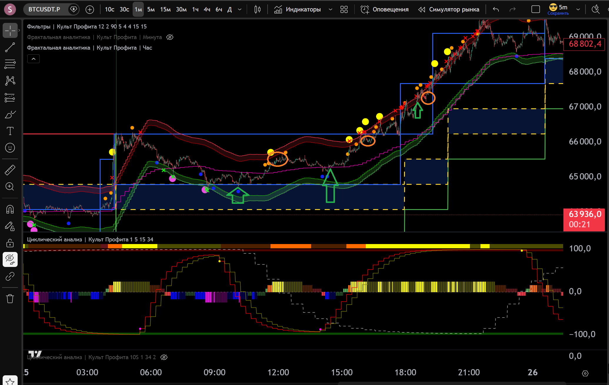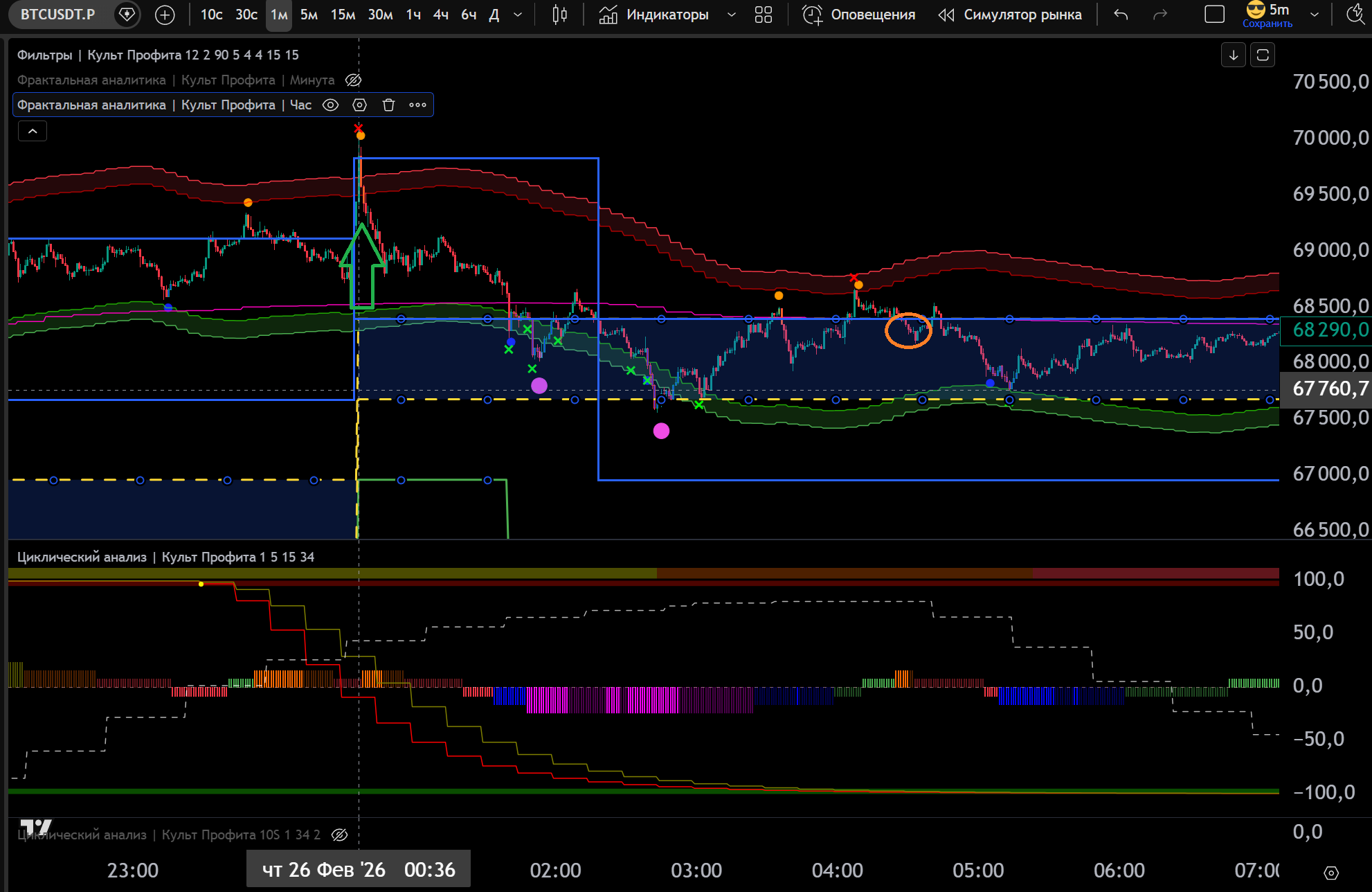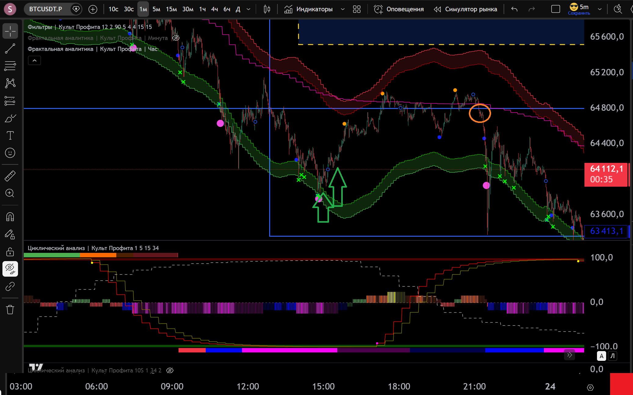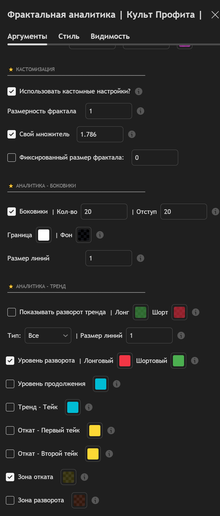 Основное - для вкладки ТФ 5m в индикаторе Фрактальная Аналитика Минута установил множитель 1.786 чтобы видеть боковики покрупнее