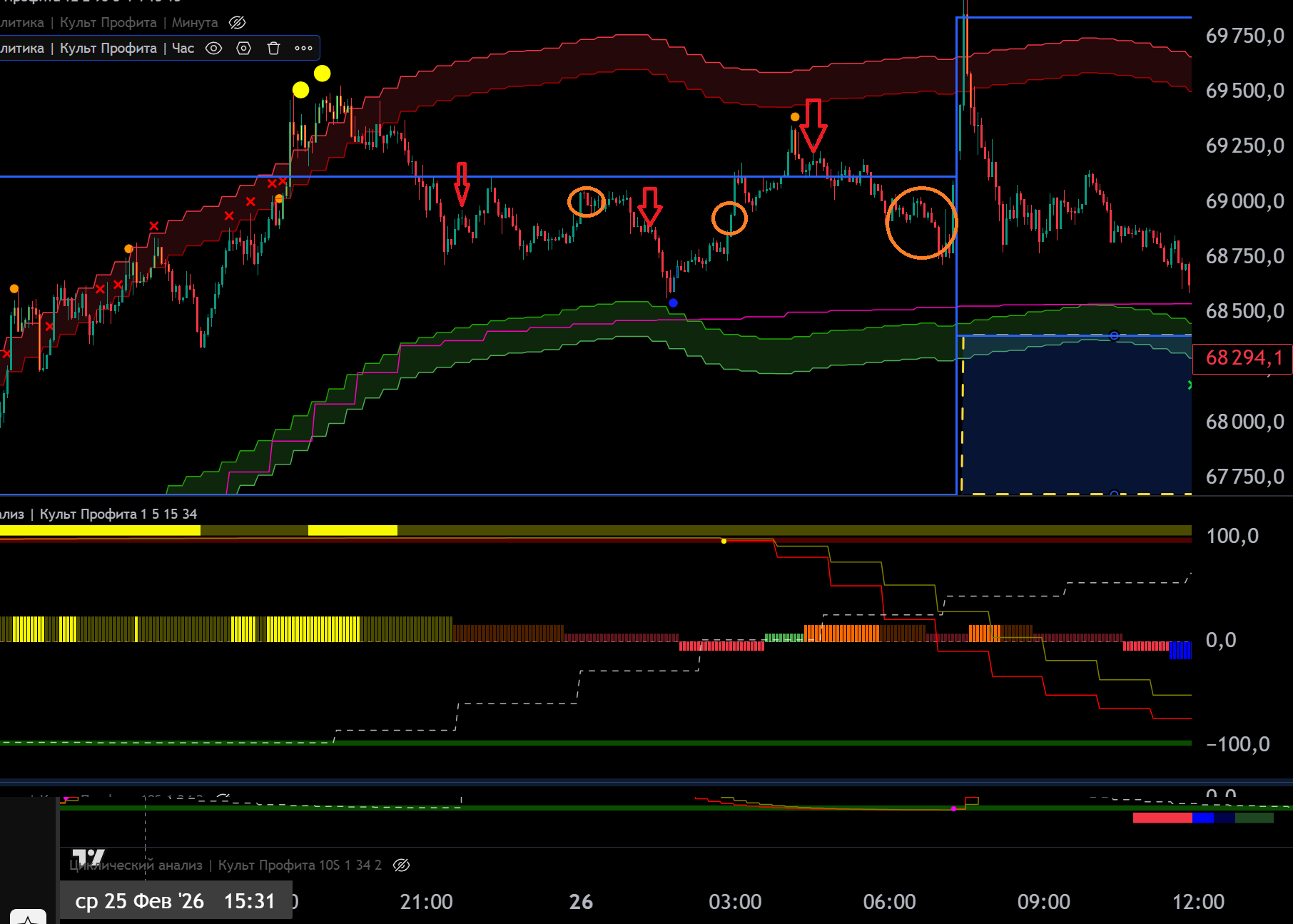 1H Шорт, цена в зоне отката, на 1m зашли в обратно в часовой боковик, Сила пика прошла оранжевая и Линия цикла на хаю - цель нижняя граница 1H боковика