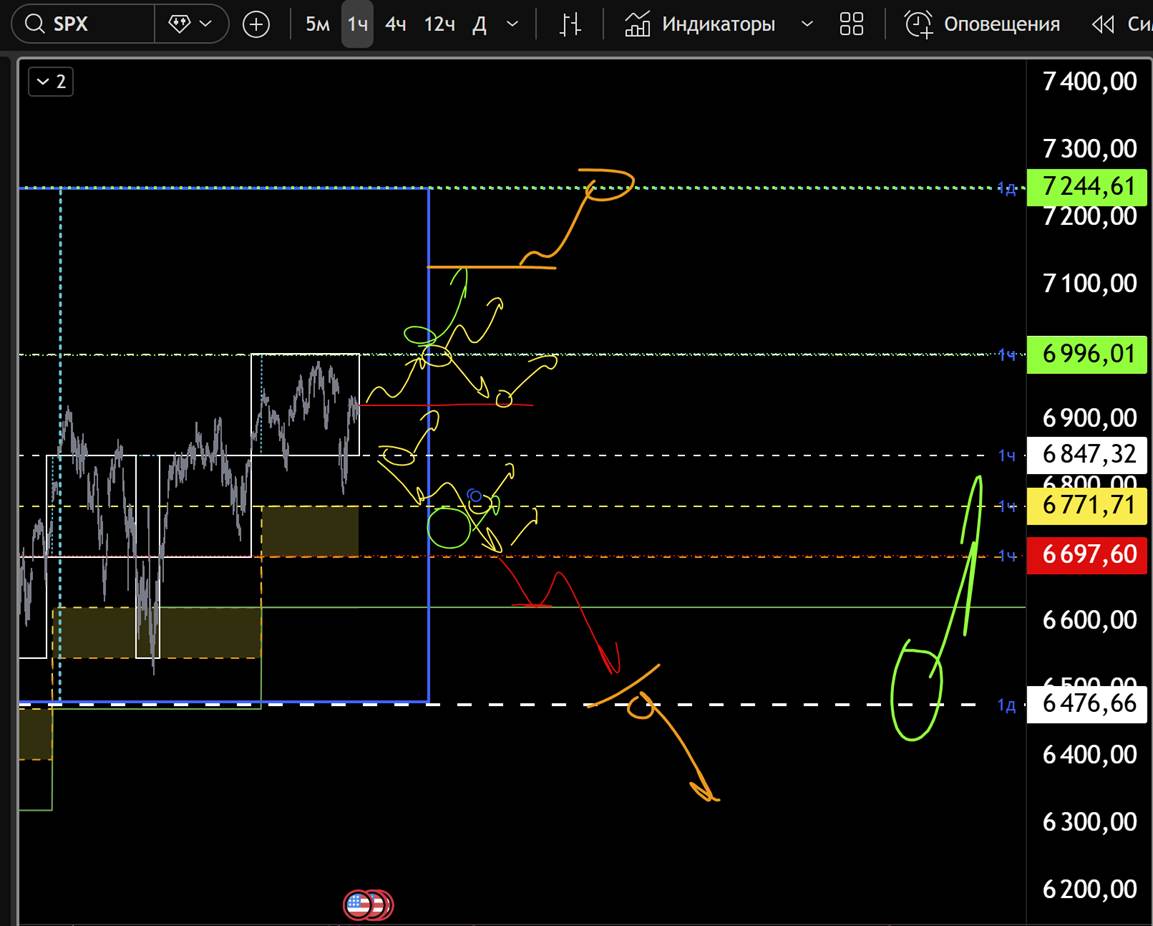 H1–H4: цена торгуется в диапазоне 6847–6996. Работа ведётся от границ боковика. Закрепление выше 6996 открывает потенциал хода к 7124 и 7244. Потеря 6847 — движение к 6704 и тест дневной поддержки.