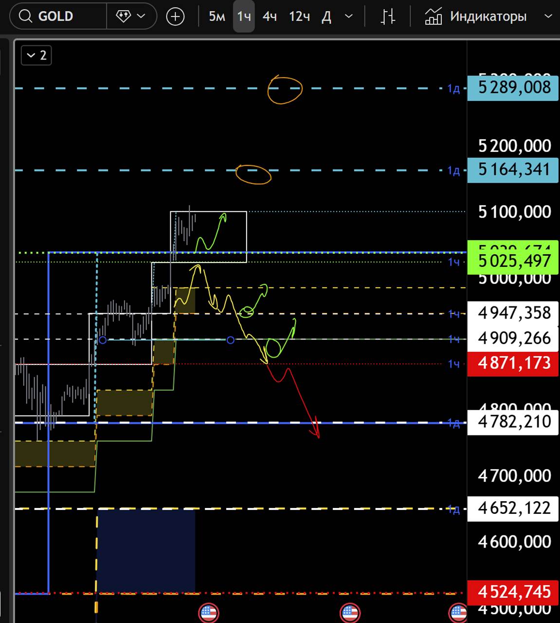 Рабочий диапазон: 5039 - 5164. Верхняя цель импульса — 5289. Коррекционные зоны: 5025, 4947, 4871.