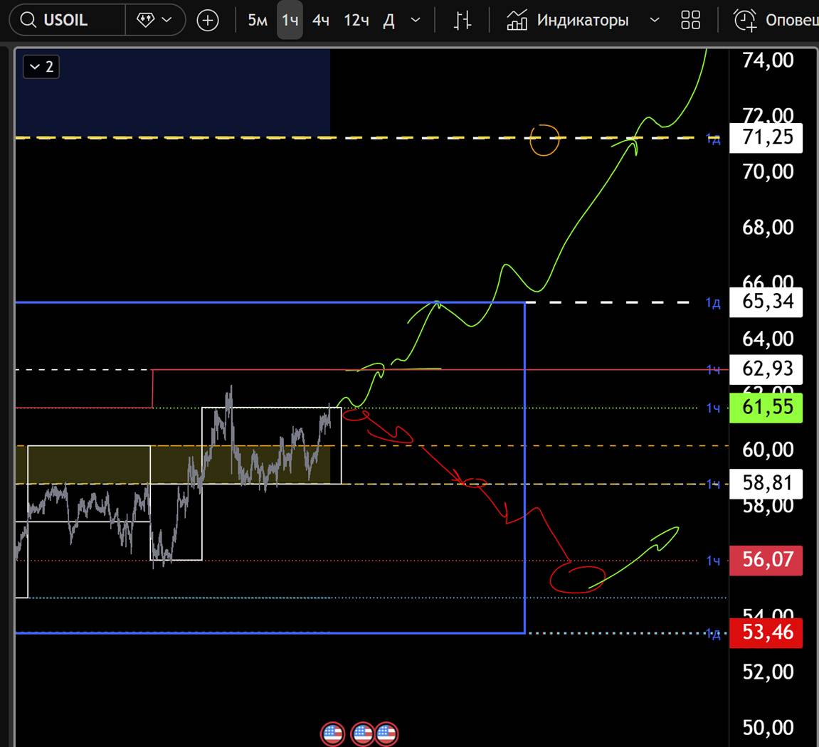 Пока цена ниже 63 — приоритет за продолжением снижения в сторону 58 и 56.07.