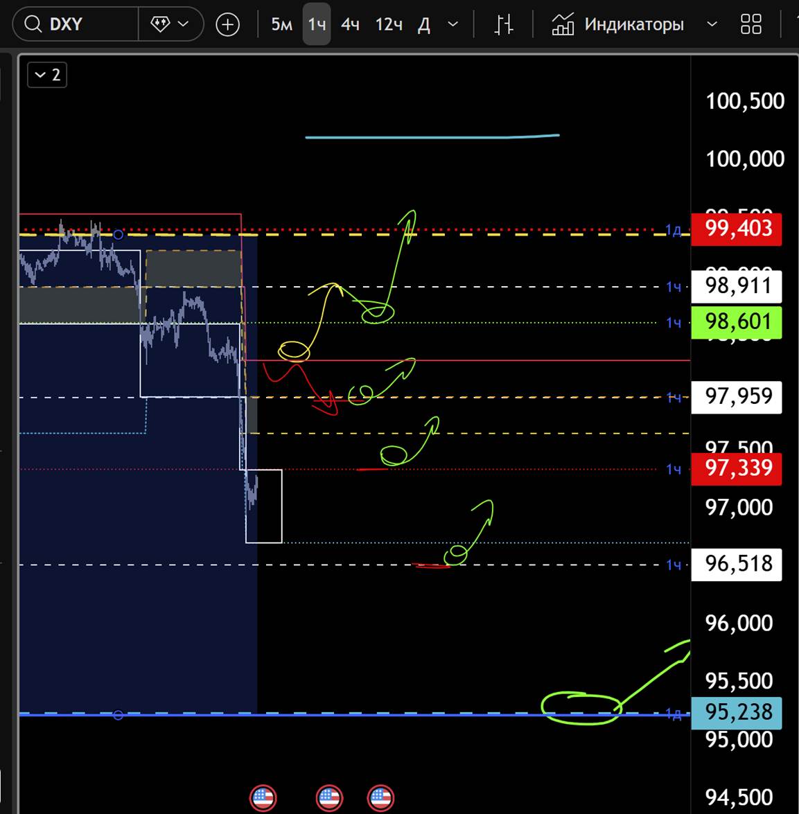 H1: разворот коррекции подтверждается при возврате выше 98. Пока этого не произошло, приоритет — нисходящие движения в диапазоны 96.52, 95.23.