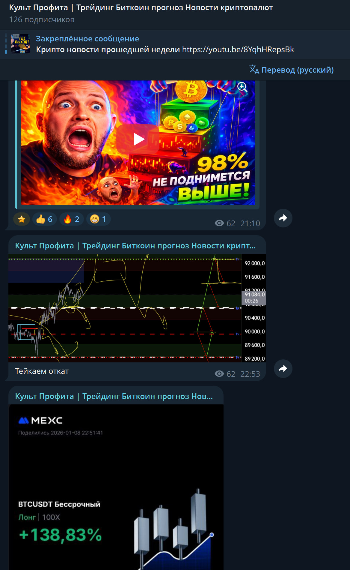 Канал с прогнозами по биткоину растёт медленно: +5 подписчиков. YouTube пока не даёт охватов — уже несколько роликов подряд.