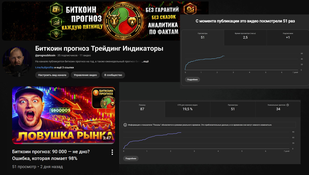 YouTube — аналитика и прогноз цены биткоина на неделю: +5 подписчиков, всего 35