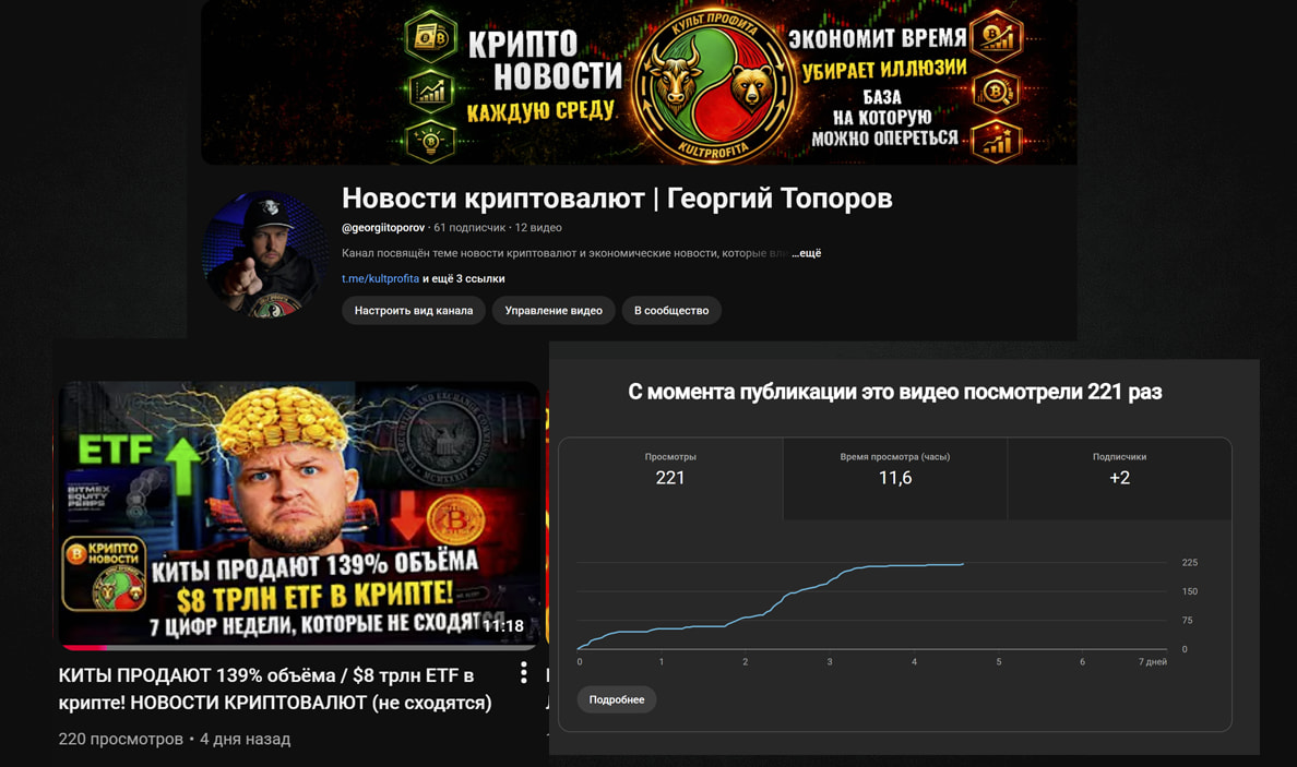 Новостной канал прибавил +11 подписчиков. За неделю вышло одно видео с разбором самых острых новостей крипторынка и моими комментариями.