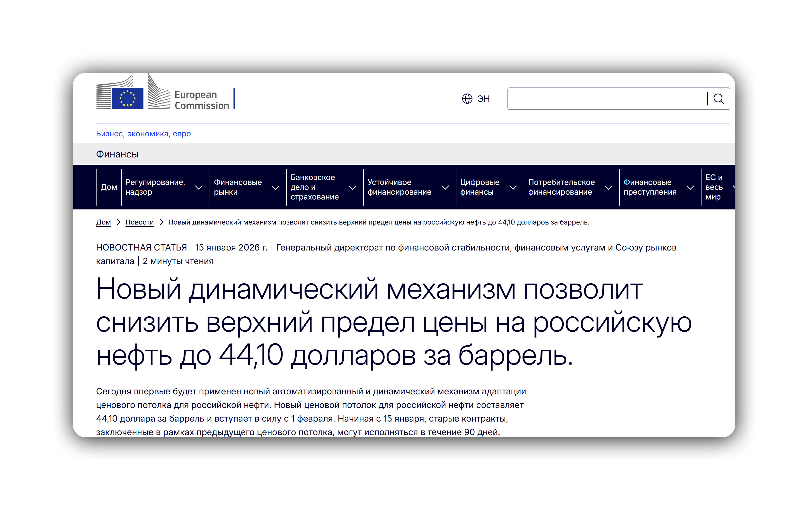 Источник: finance.ec.europa.eu — https://finance.ec.europa.eu/news/new-dynamic-mechanism-lower-price-cap-russian-crude-oil-4410-barrel-410-barrel-2026-01-15_en