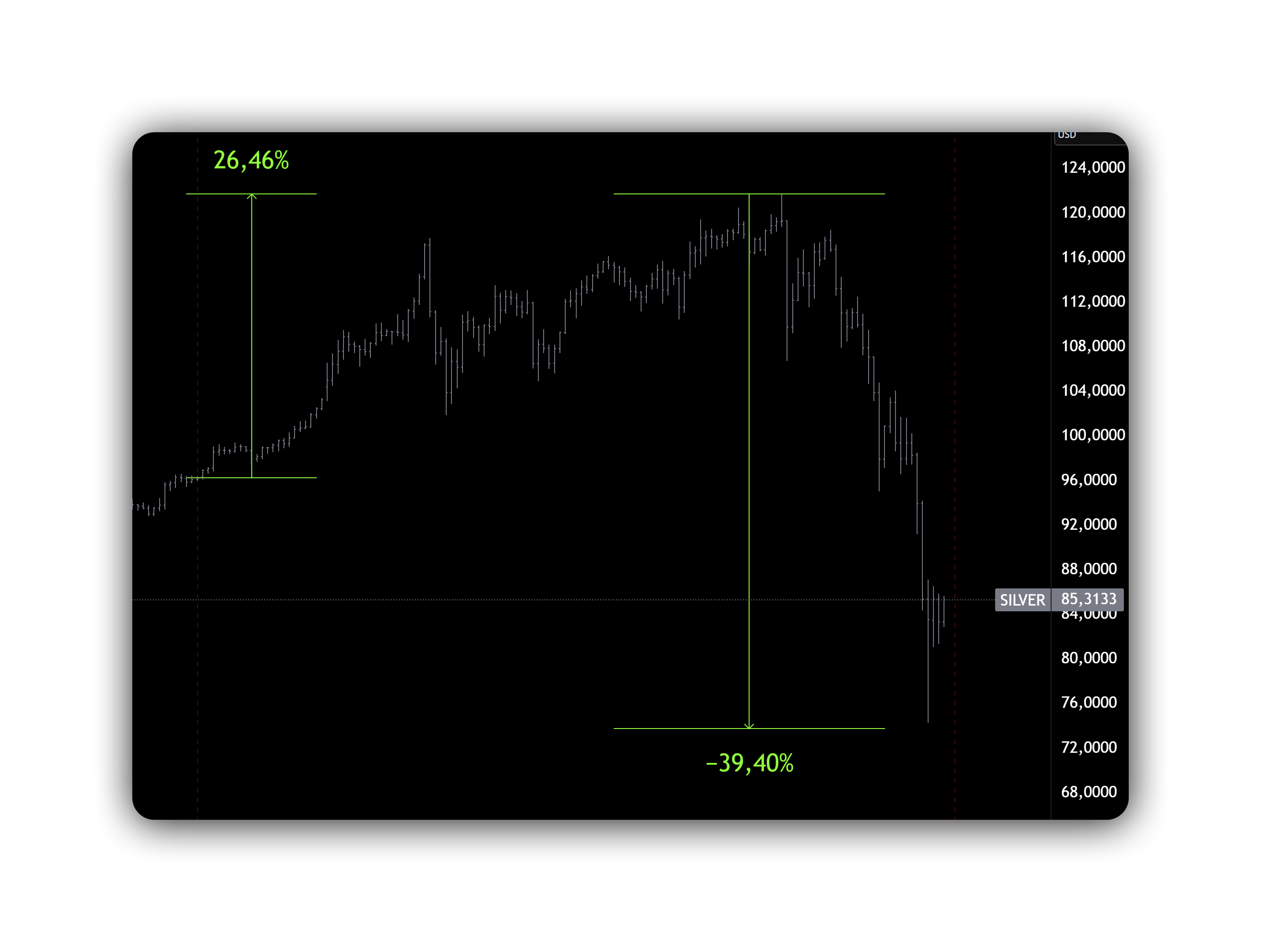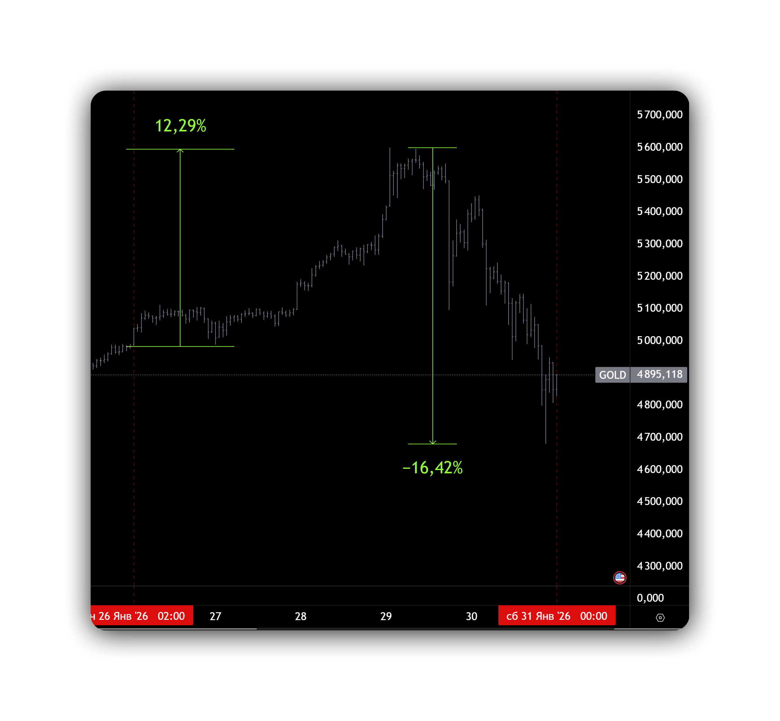 Биржа поднимает маржу на разогретом рынке, это почти всегда ловушка для толпы: «я прав по тренду» не спасает, если тебя вынуждают закрыться по маржин-коллу. Для золота эффект косвенный, но логика одинаковая: драгметаллы были перегреты, а теперь рынок чистит «лишний» риск. На графике это обычно заканчивается не V-образным отскоком, а волнами: отскок — распродажа — попытка второго дна.