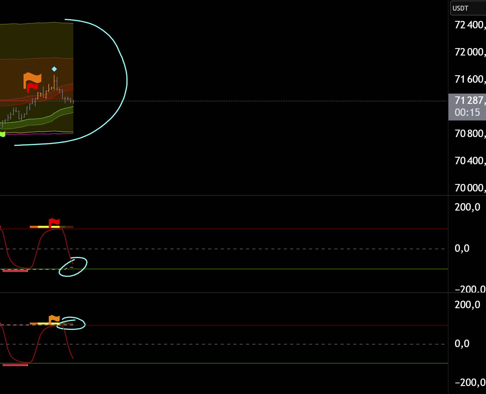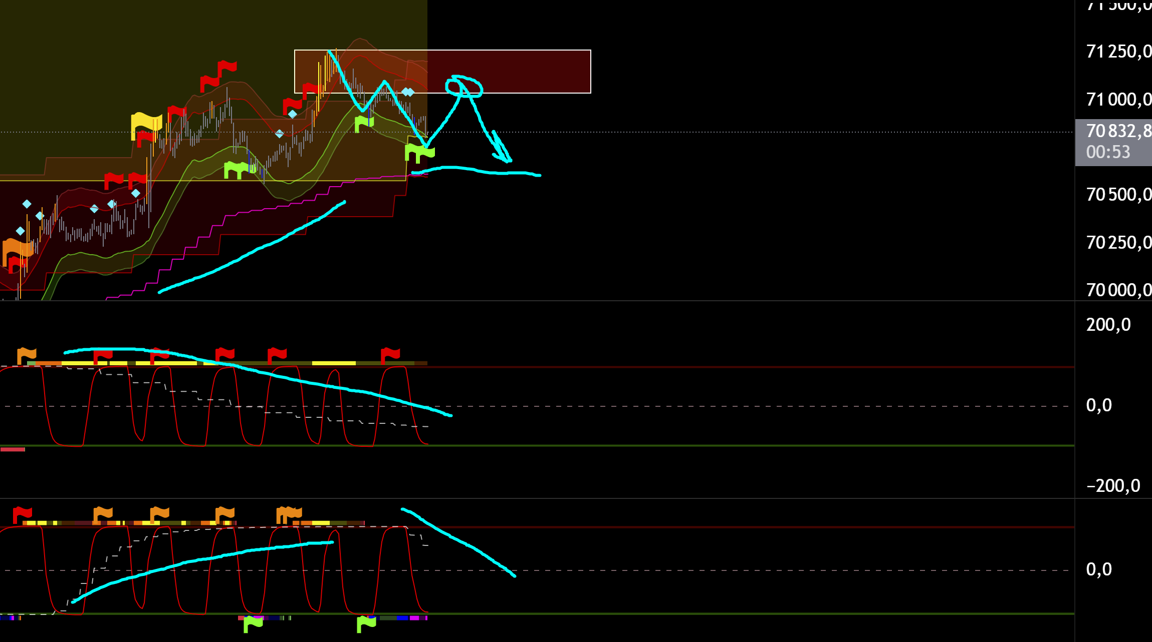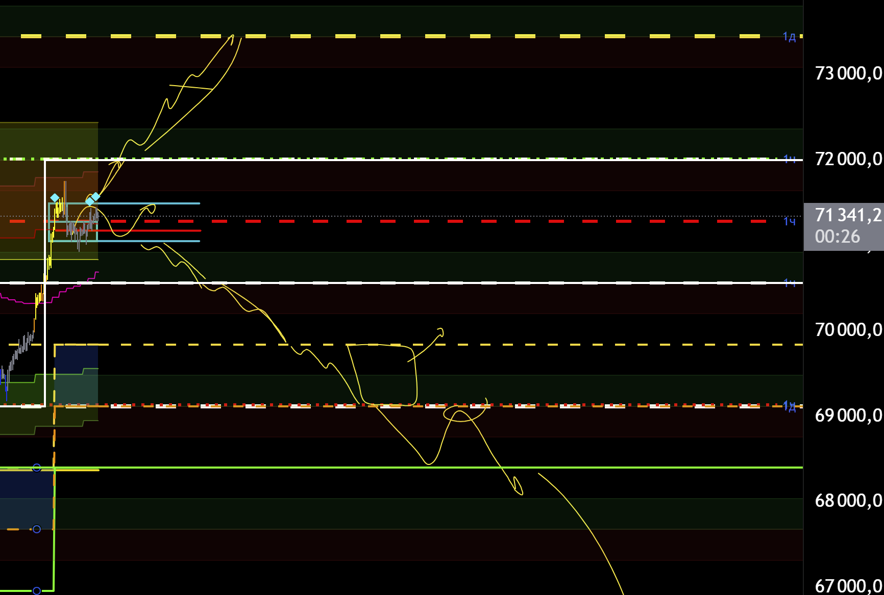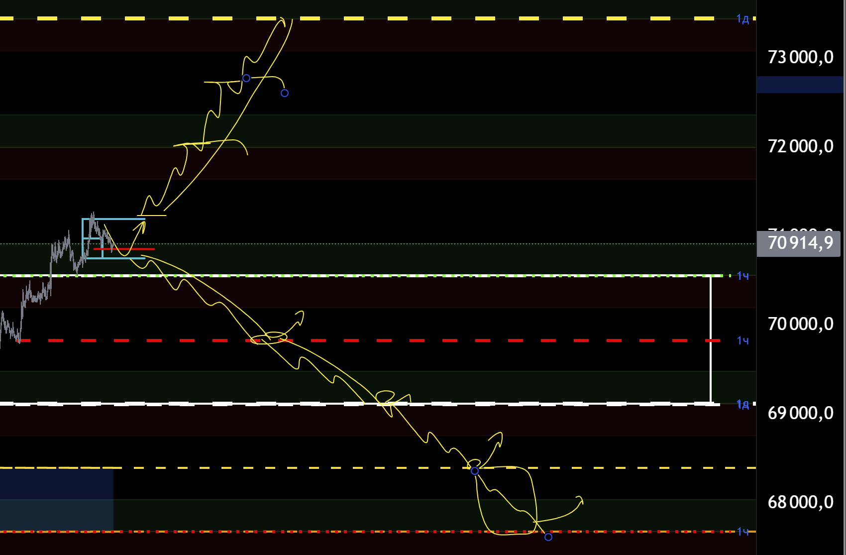 Взяли перехай. В целом перспектива отката есть часов до 22:00. Если рассматривать цикичность. Но снизу уже более серьезная зона поддержки в виде отката и дневной граница 69-70000. Промежуточные 70500 - 69800.