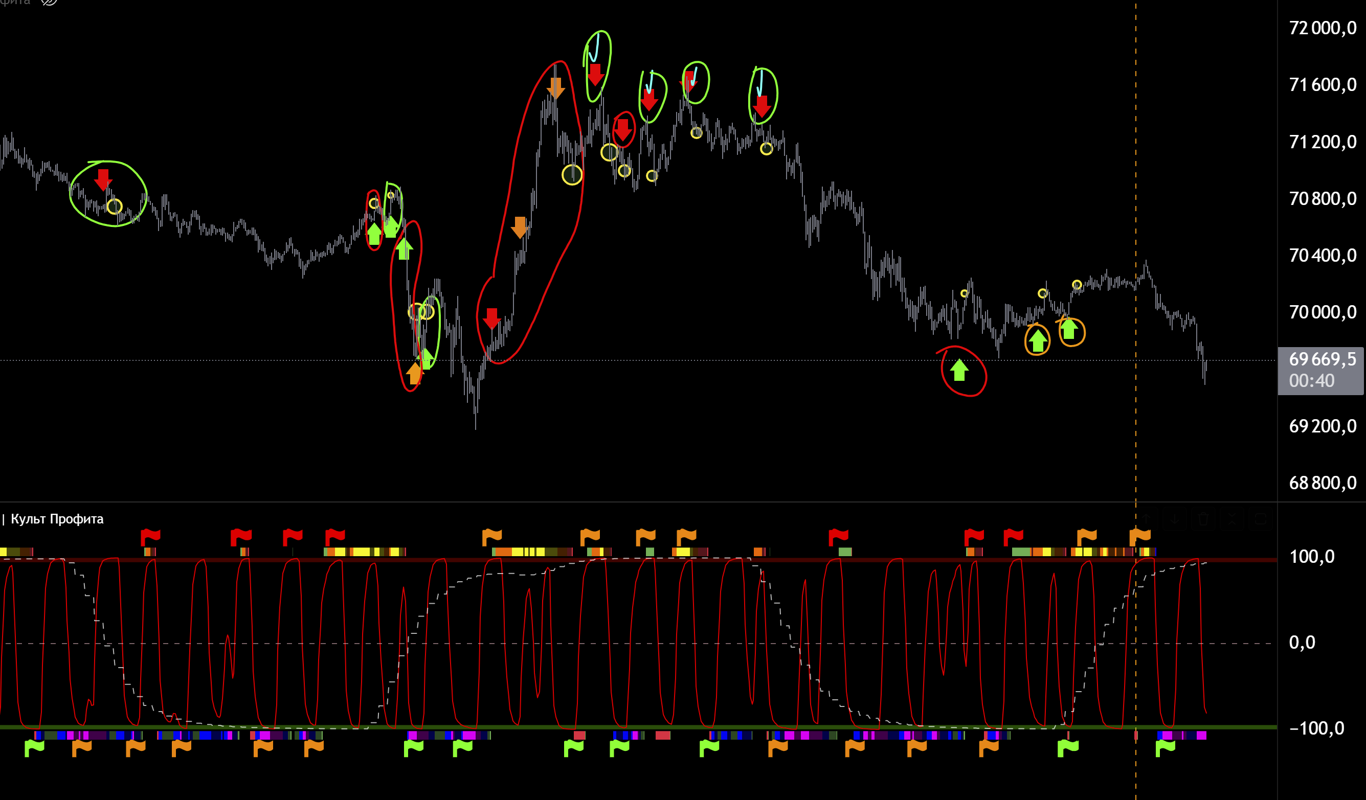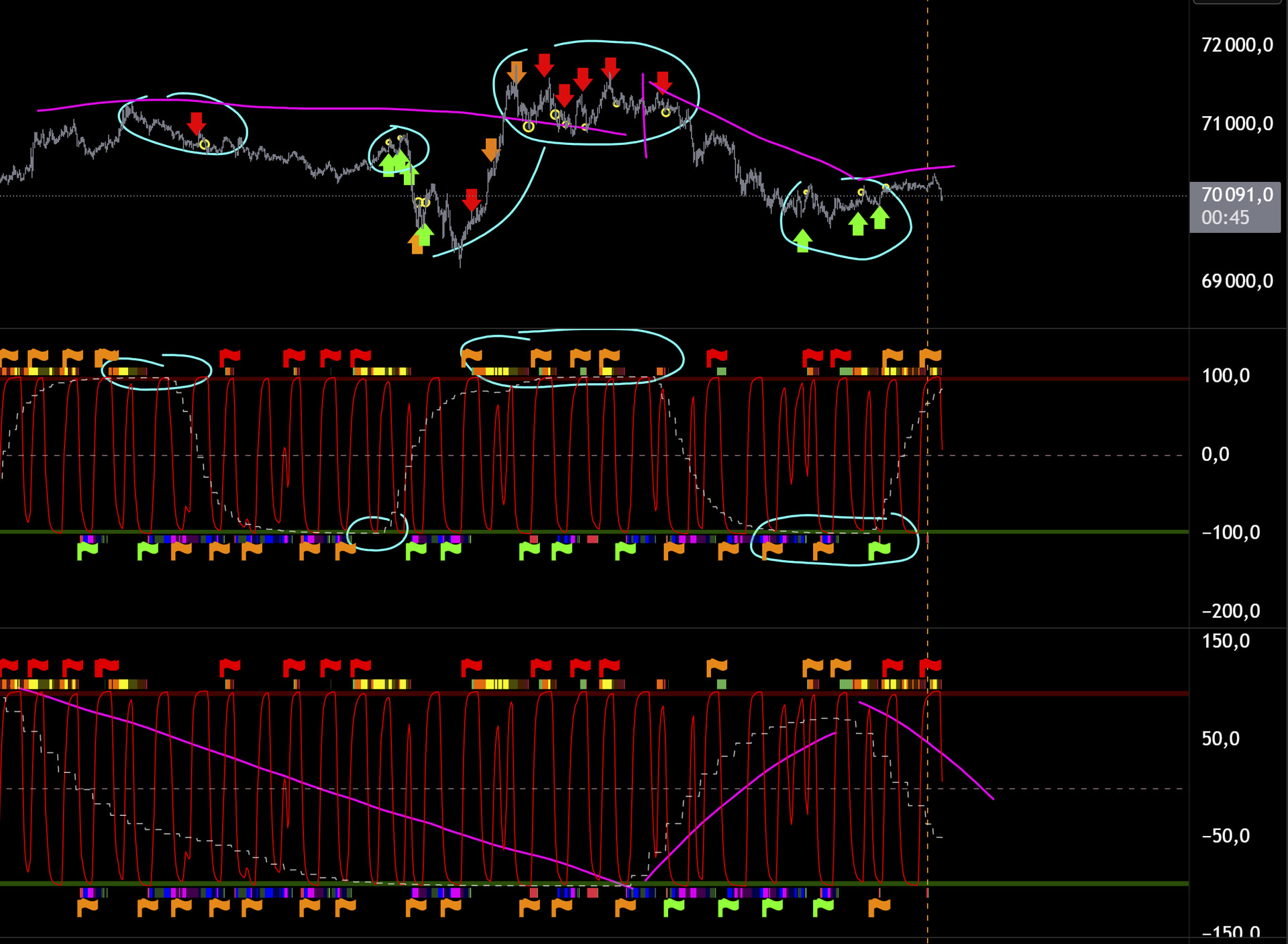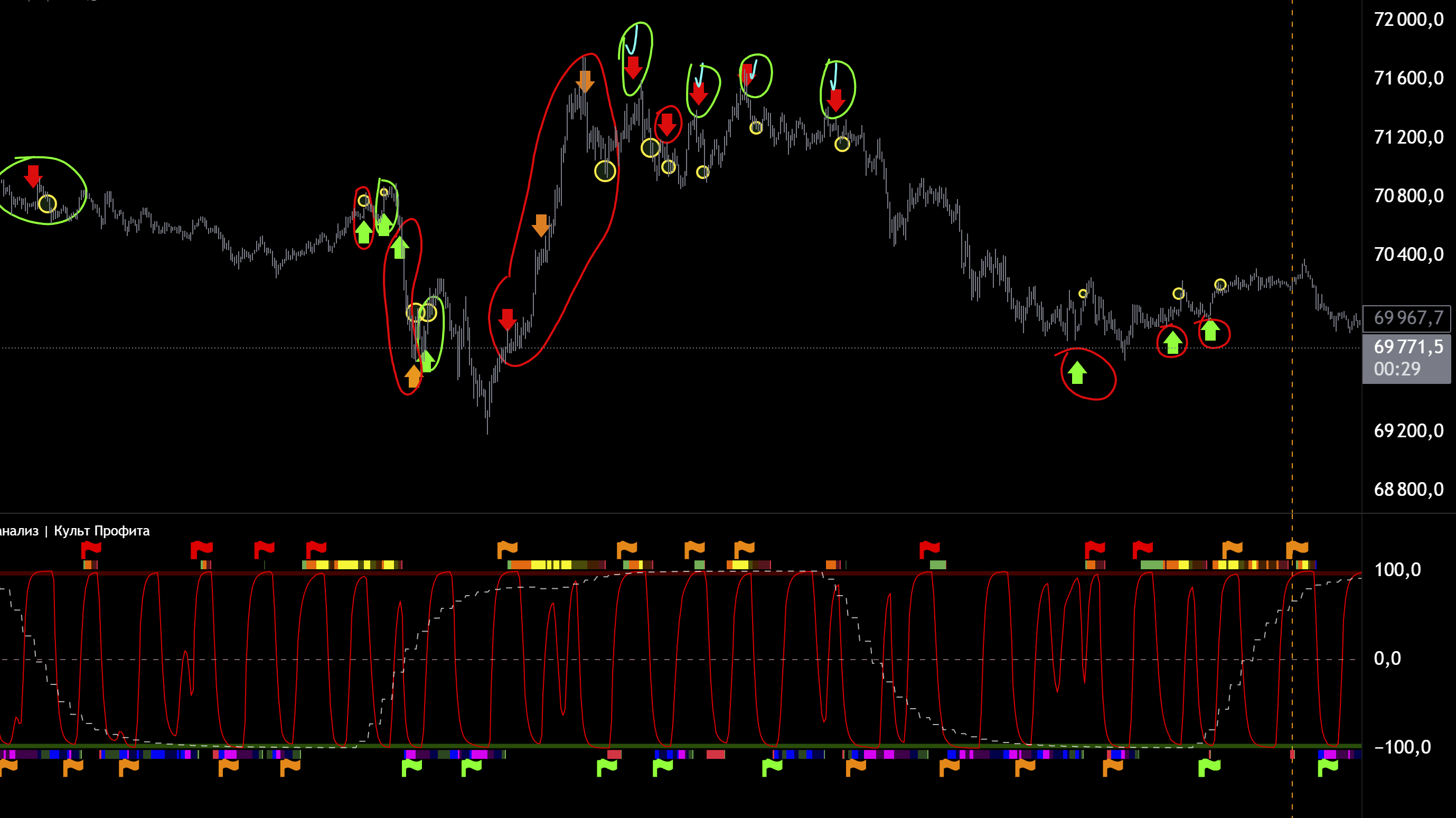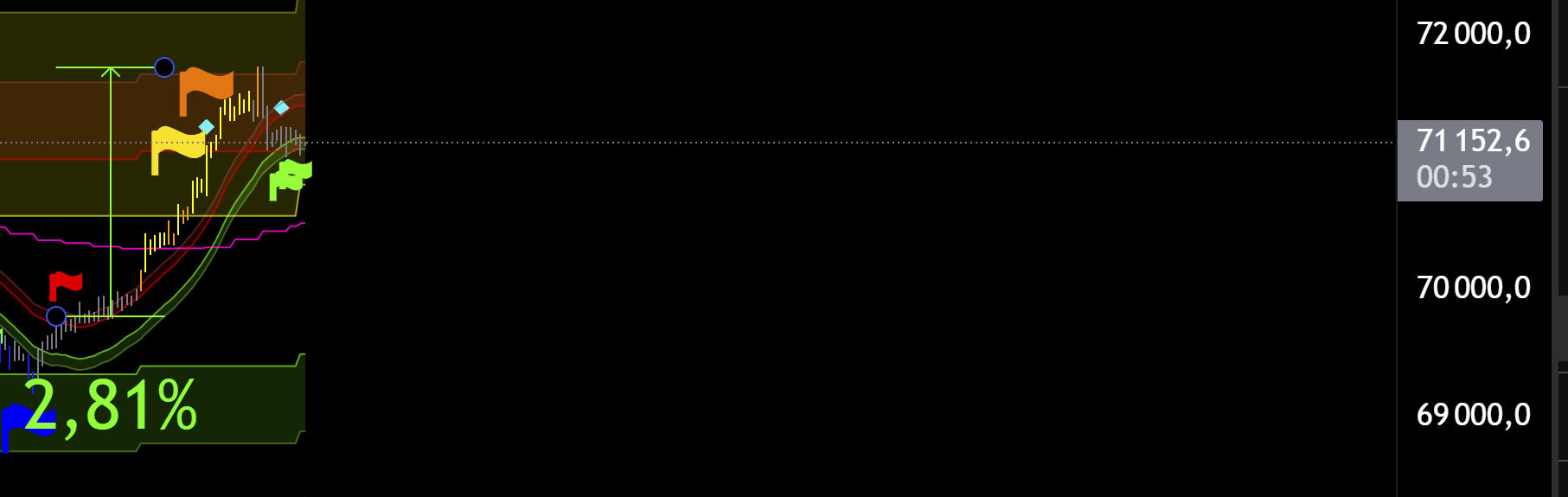 Взяли перехай. В целом перспектива отката есть часов до 22:00. Если рассматривать цикичность. Но снизу уже более серьезная зона поддержки в виде отката и дневной граница 69-70000. Промежуточные 70500 - 69800.