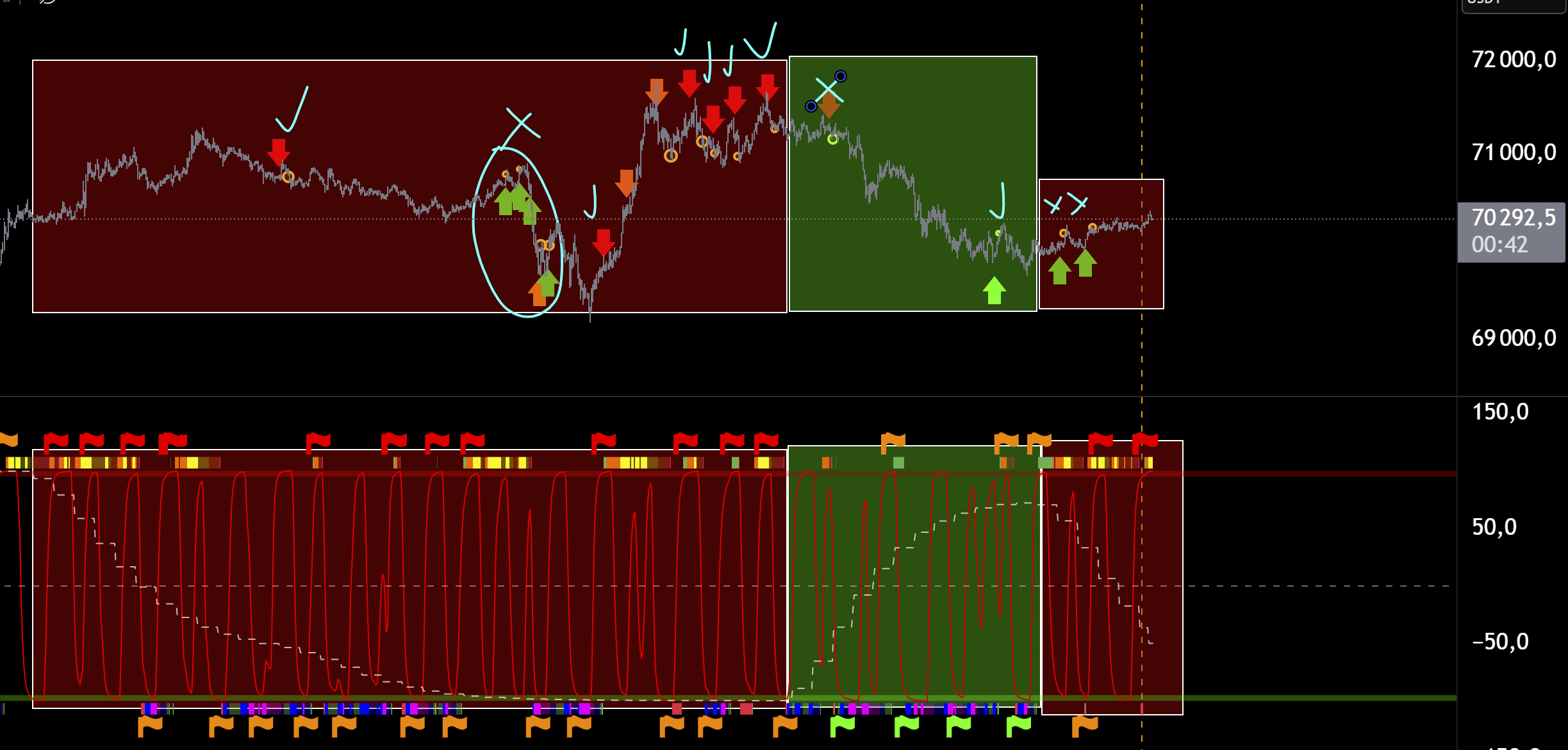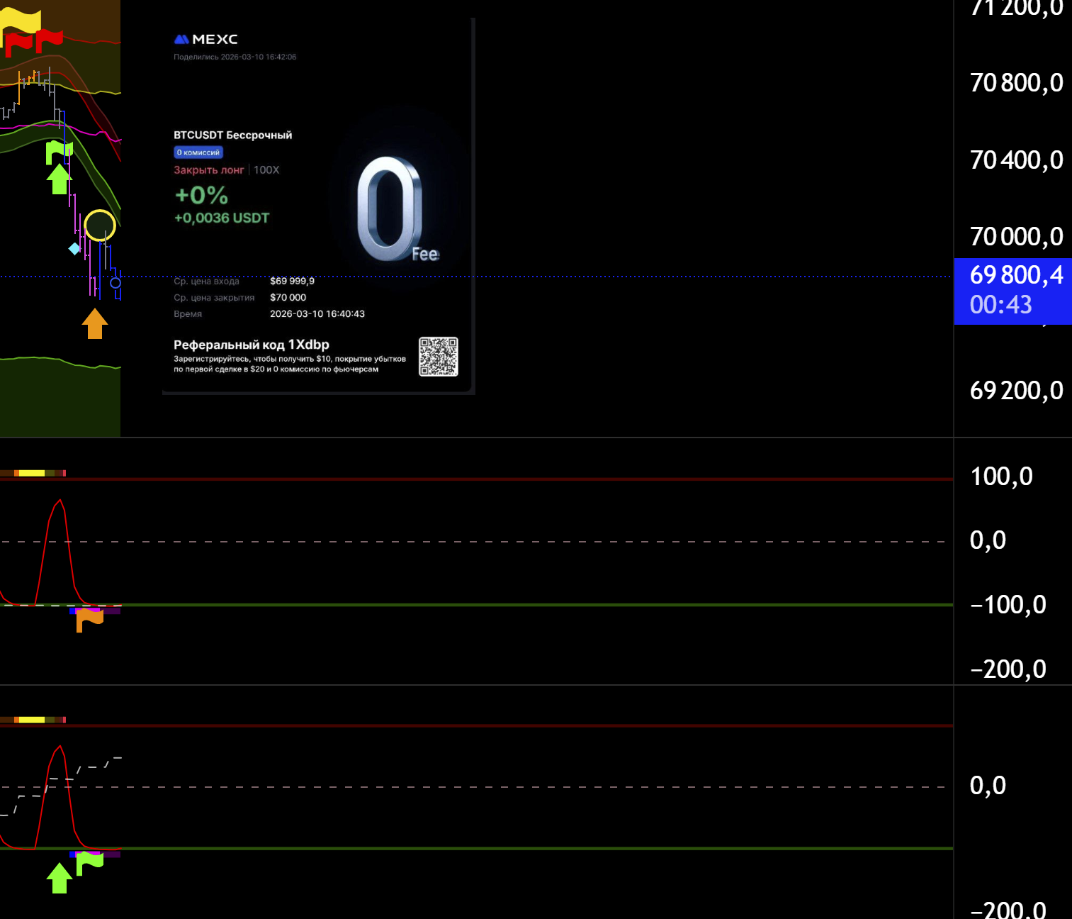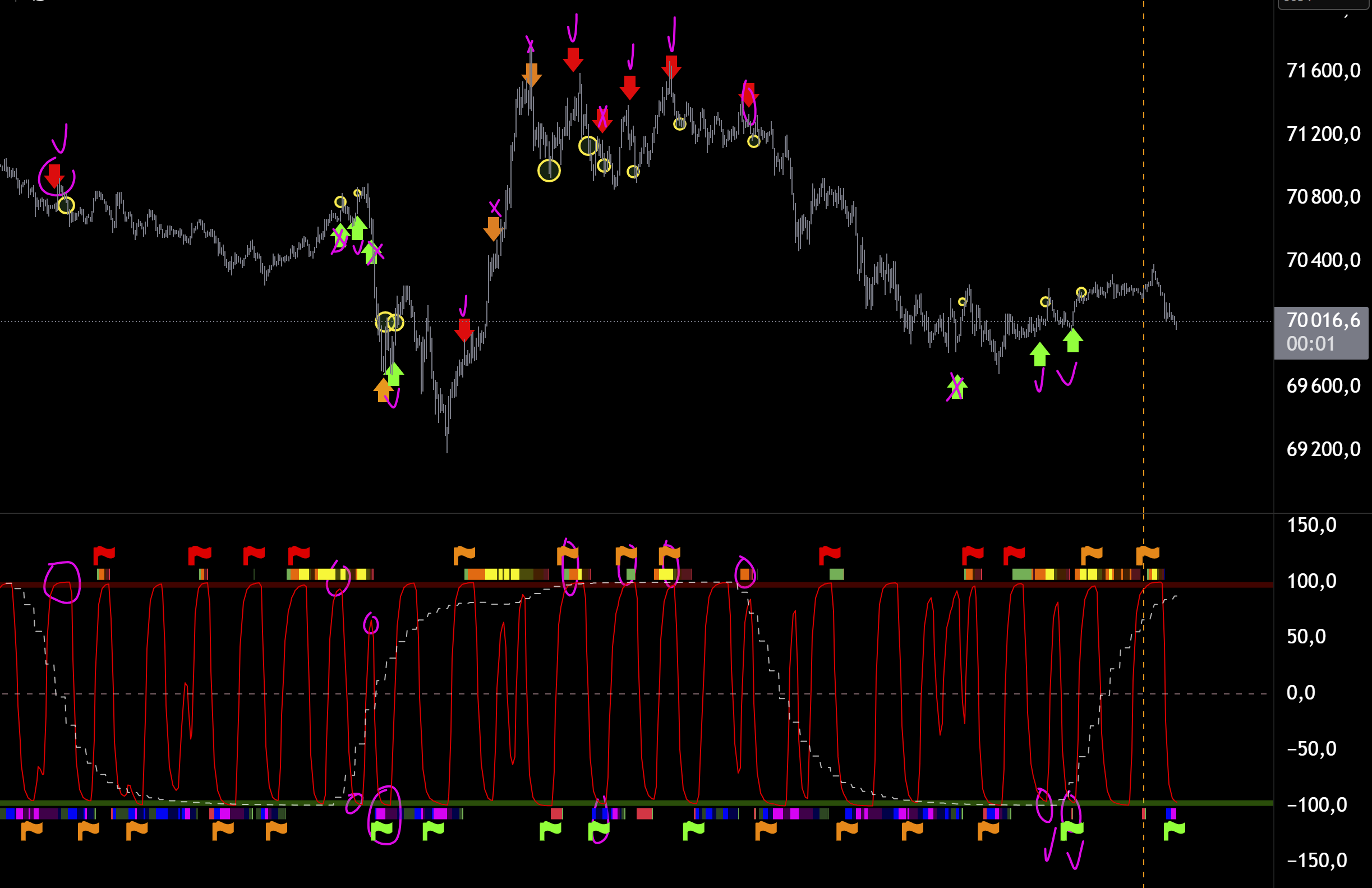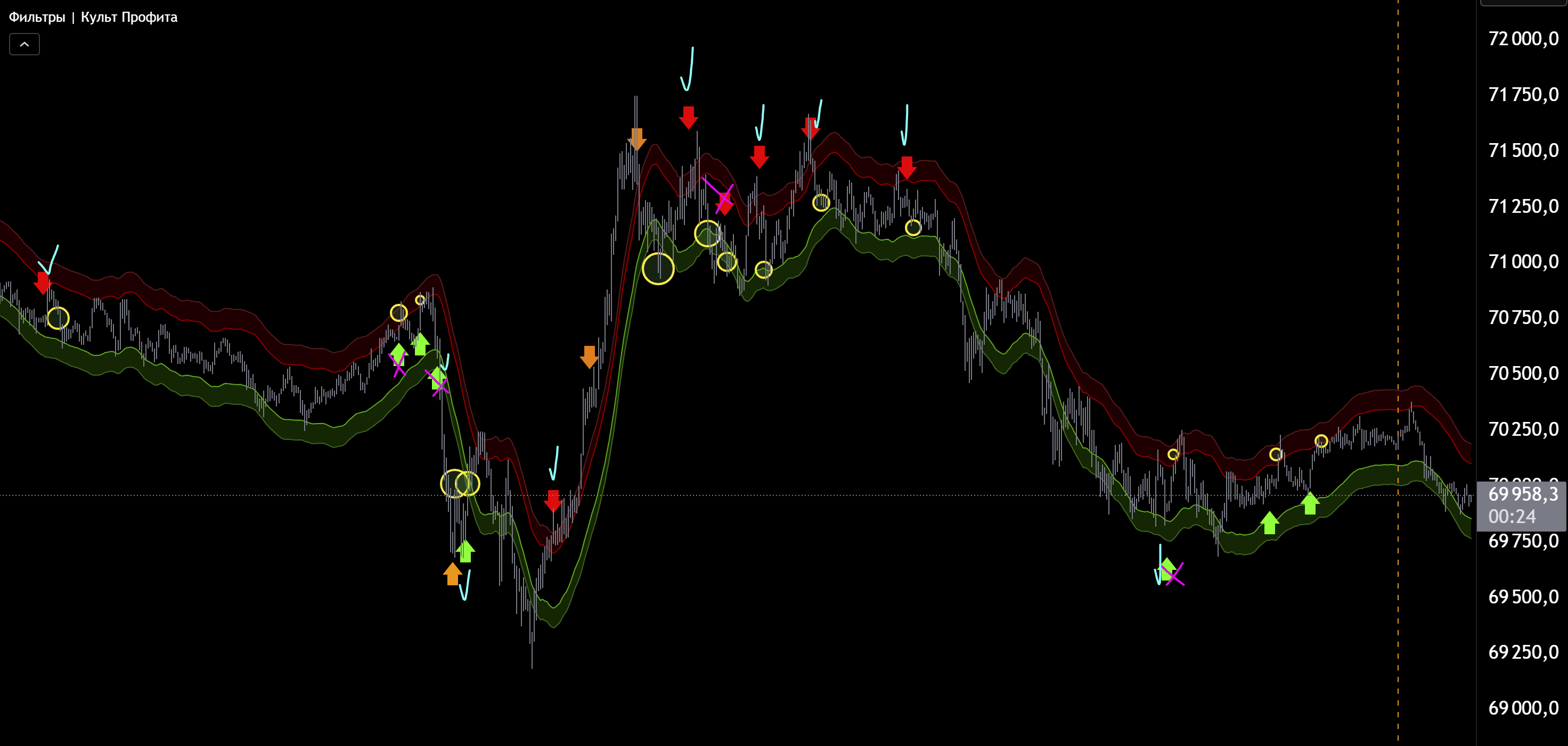 Взяли перехай. В целом перспектива отката есть часов до 22:00. Если рассматривать цикичность. Но снизу уже более серьезная зона поддержки в виде отката и дневной граница 69-70000. Промежуточные 70500 - 69800.