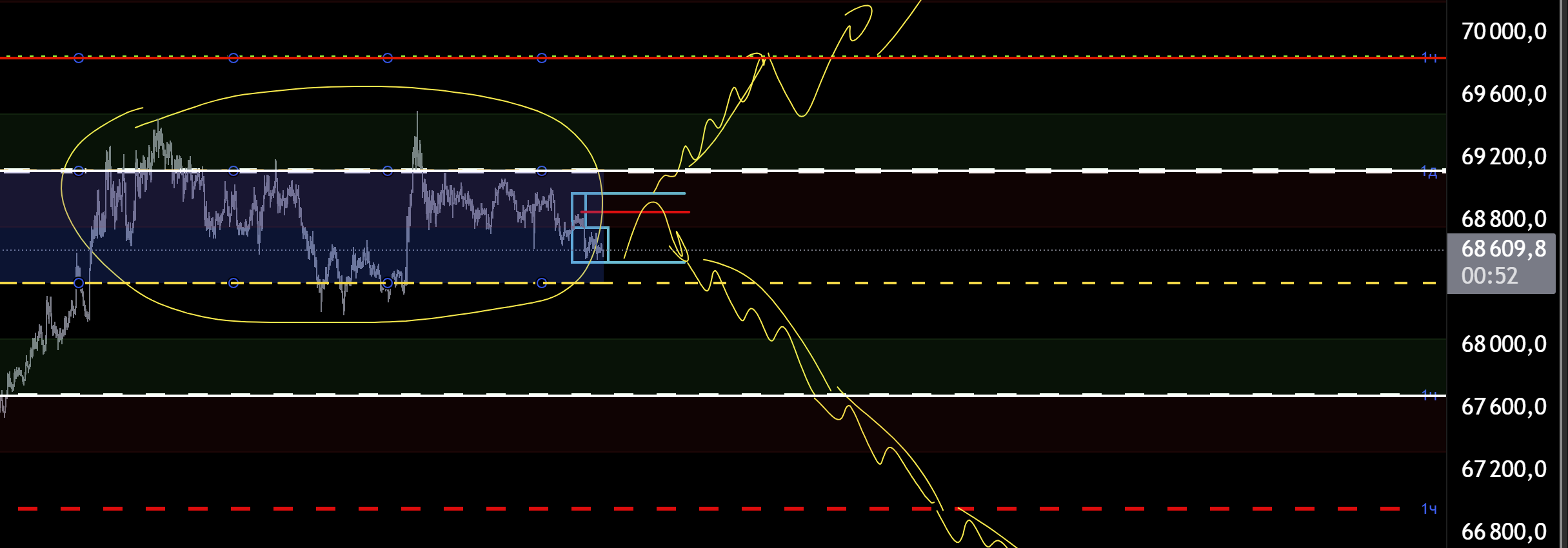 Мы по прежнему на хаях. Пока что в приоритете продолжения шорта. Для этого надо пробивать ниже 68400. Но если мы так постоим и получим плоскую коррекцию, то может и начать уходить выше. Вообщем формируем мясо для движения.