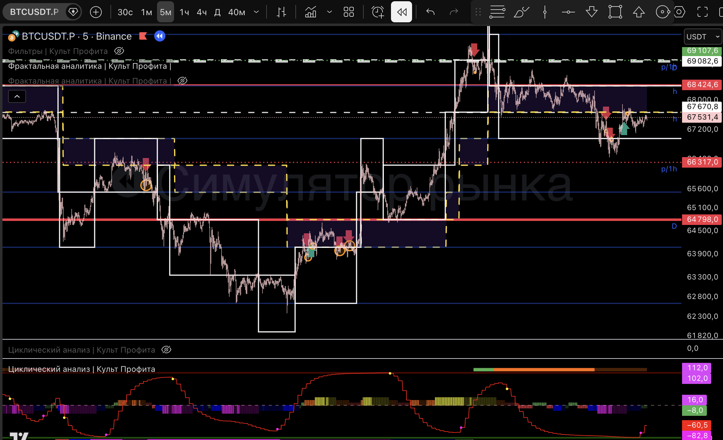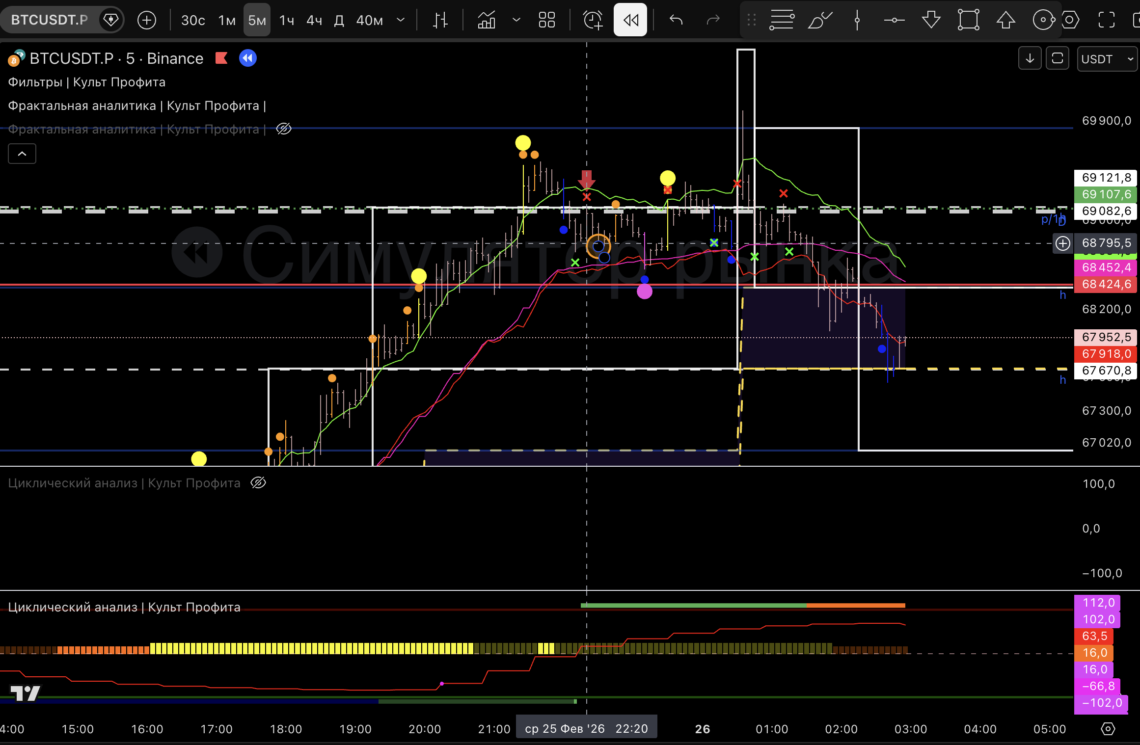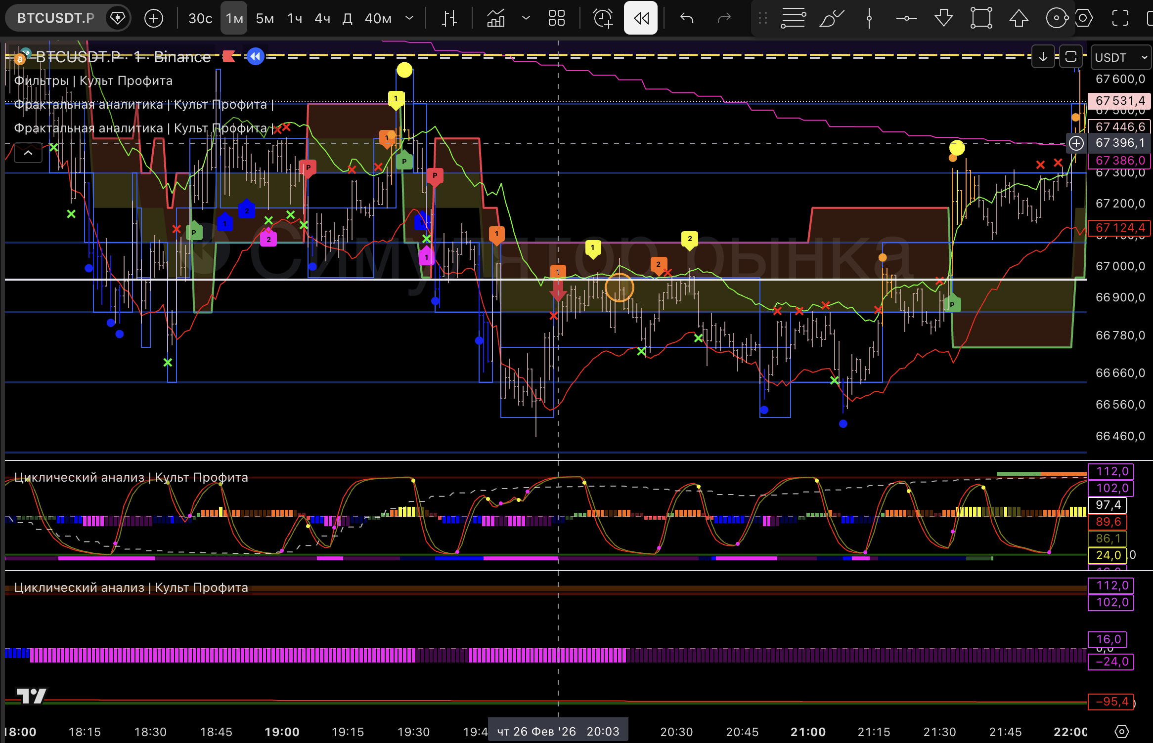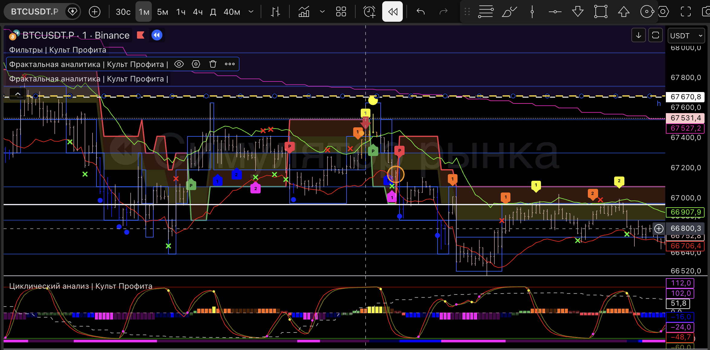 Вышел т.к загорелся розовый пм, линия цикла внизу и практически дошли до нижней границы 1м боровика.
