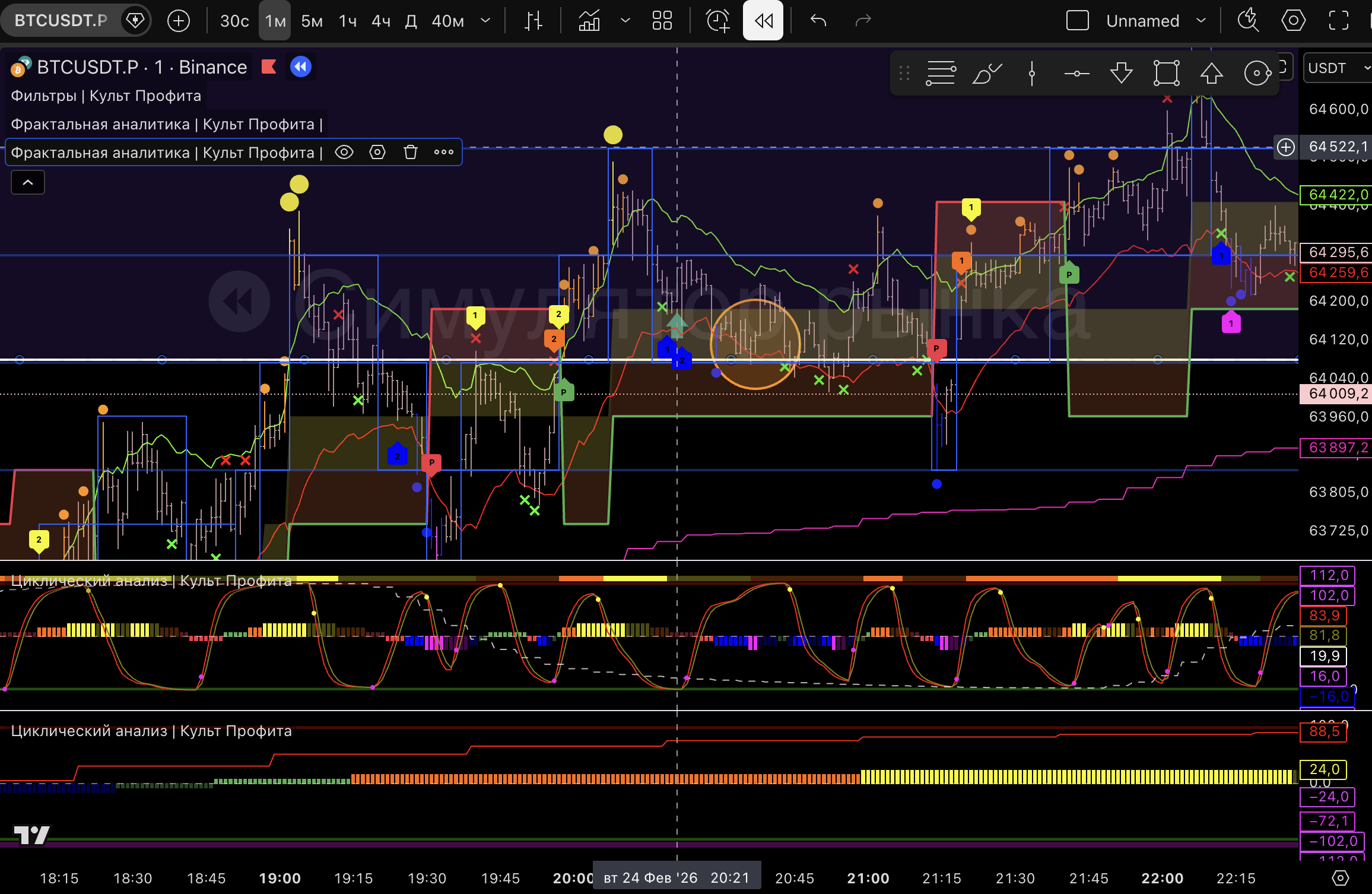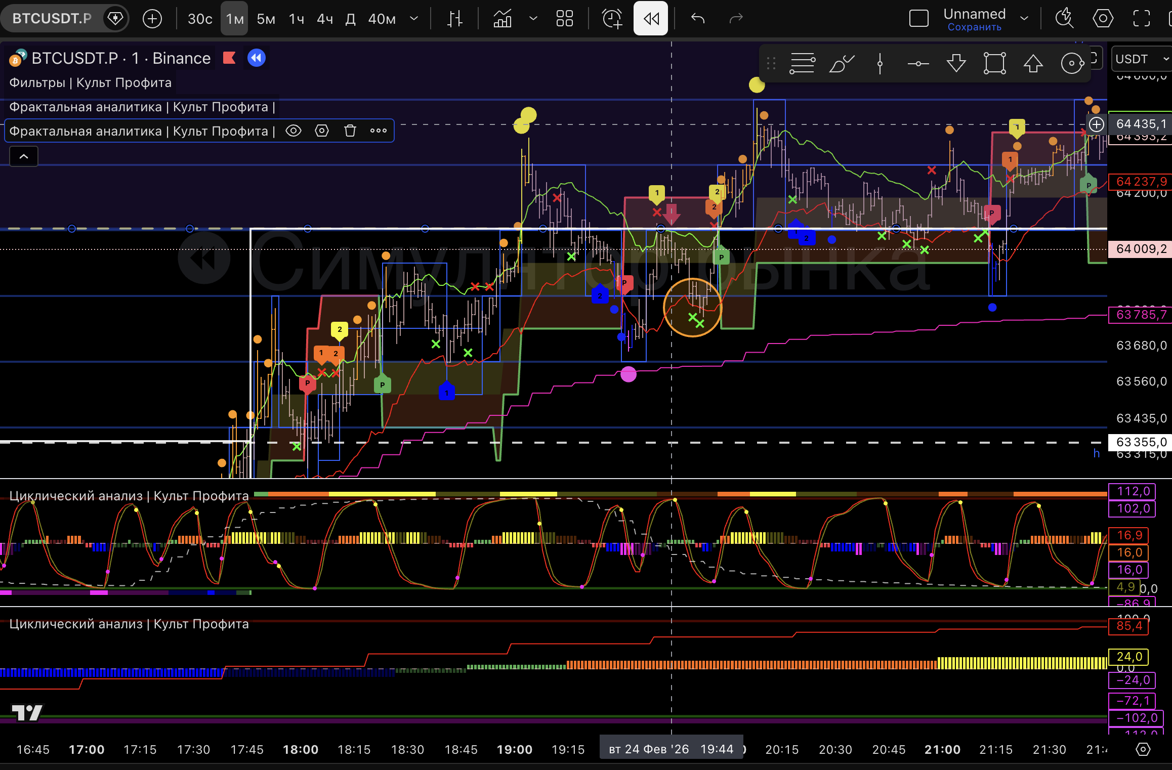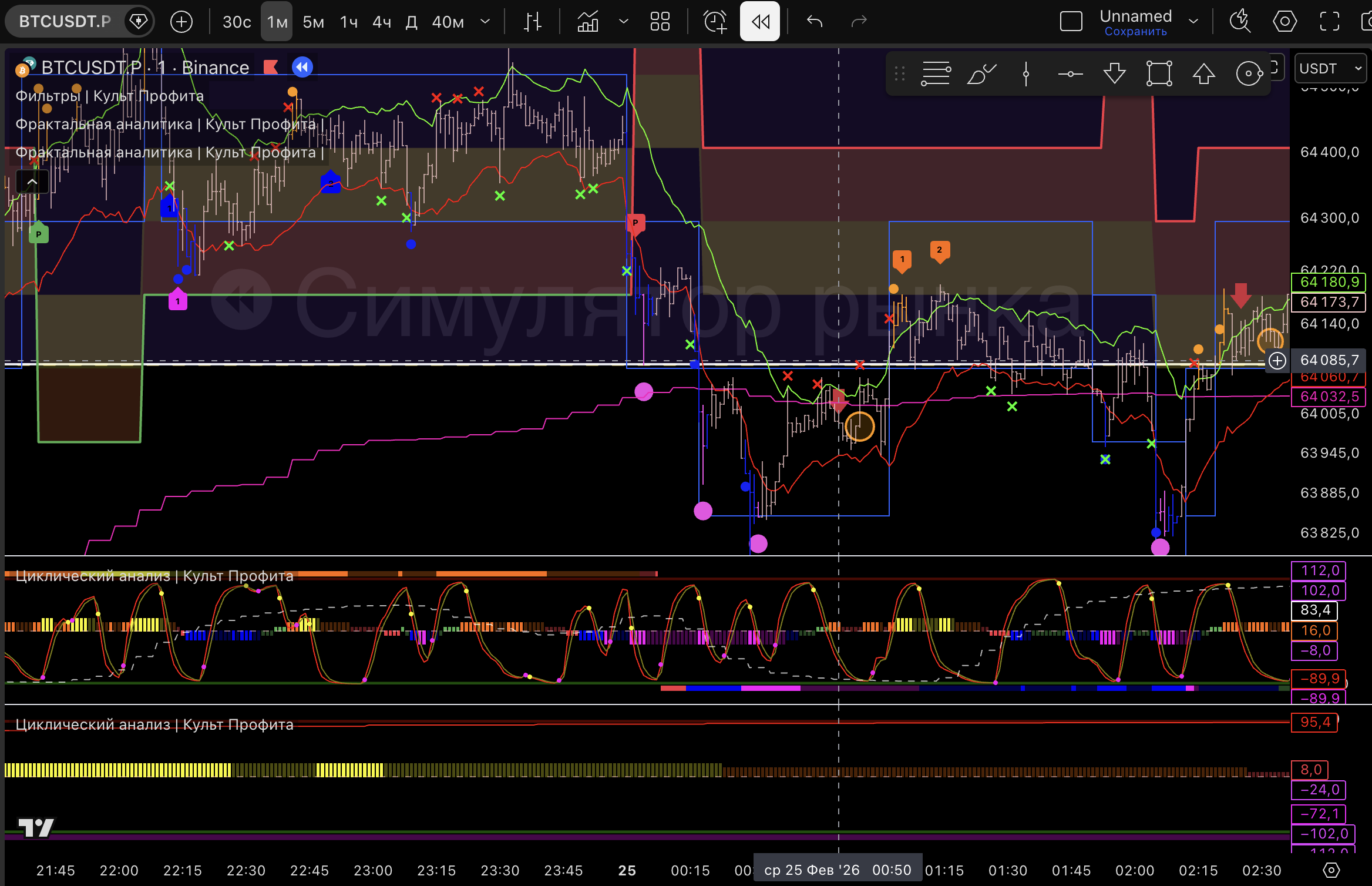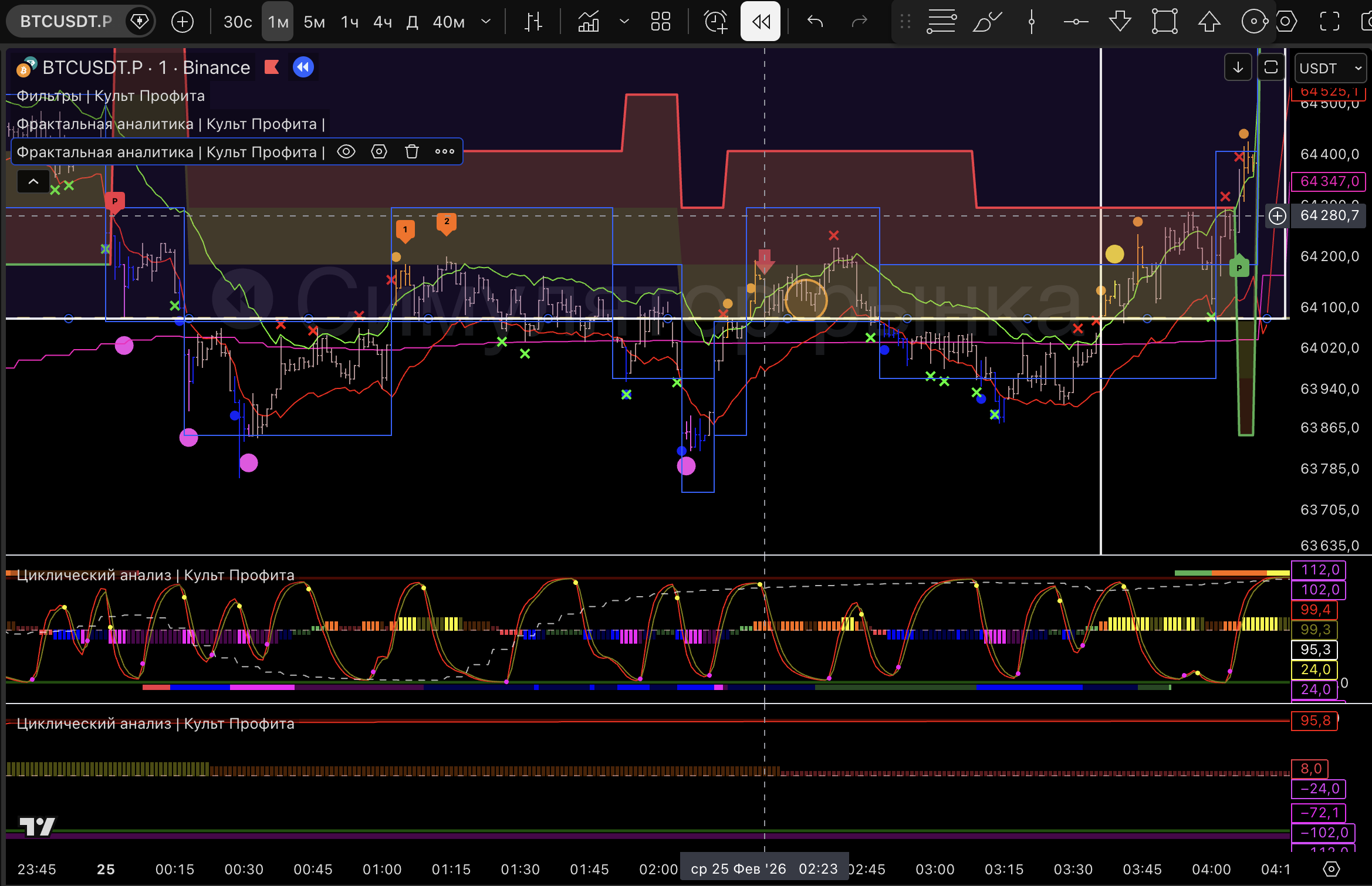 для торговли 1м старший будет 1ч, смотрим направление, фазу, тейки.