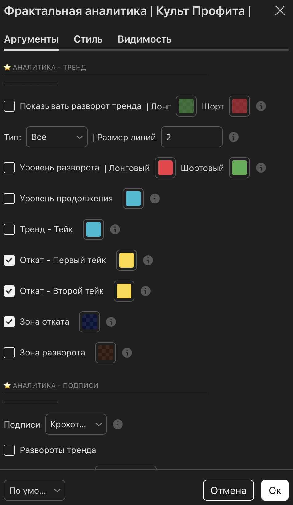 - Дополнительно подписи на разворот и откаты, очень удобно.