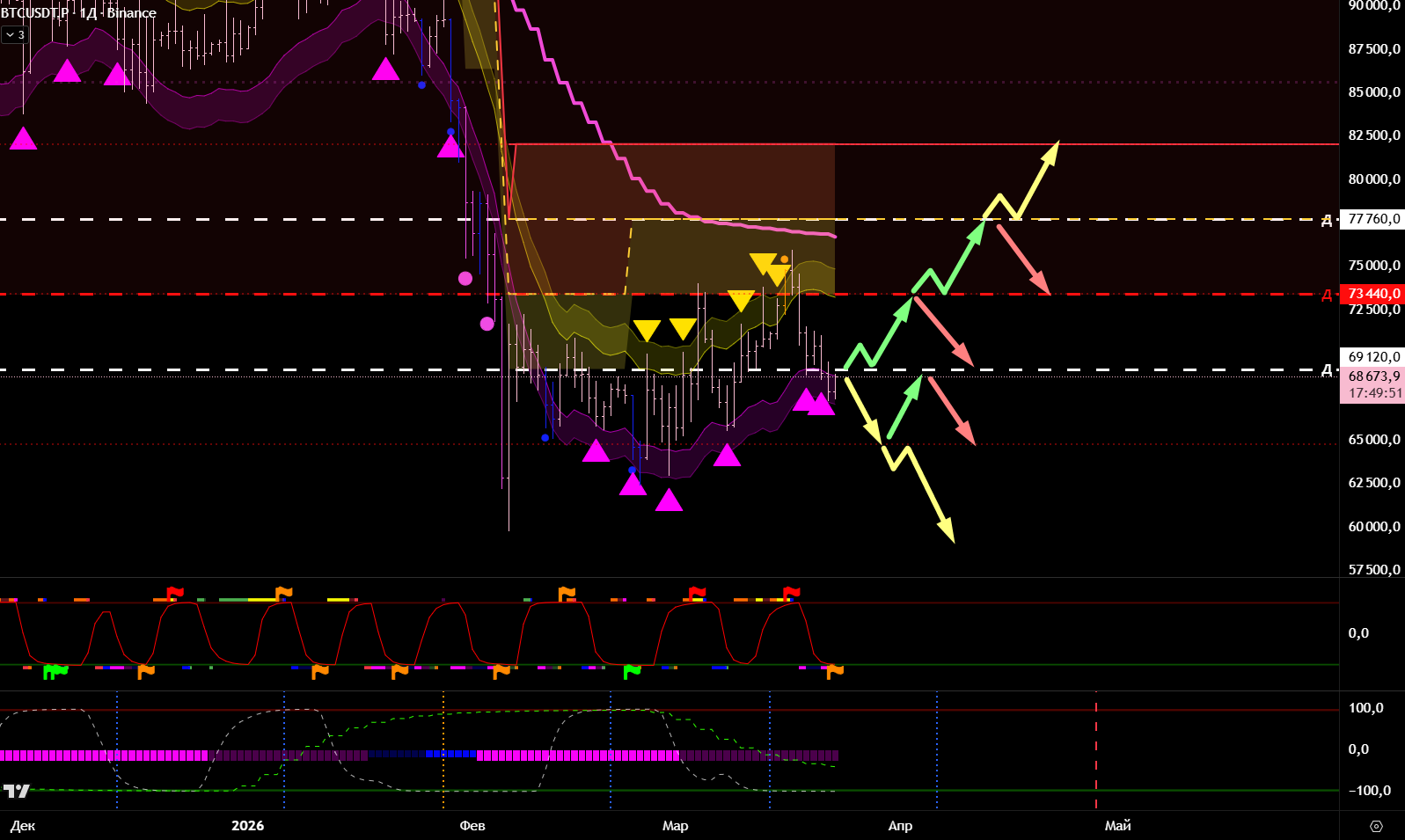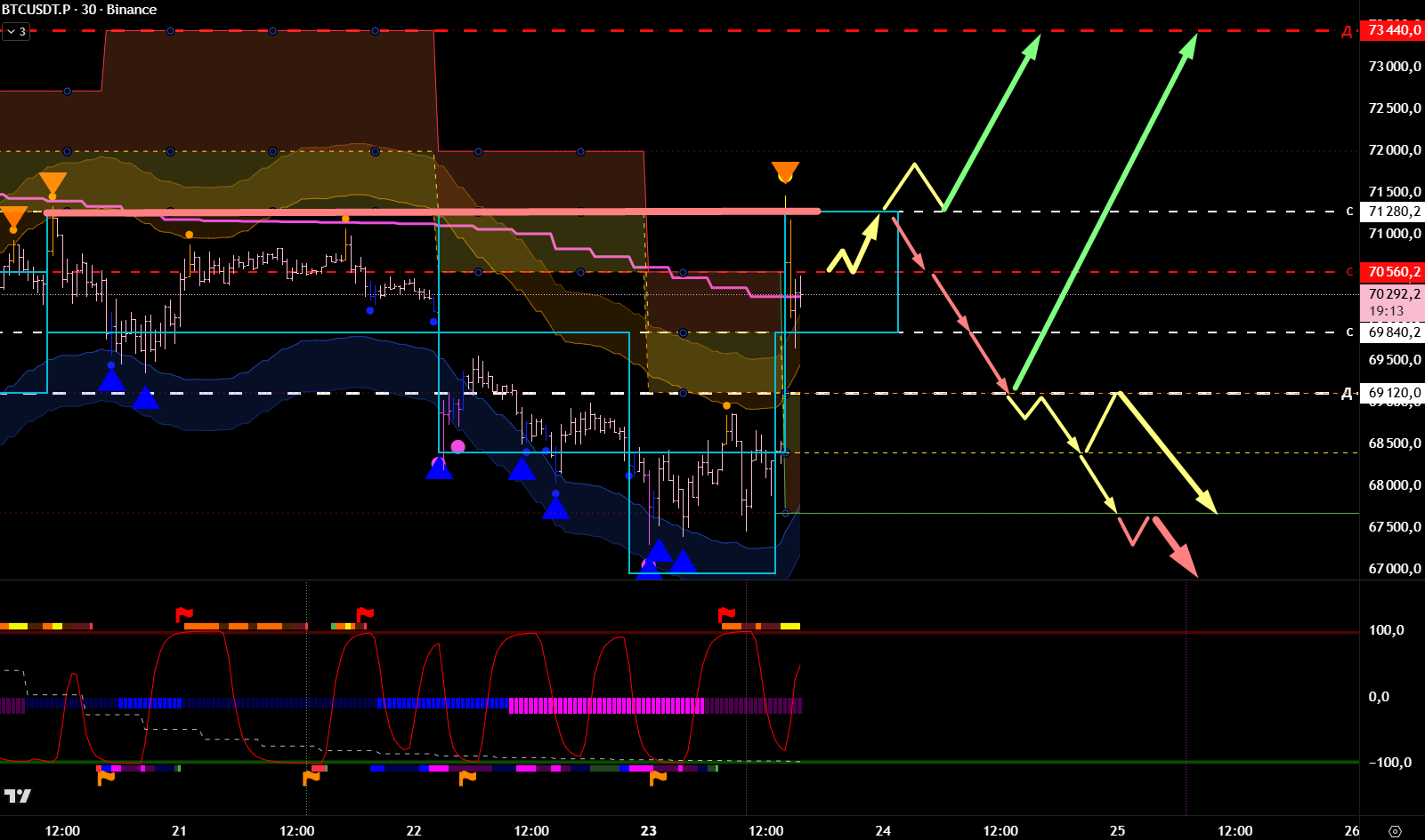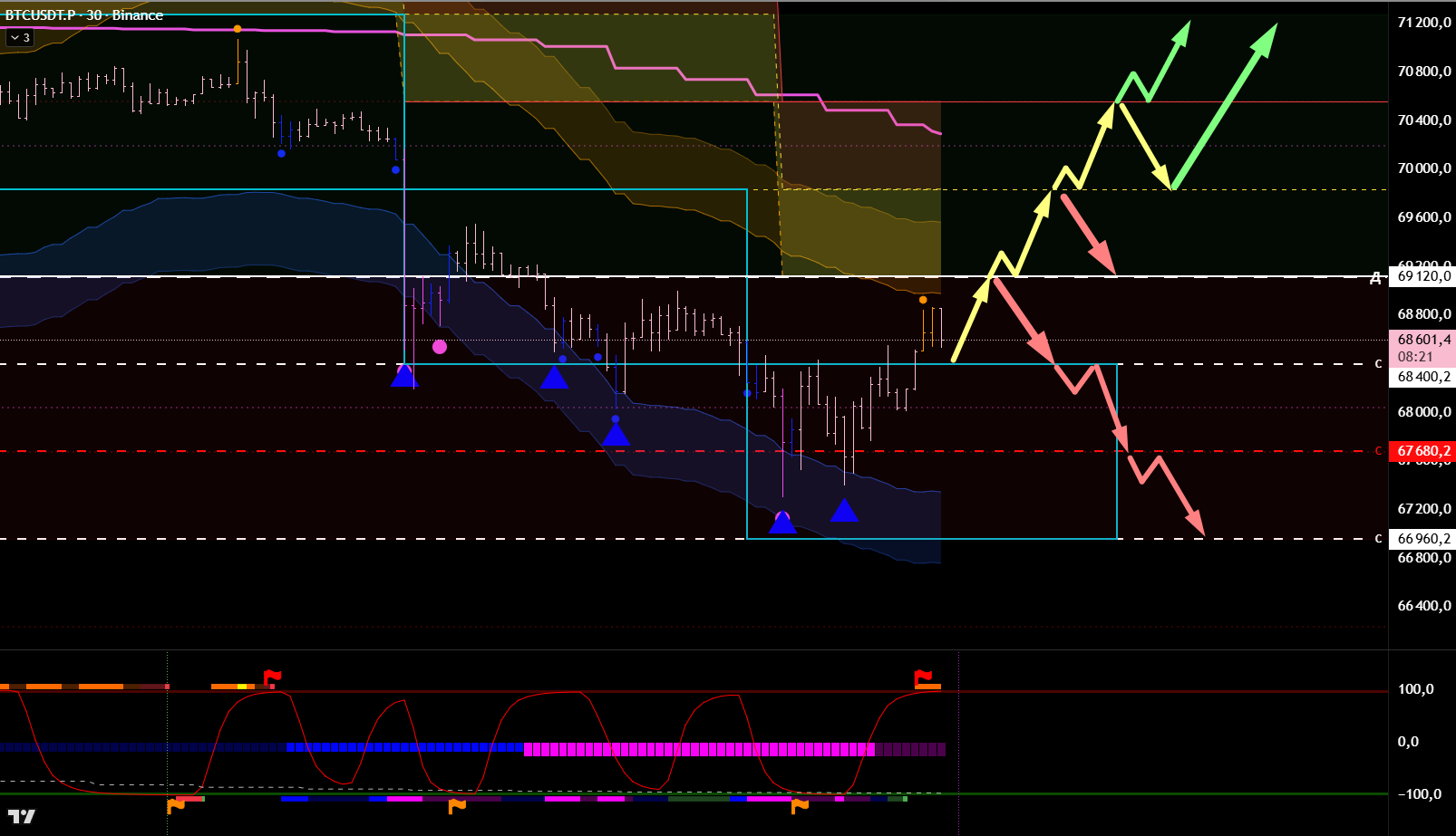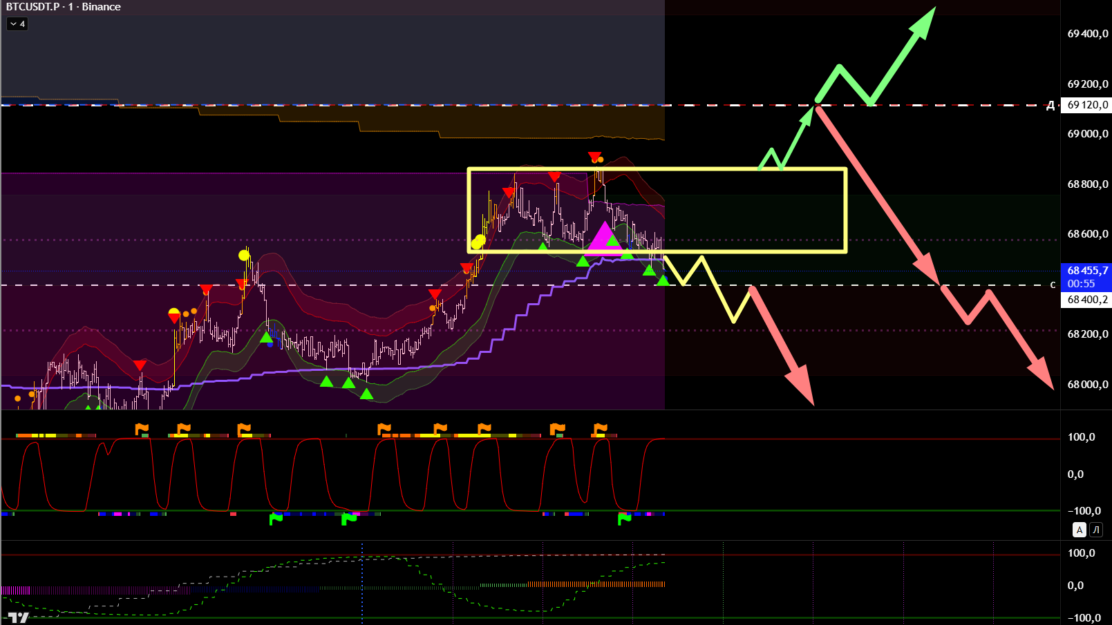 Находимся под нижней границей и с текущих открыта дорога на тейк нижнего среднего, при условии не возврата в текущий боковик. После тейка нового среднего формируется новый боковик и с отката до 69120 шорт по тренду.