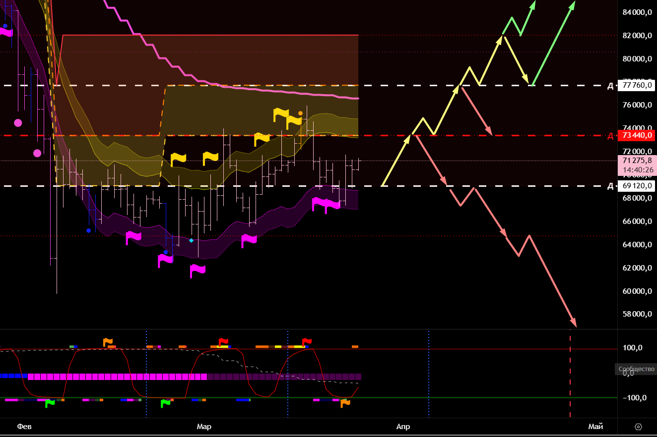 Среднее: 73440.Тренд: Шорт, идёт откат.