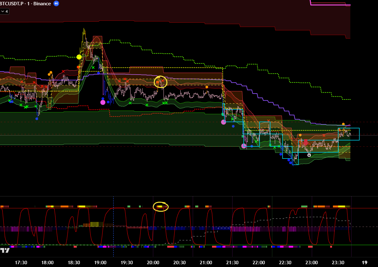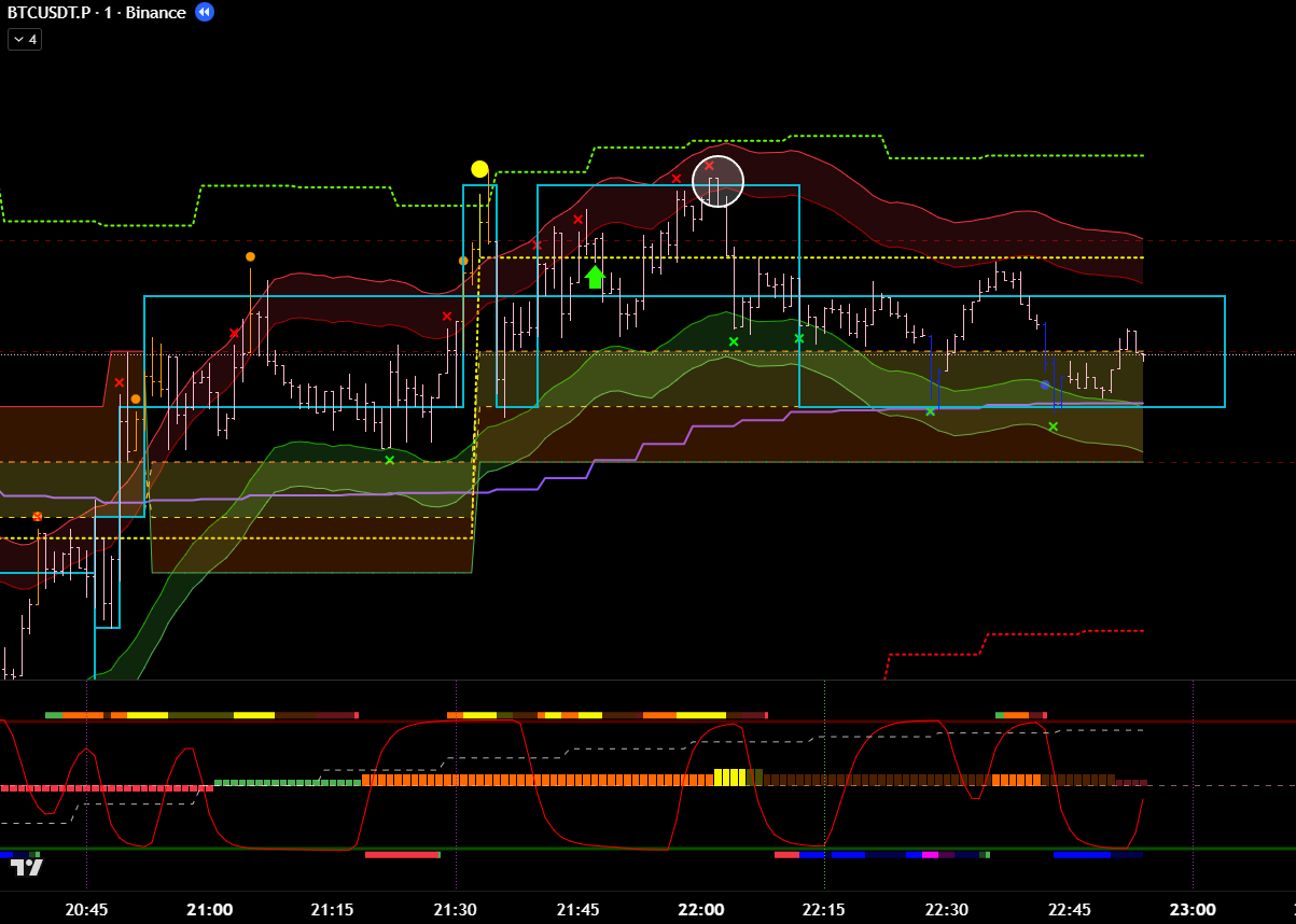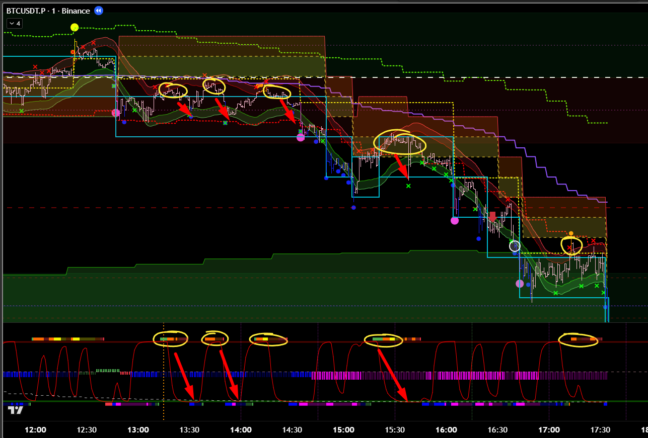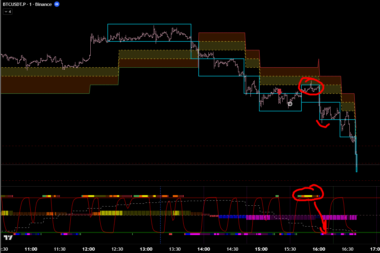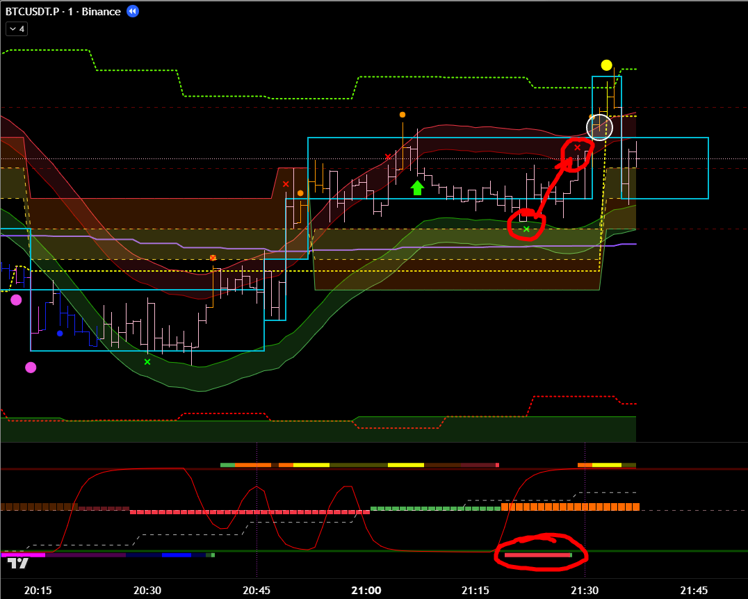 Добавив минутные фильтры, эта же сделка является хорошей. Есть бифуркация, откат, под балансом, сигнал хая. 8 из 10 как минимум? Но горит фиолетовый лой. Стоило бы? Вряд ли.