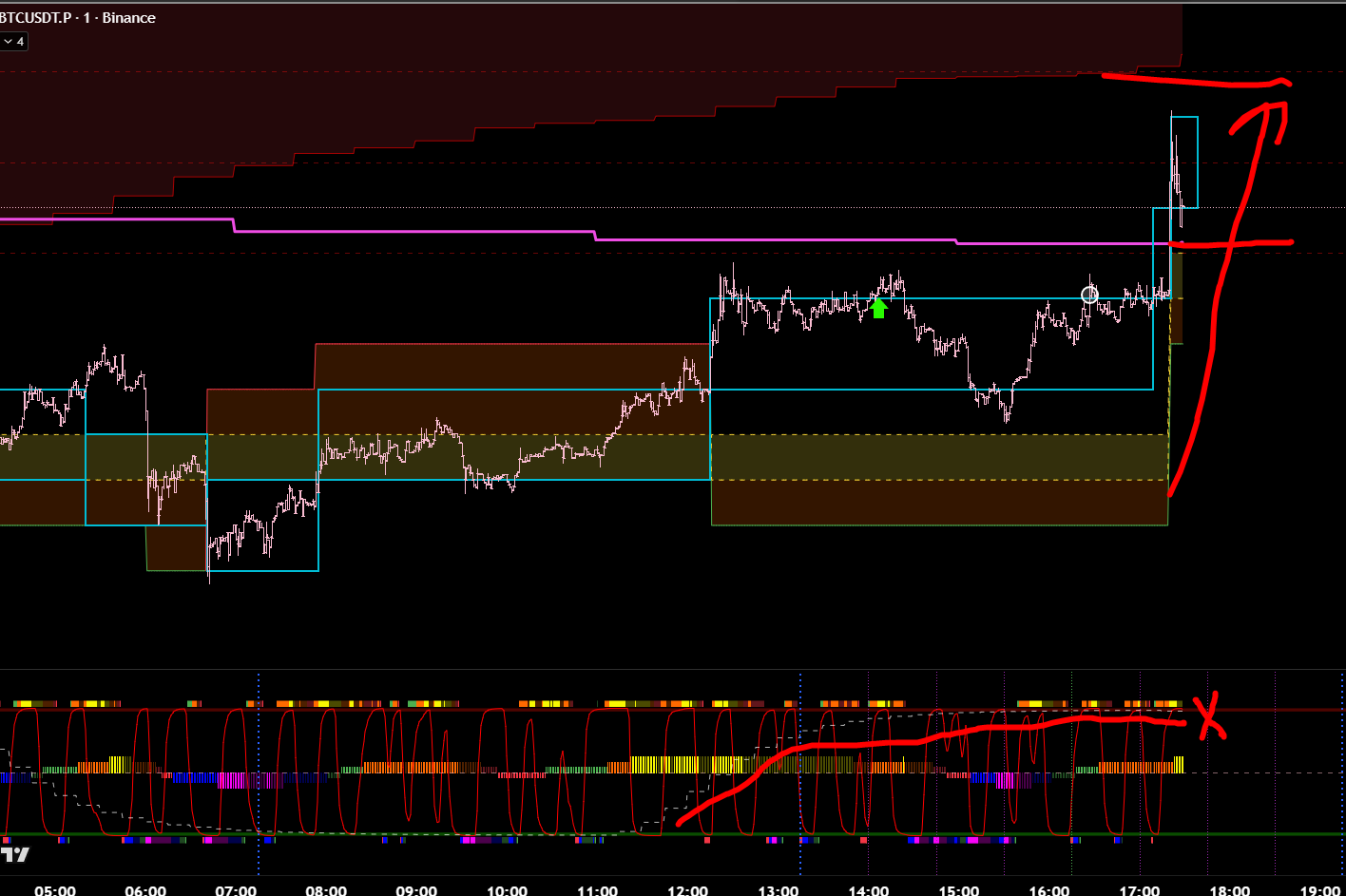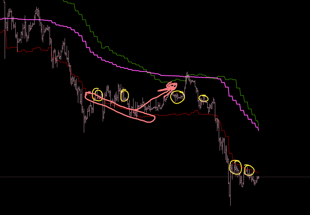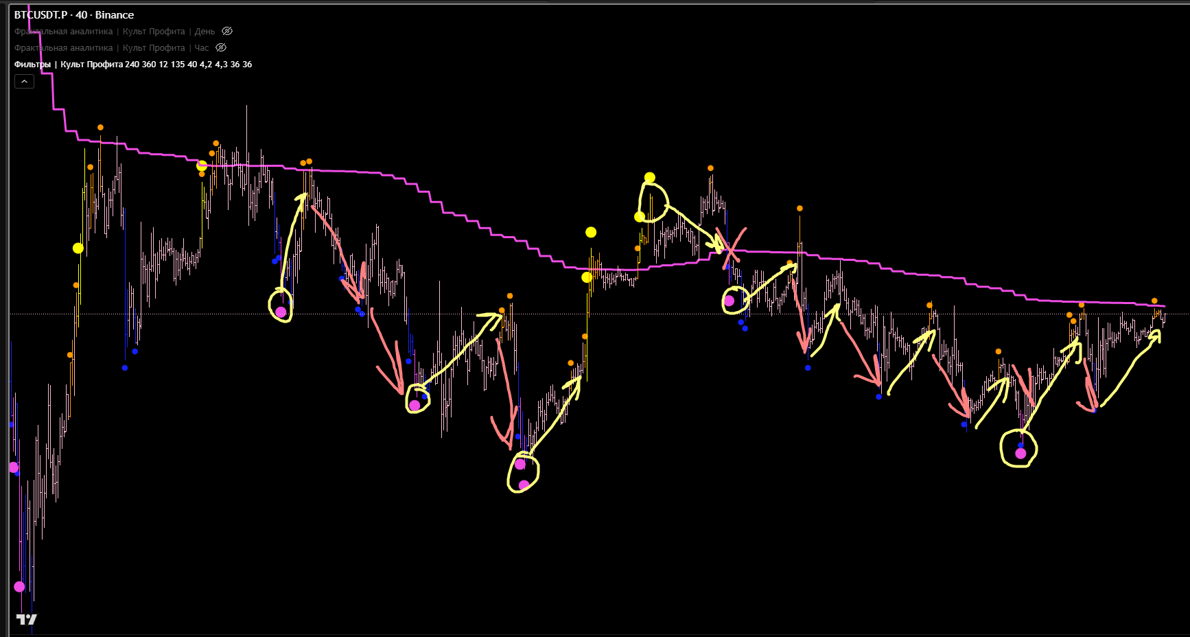 Интрадей фильтр. Вход хоть и после розового лоя и оранжевого отката. Но вход уже после финального тейка. Этой сделки не должно было существовать уже после розового лоя.