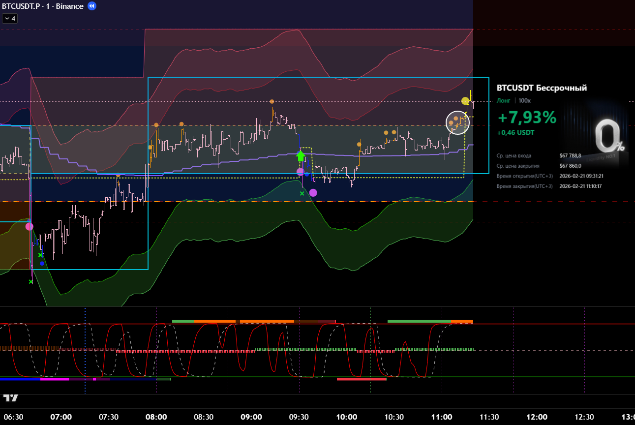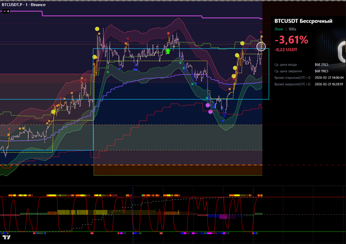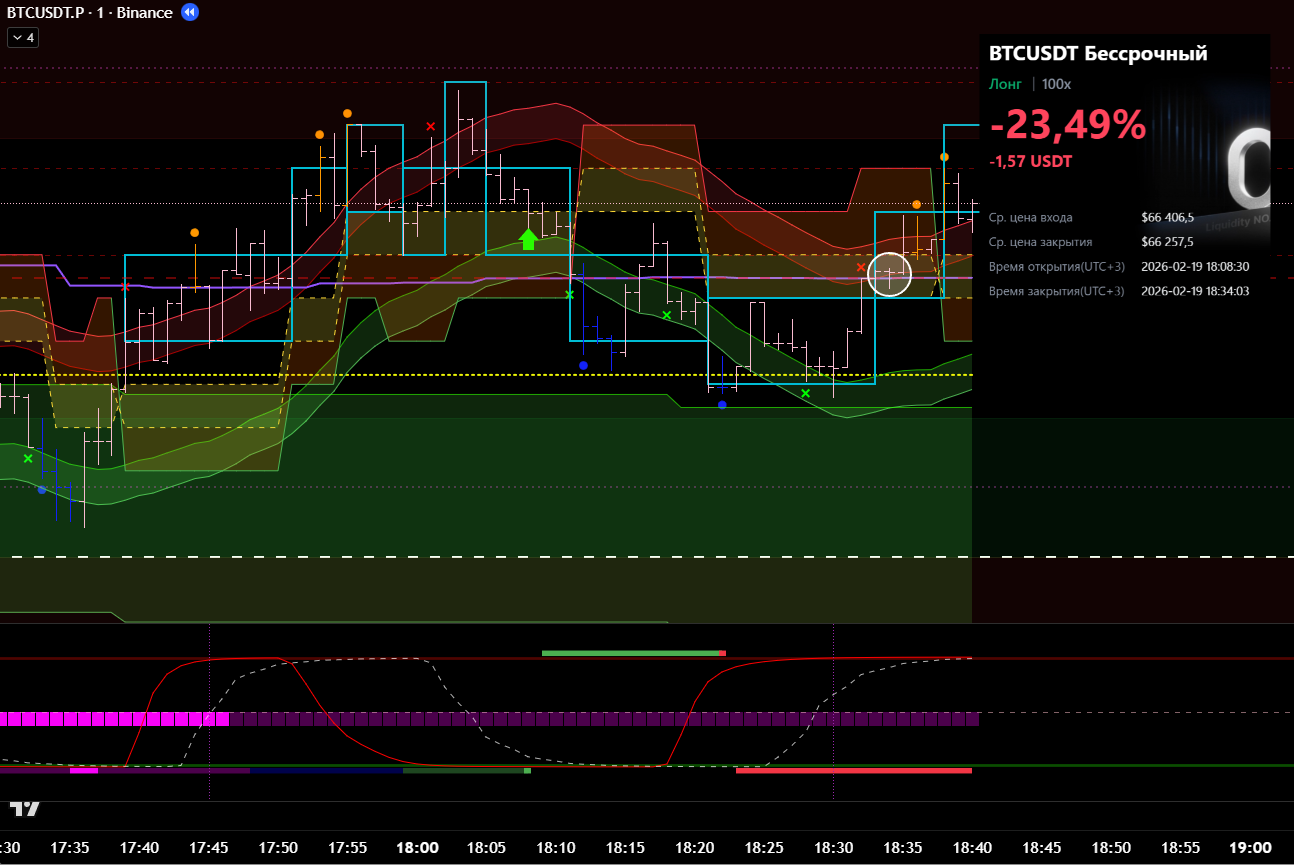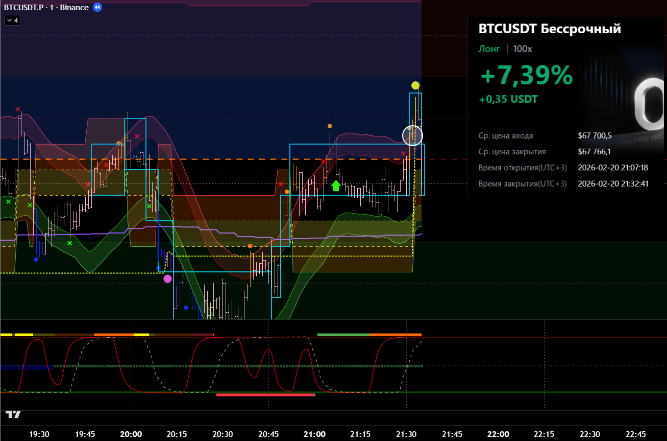 Сделка сразу после ликвидации в лонговый тренд. Видно, что даже не от лоя по циклу. Даже подтверждения бифуркации не дождался.