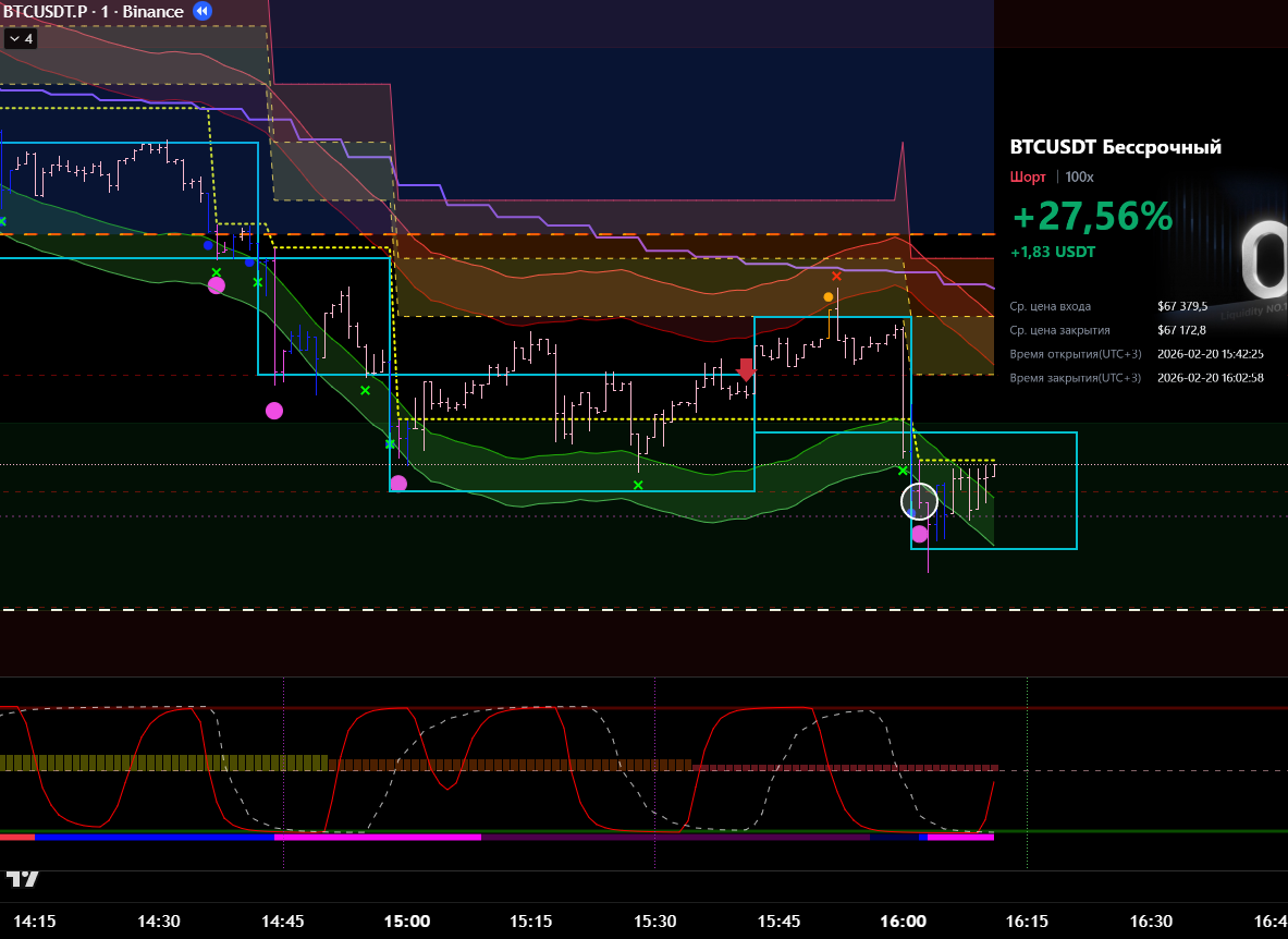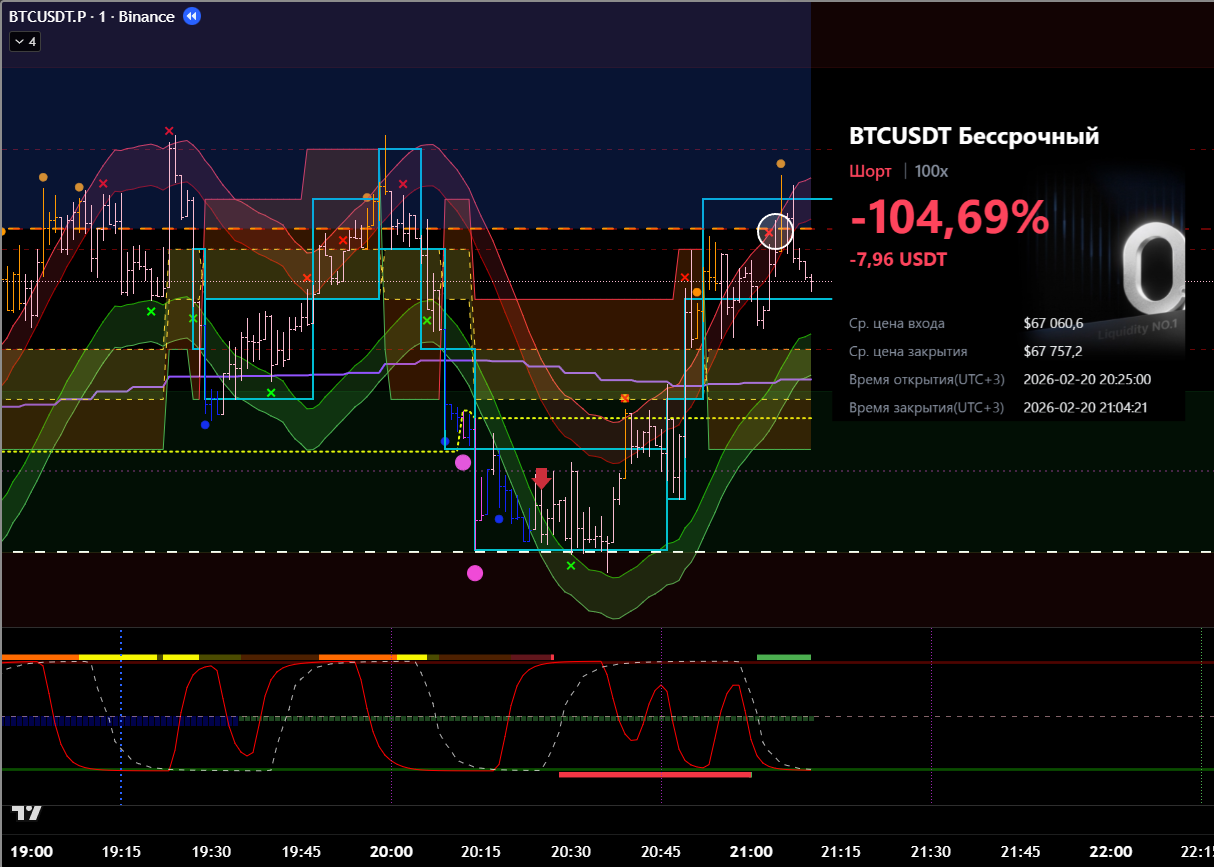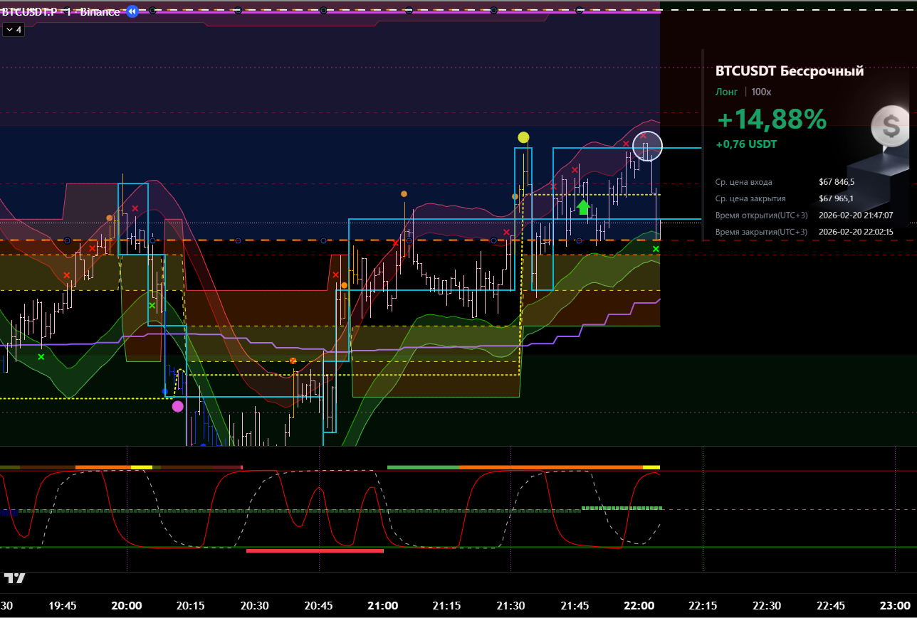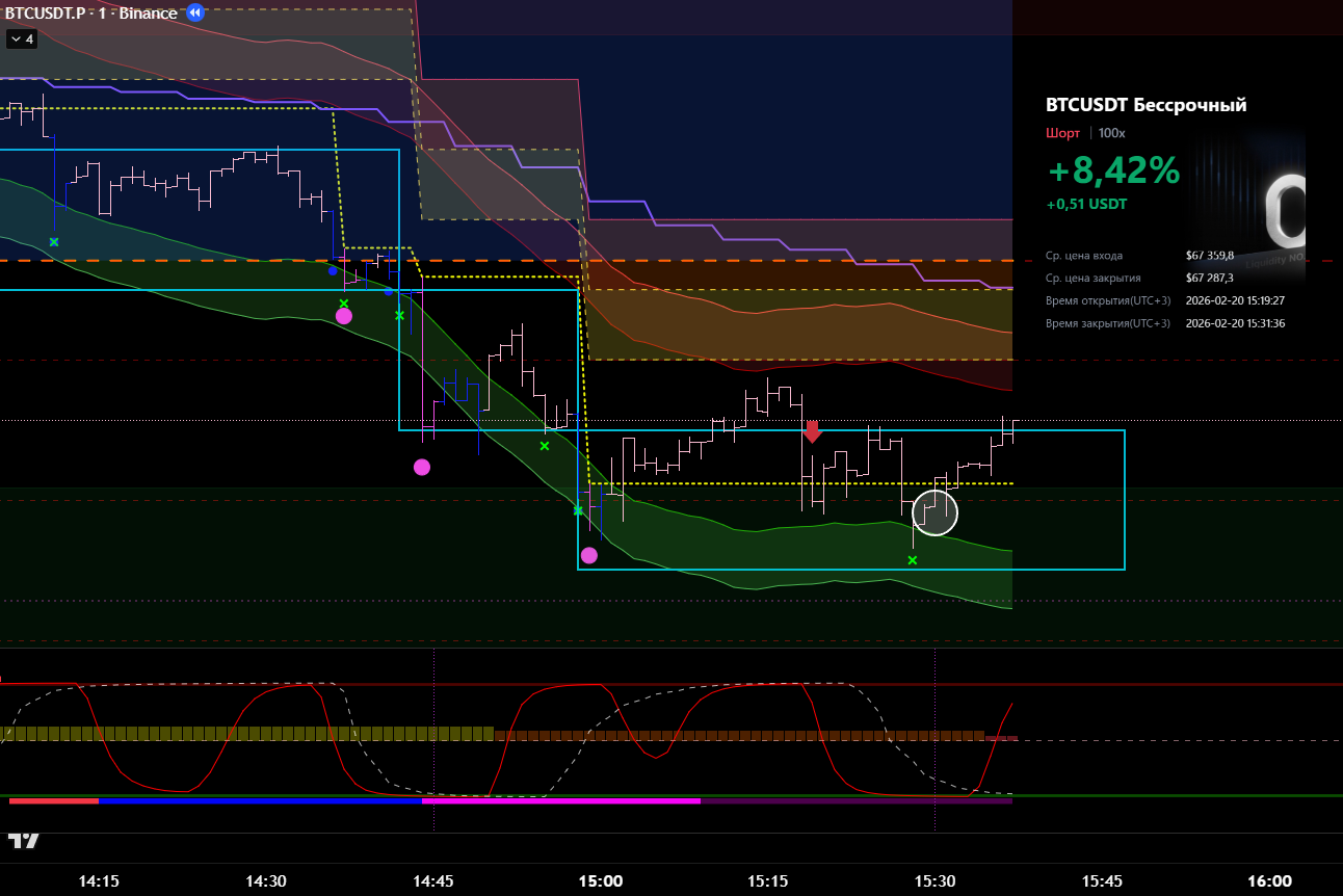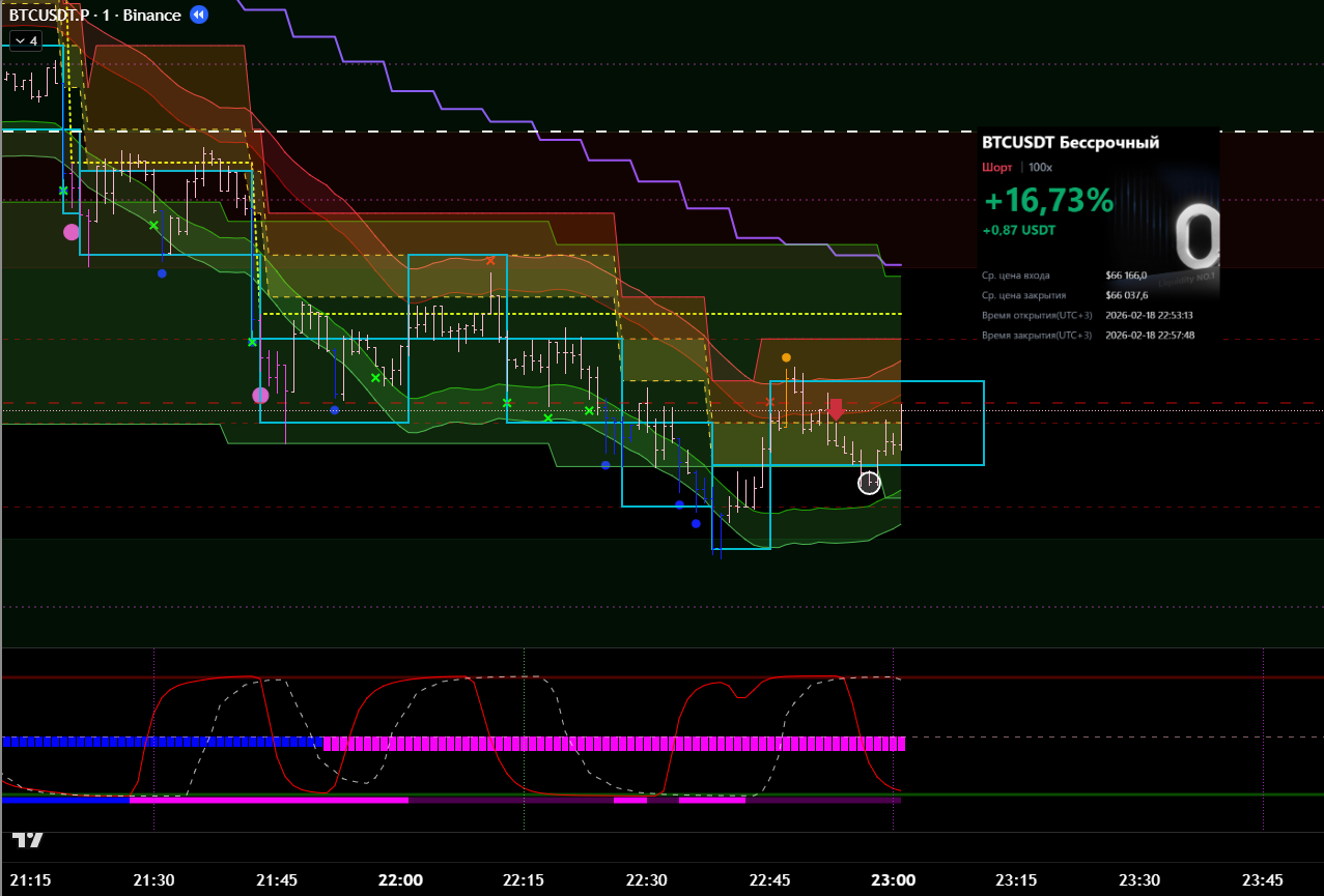 Сделка сразу после ликвидации в лонговый тренд. Видно, что даже не от лоя по циклу. Даже подтверждения бифуркации не дождался.