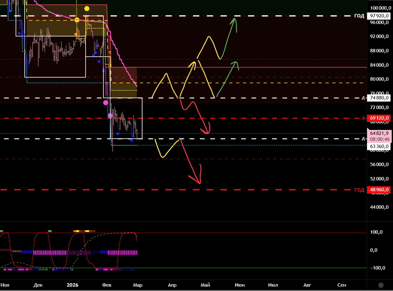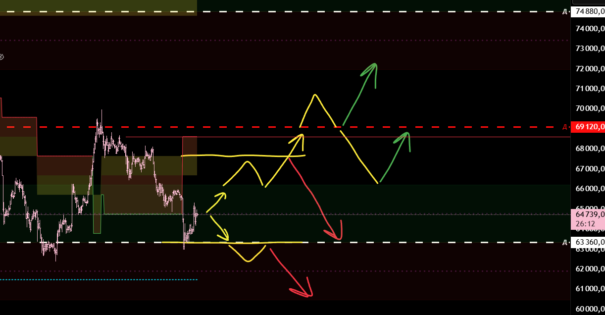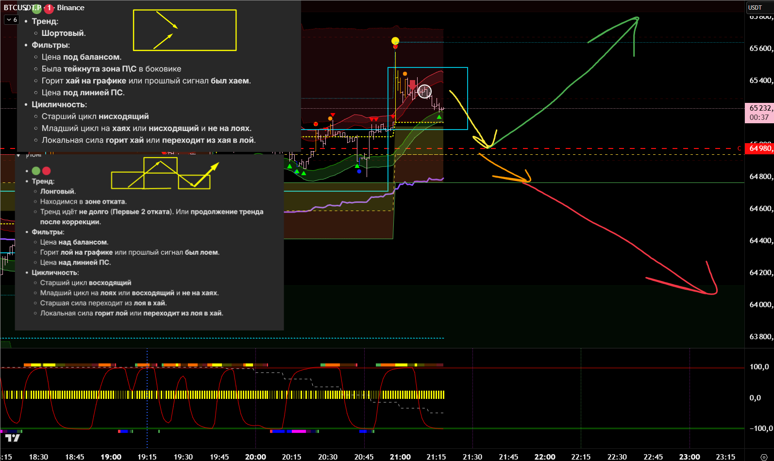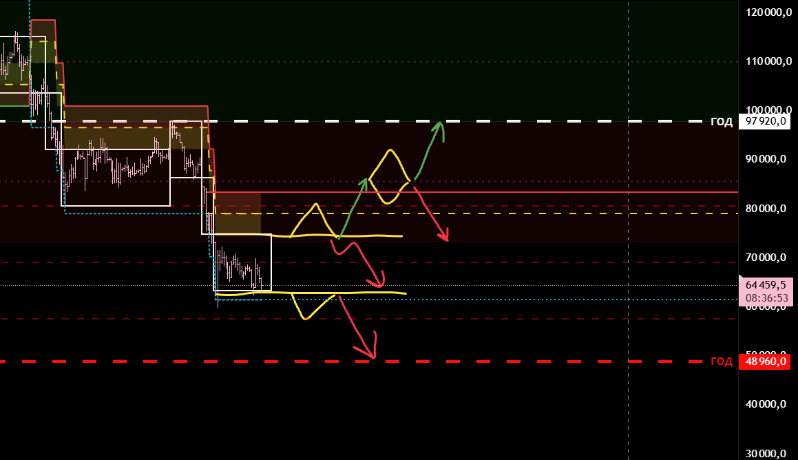 Текущий тренд шортовый и от тейка нижней границы долгосрока мы ждём лонговый откат. Дальнейший шорт от ухода под границу долгосрока и локального отката.