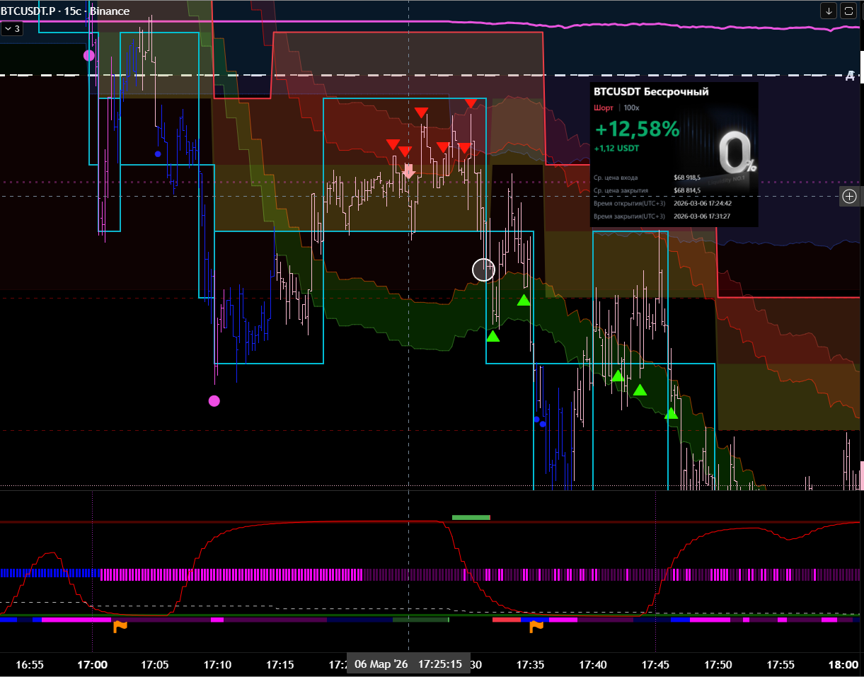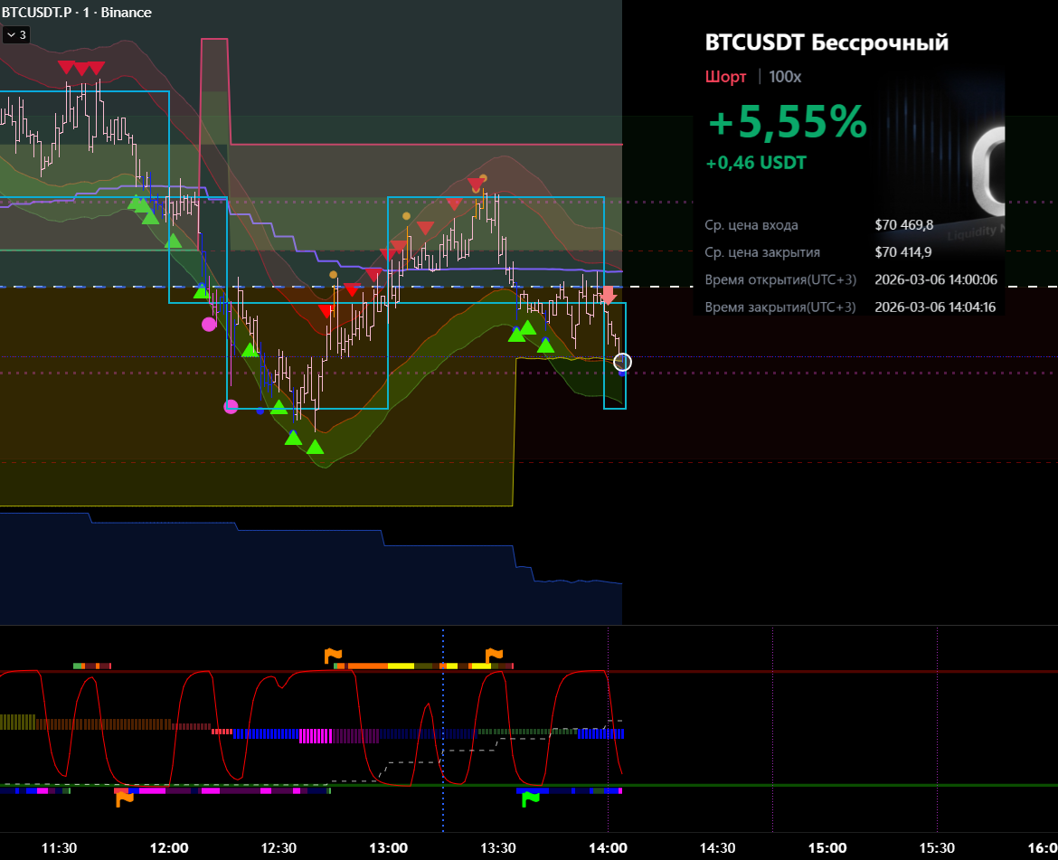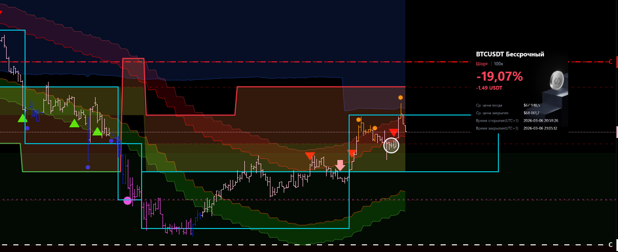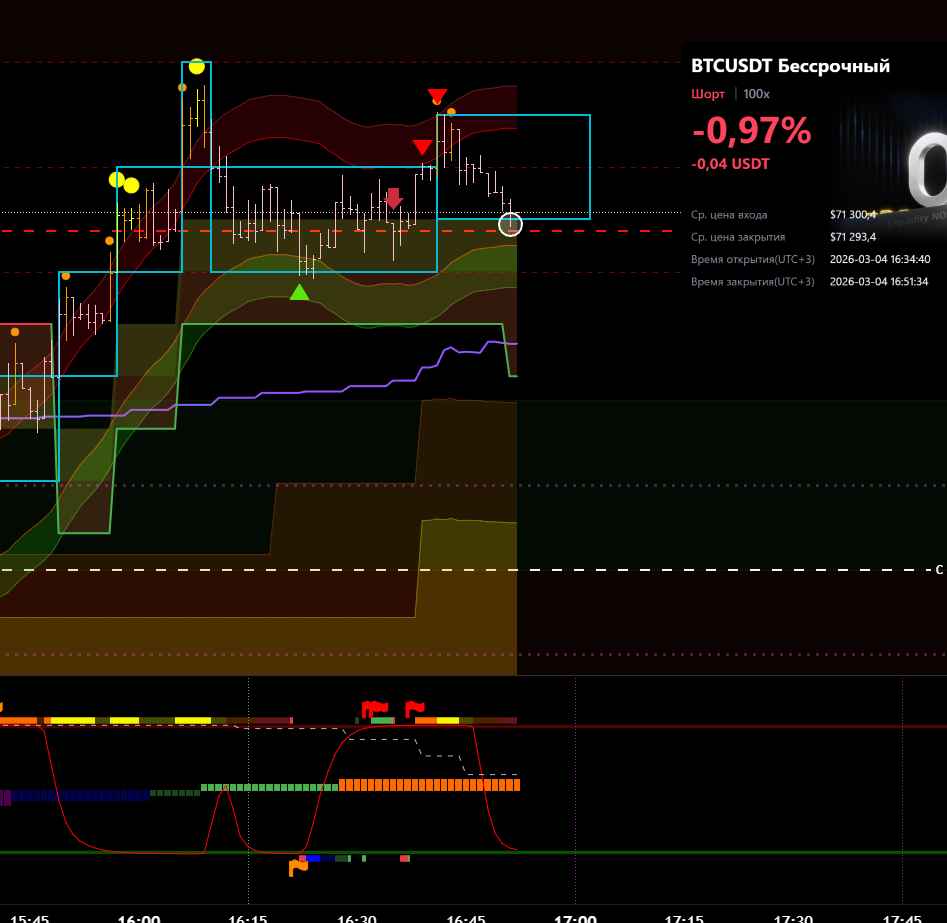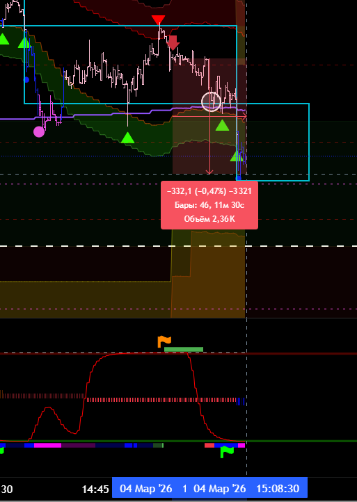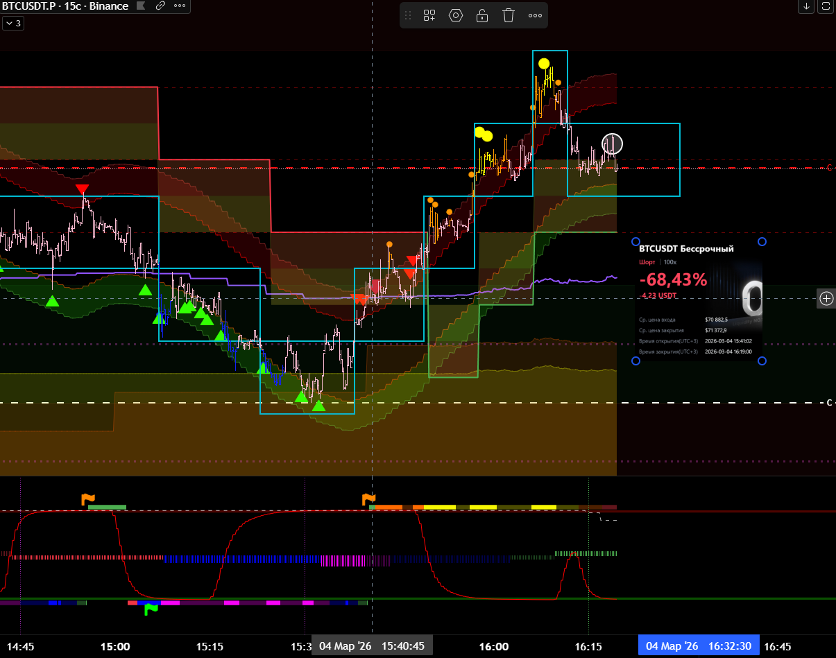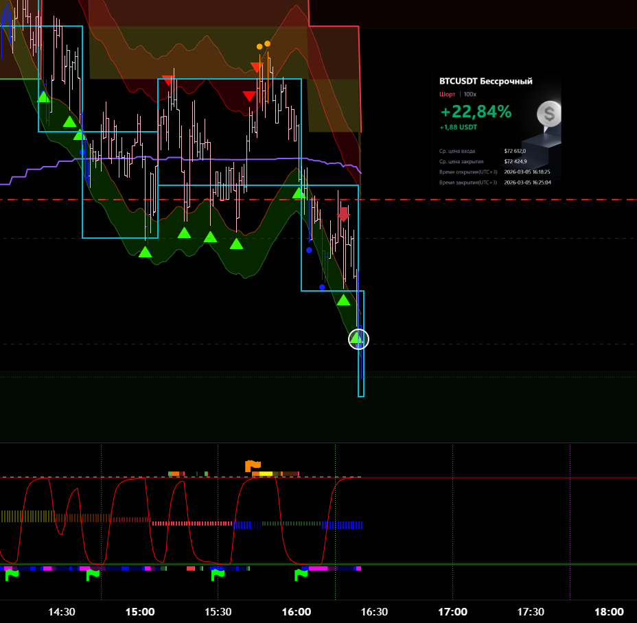 Снова вход по индикаторам. Но тут уже глупец я и вошёл в шорт на растущем старшем цикле и на лоях в среднесрочном тренде. Правда цикл развернулся после входа, а после обновления страницы оказалось что до. Но всё равно ошибка есть ошибка.
