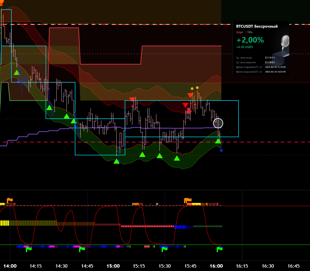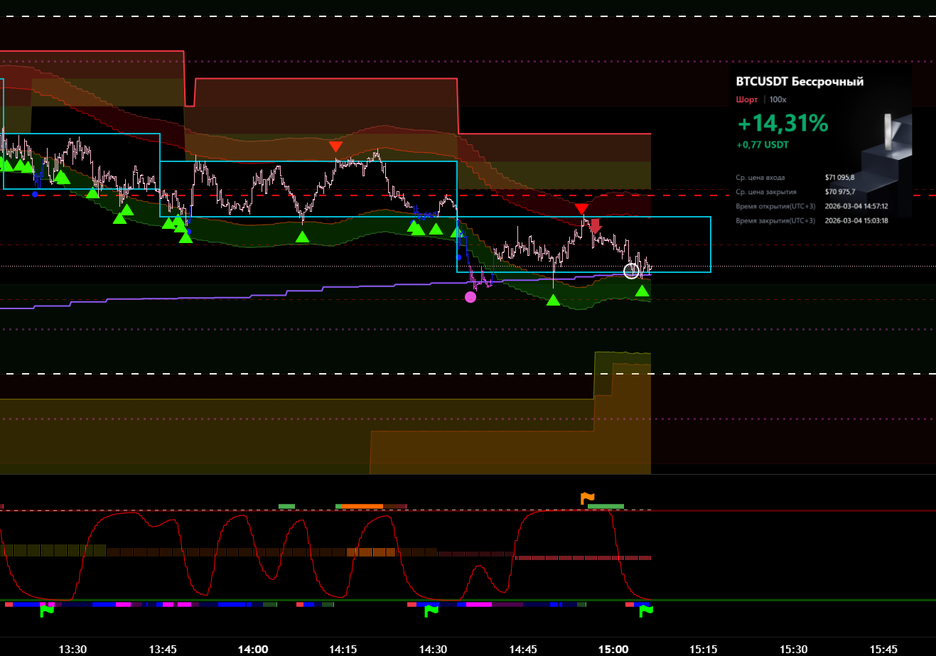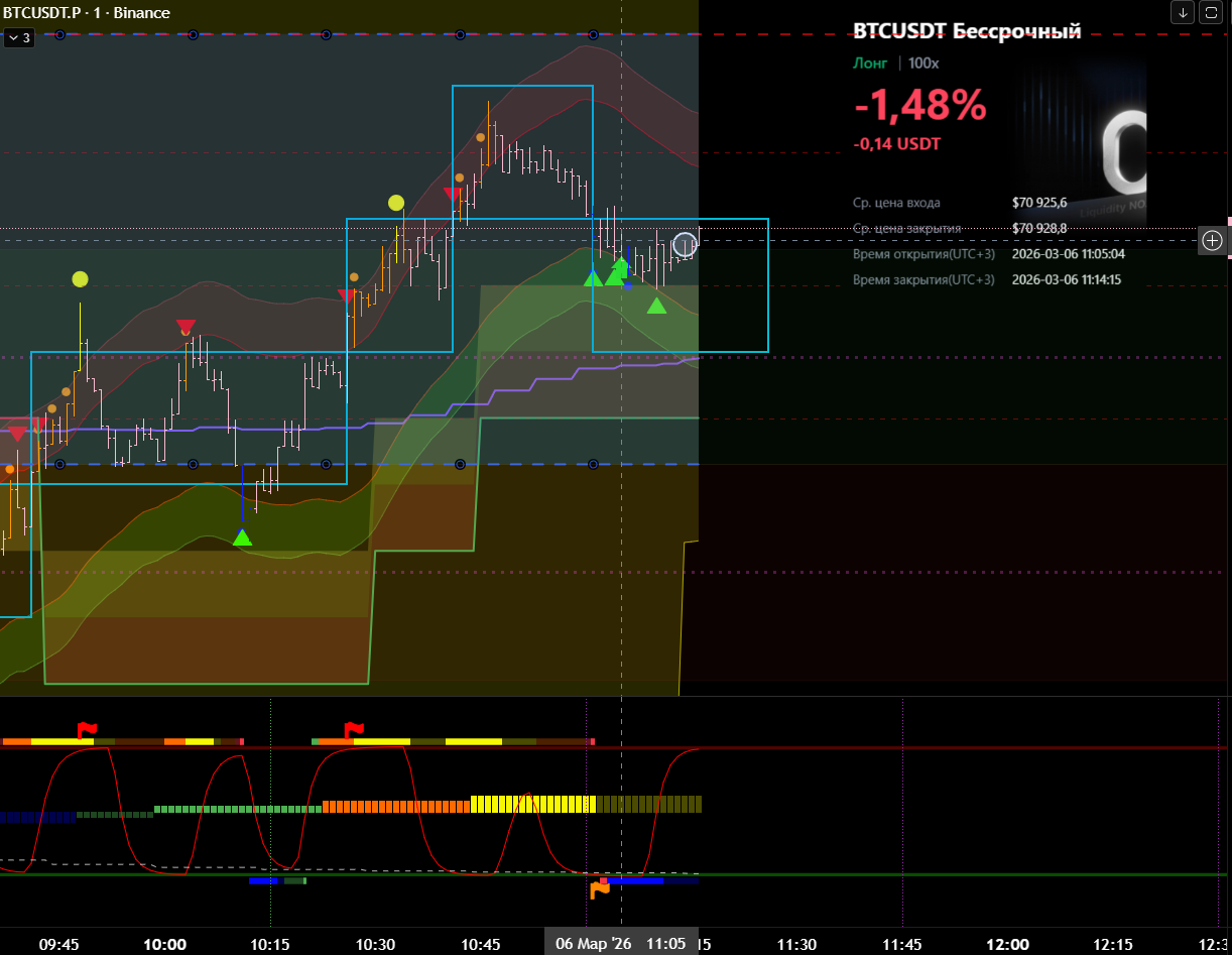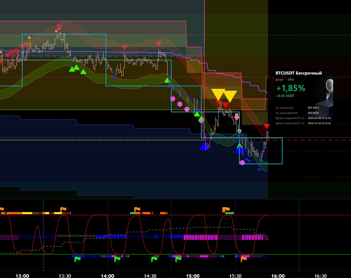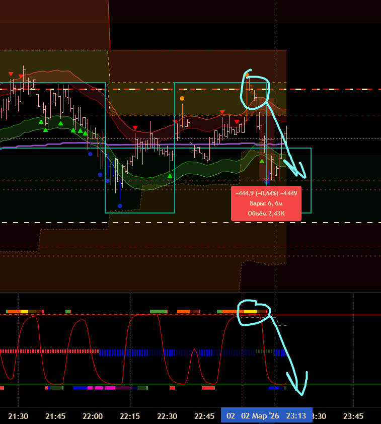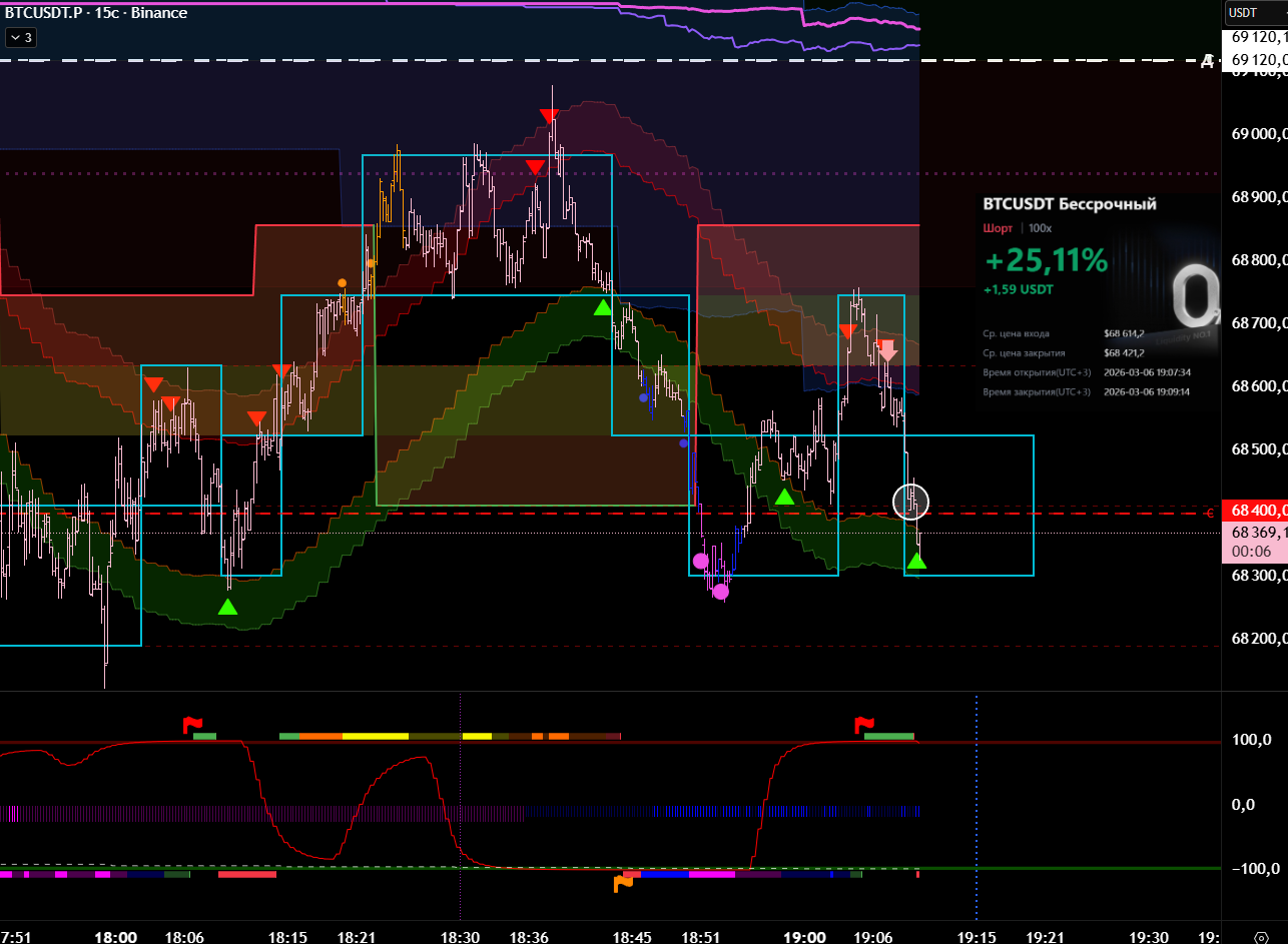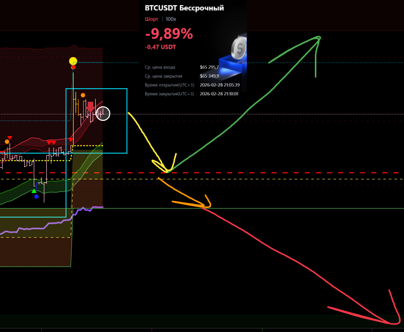 Снова вход по индикаторам. Но тут уже глупец я и вошёл в шорт на растущем старшем цикле и на лоях в среднесрочном тренде. Правда цикл развернулся после входа, а после обновления страницы оказалось что до. Но всё равно ошибка есть ошибка.