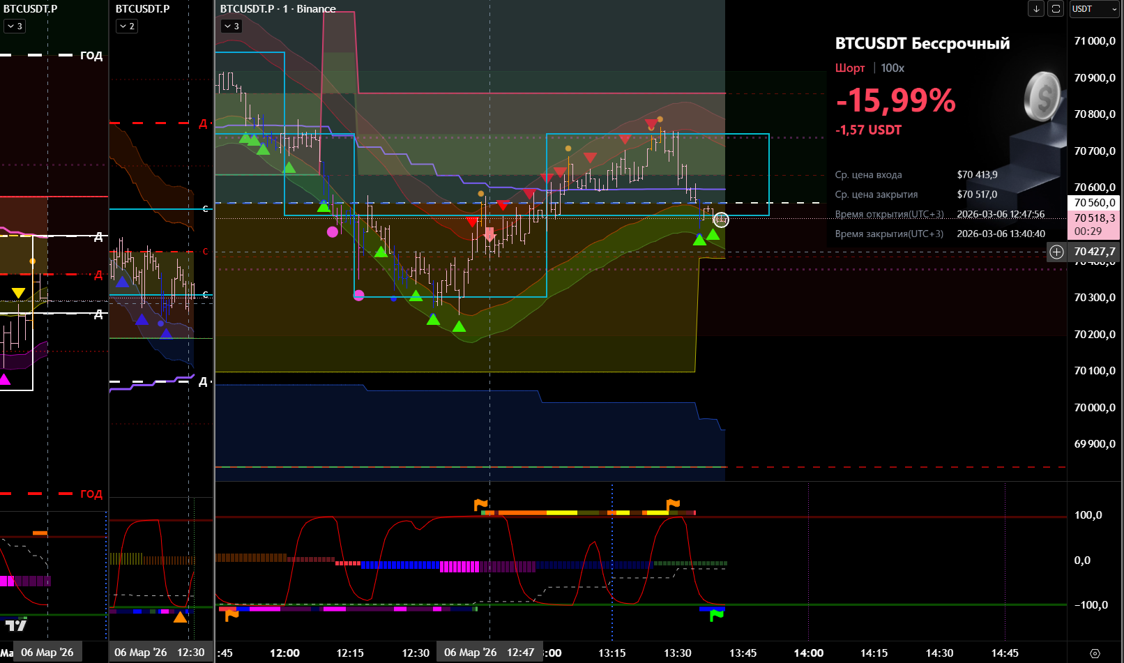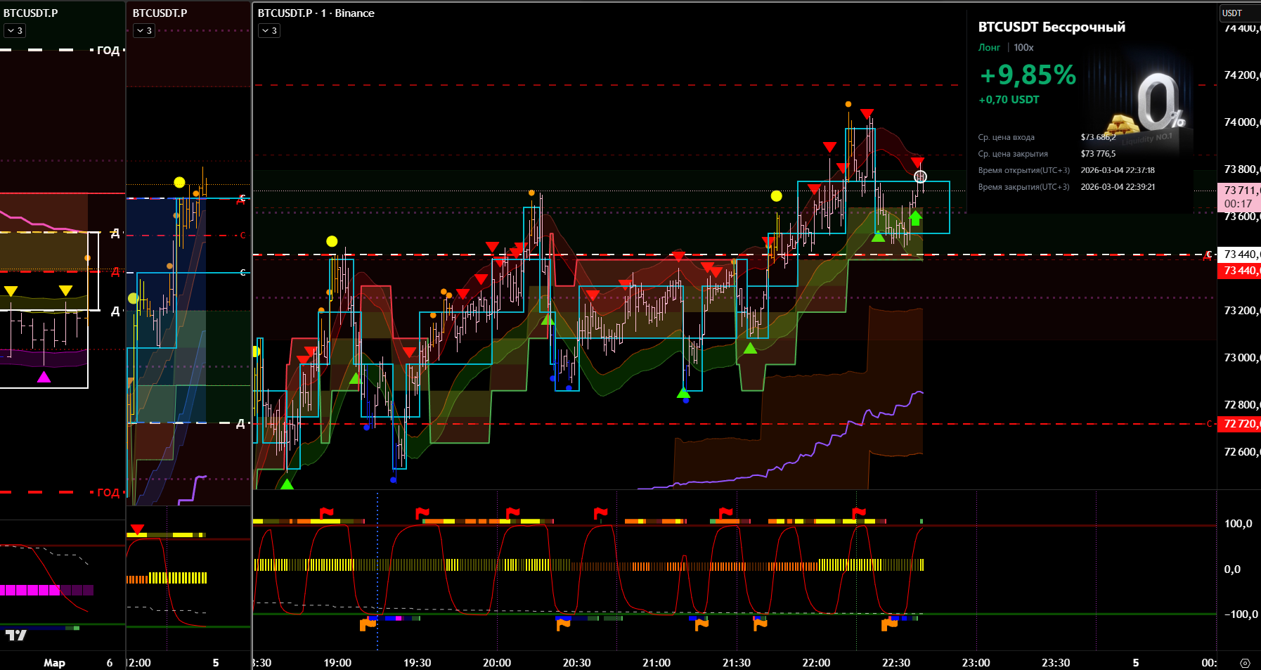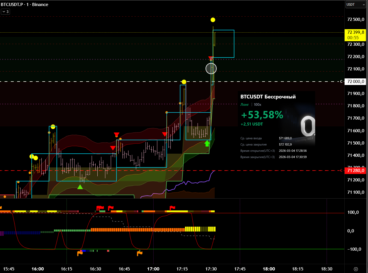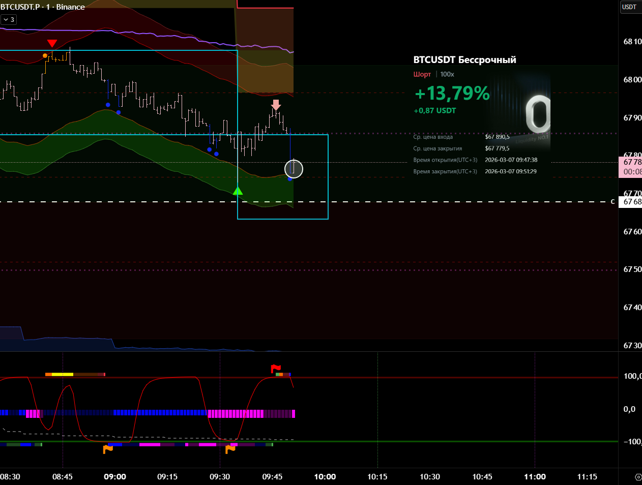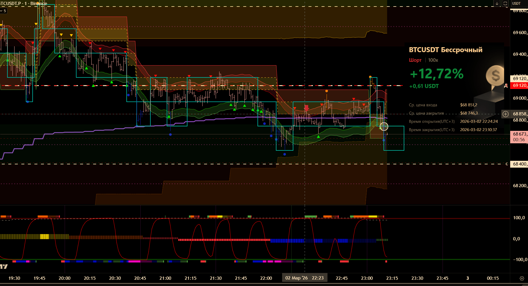 Снова вход по индикаторам. Но тут уже глупец я и вошёл в шорт на растущем старшем цикле и на лоях в среднесрочном тренде. Правда цикл развернулся после входа, а после обновления страницы оказалось что до. Но всё равно ошибка есть ошибка.