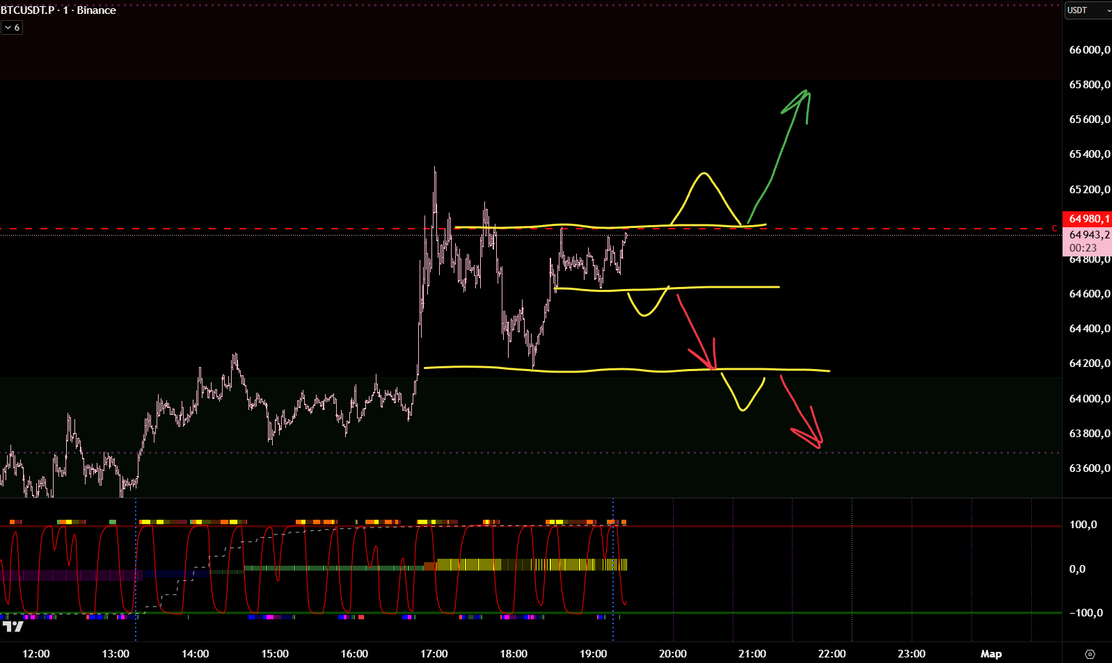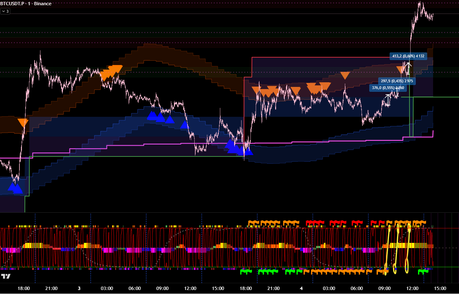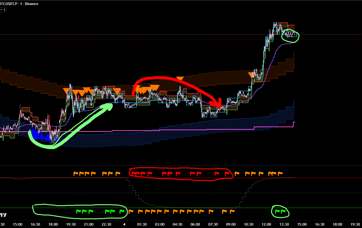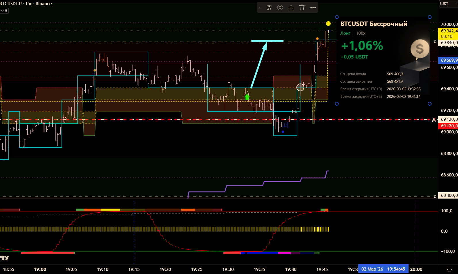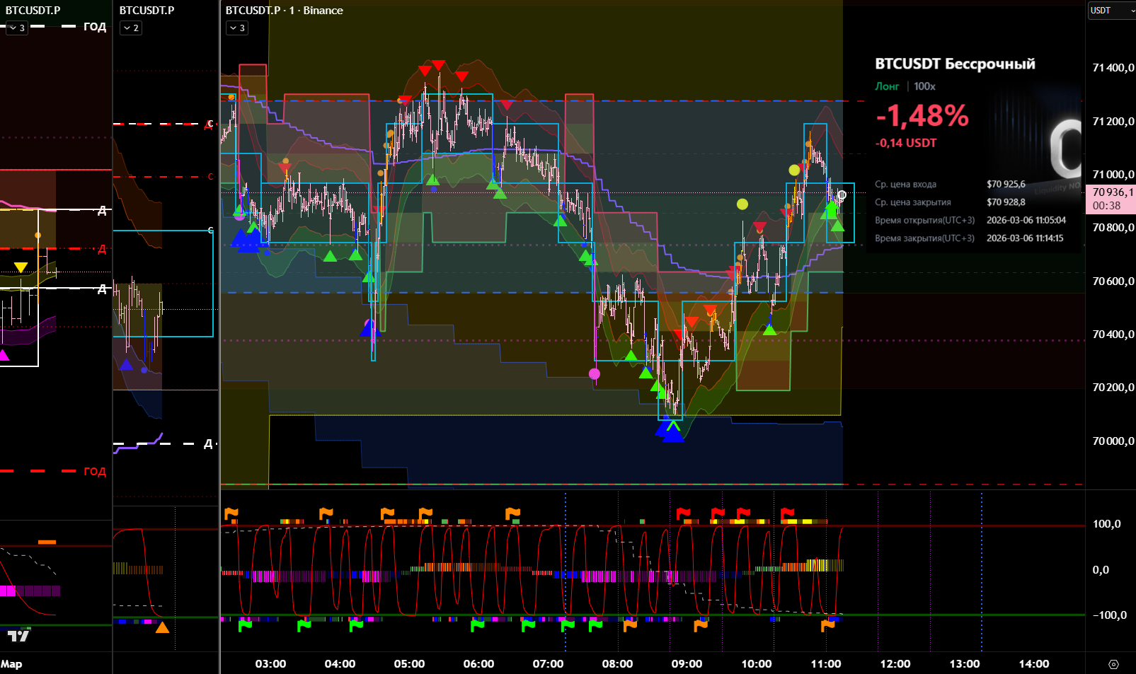 Снова вход по индикаторам. Но тут уже глупец я и вошёл в шорт на растущем старшем цикле и на лоях в среднесрочном тренде. Правда цикл развернулся после входа, а после обновления страницы оказалось что до. Но всё равно ошибка есть ошибка.