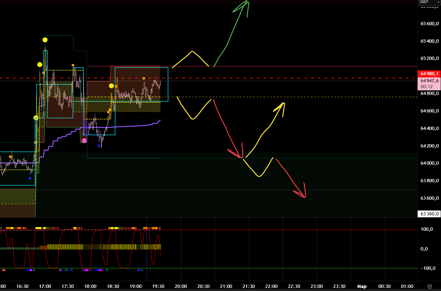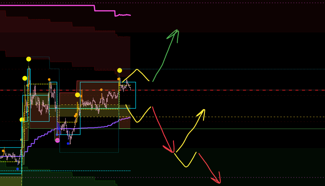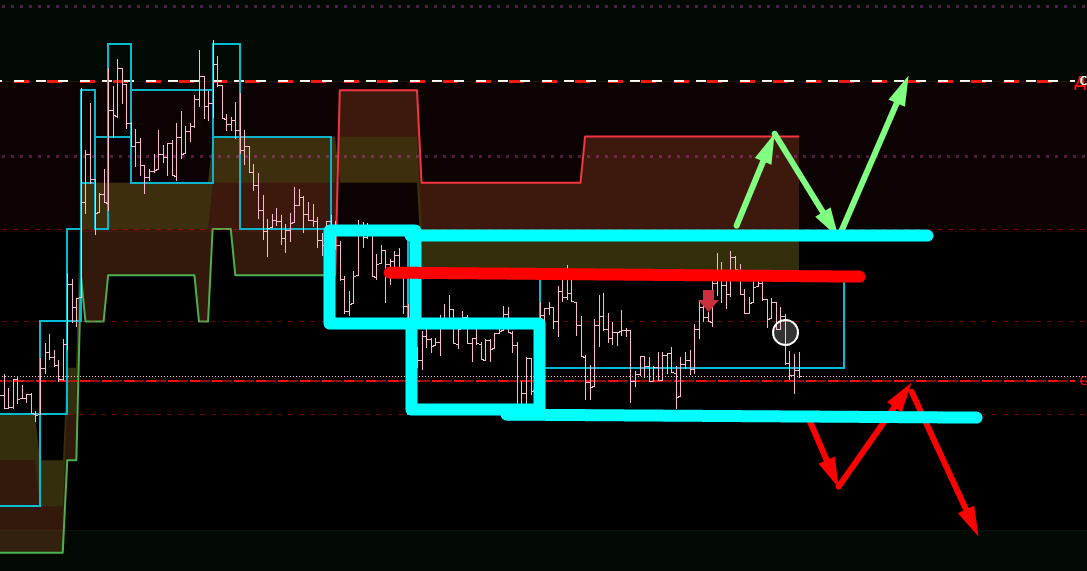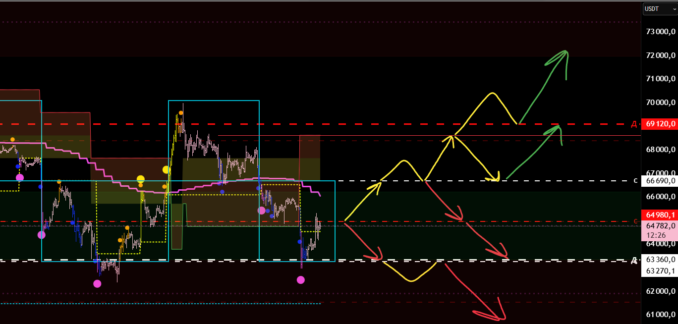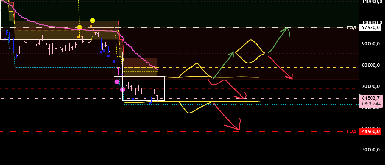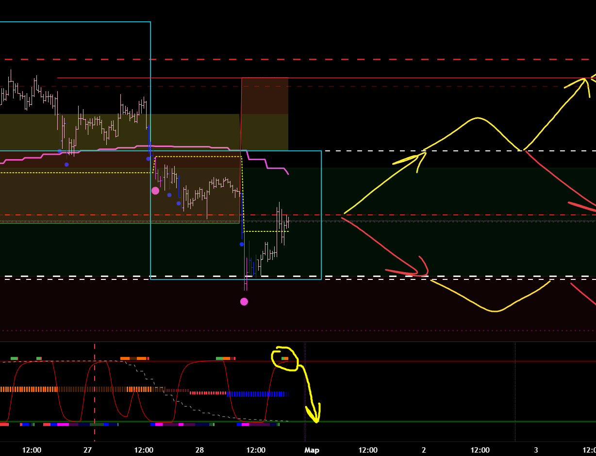 Если включить тренд, то эти зоны у нас совпадают с откатами по тренду. То есть в данный момент мы ожидаем лонговый откат старшего тренда, а затем на хаях ищем входы в шорт.