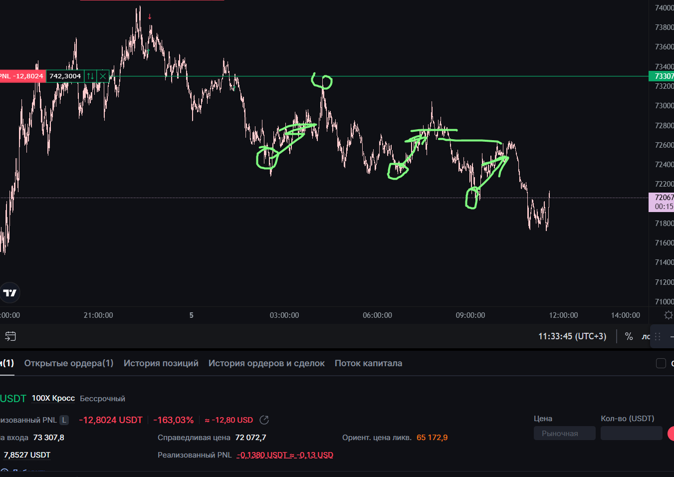 Изначально не хотел заходить. Понимал, что лой и шортить тут опасно. Но фомо попросило взять последний откатик. Ну и зашел аккурат перед разворотом.