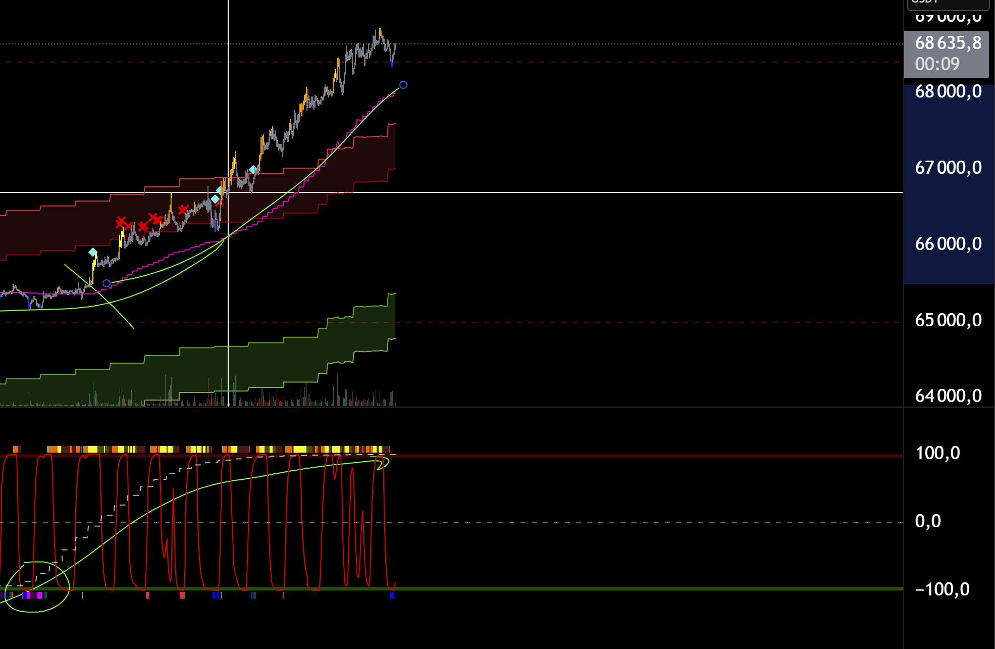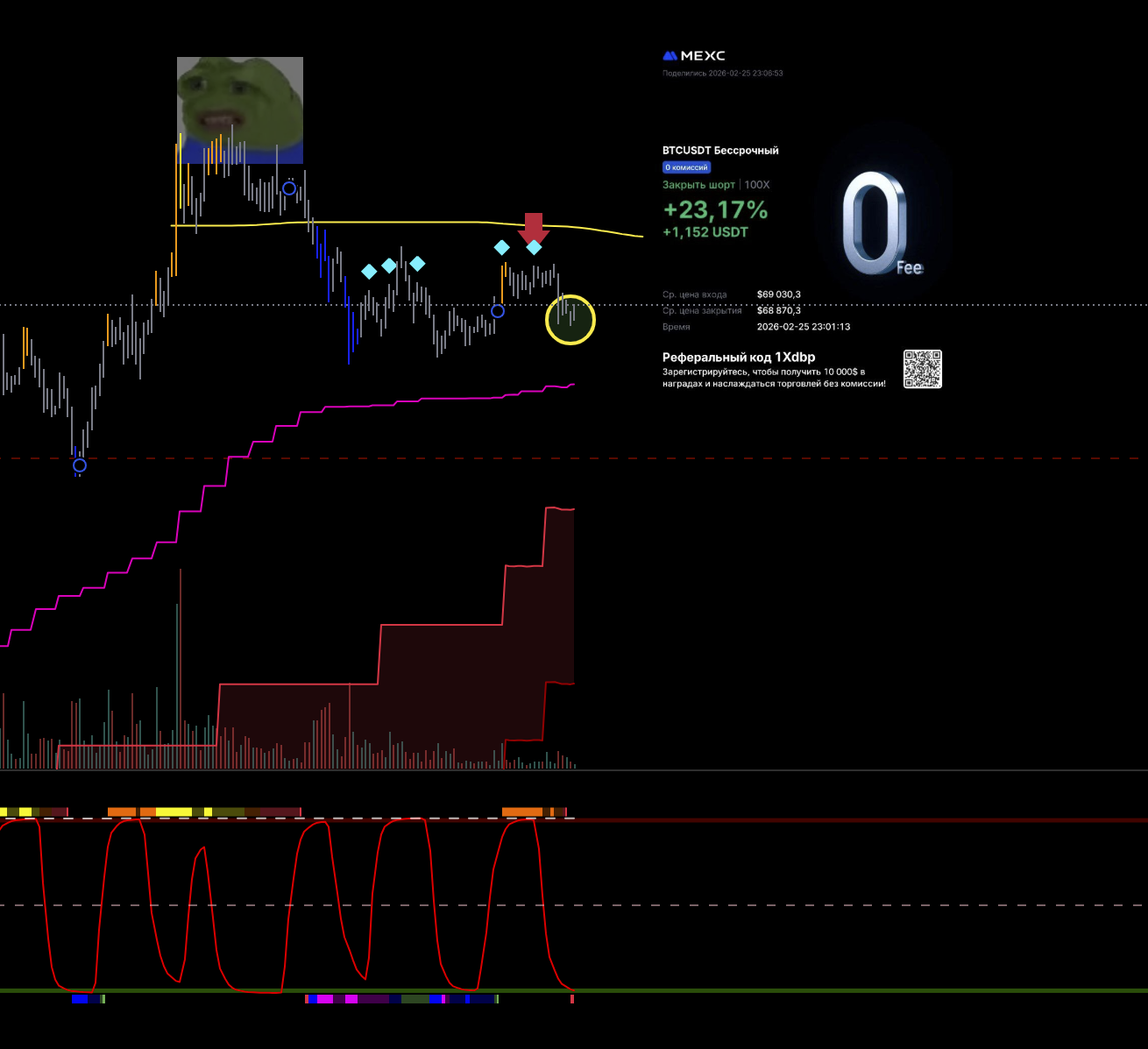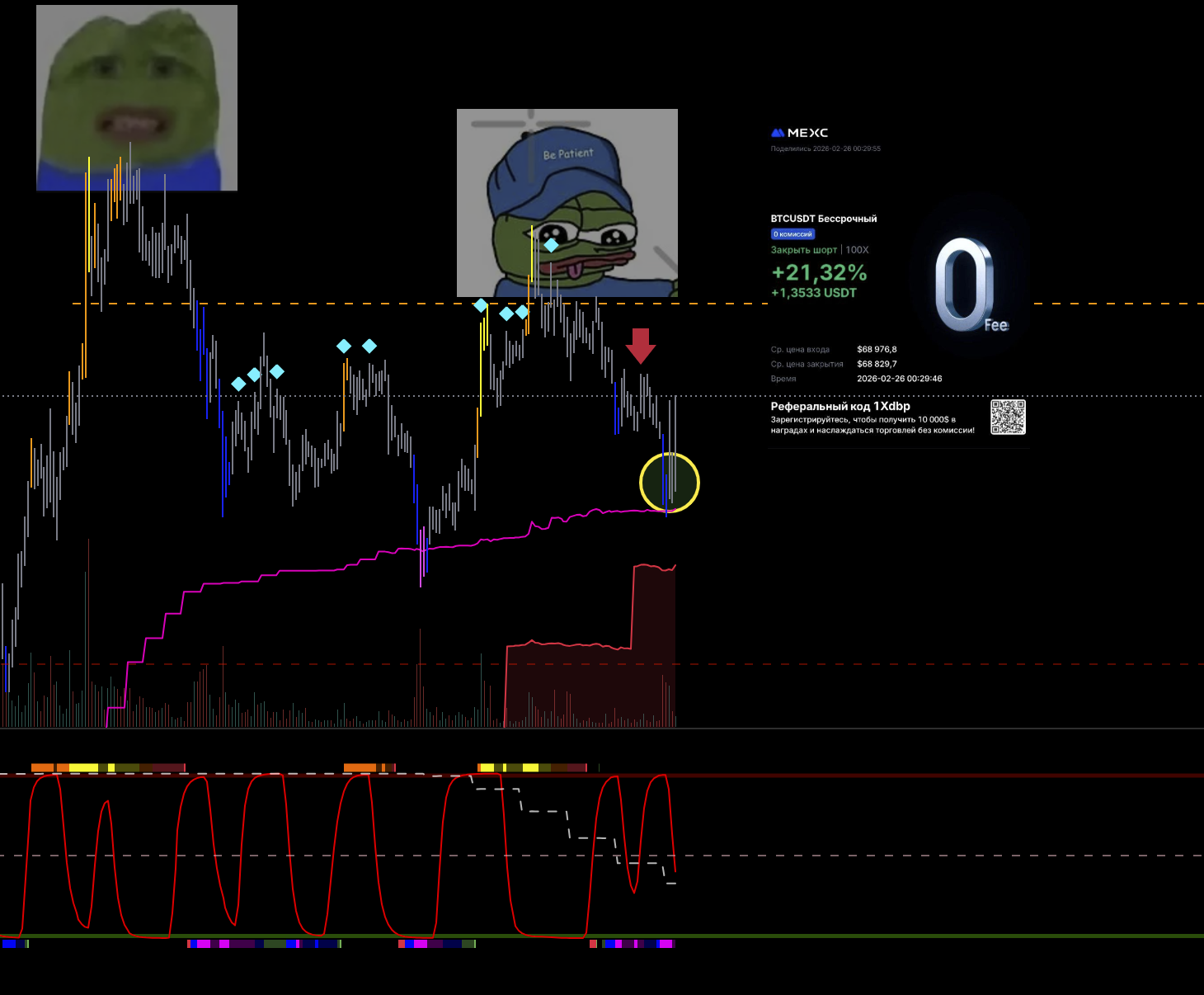 Поставил тейк на красивую цифру которой не хватало до х2). Мы в целом на хаях после бурного ночного роста, и цена уже идет в откате. Дошла до баланса. Цена под балансом - это ок. Сын на хае - это ок. Отец ну где то сверху - ок, но лучше бы чтобы был на хае в зоне бифуркации. Сила у сыночки корзиночки не горела. Объективно не лучшая сделка.