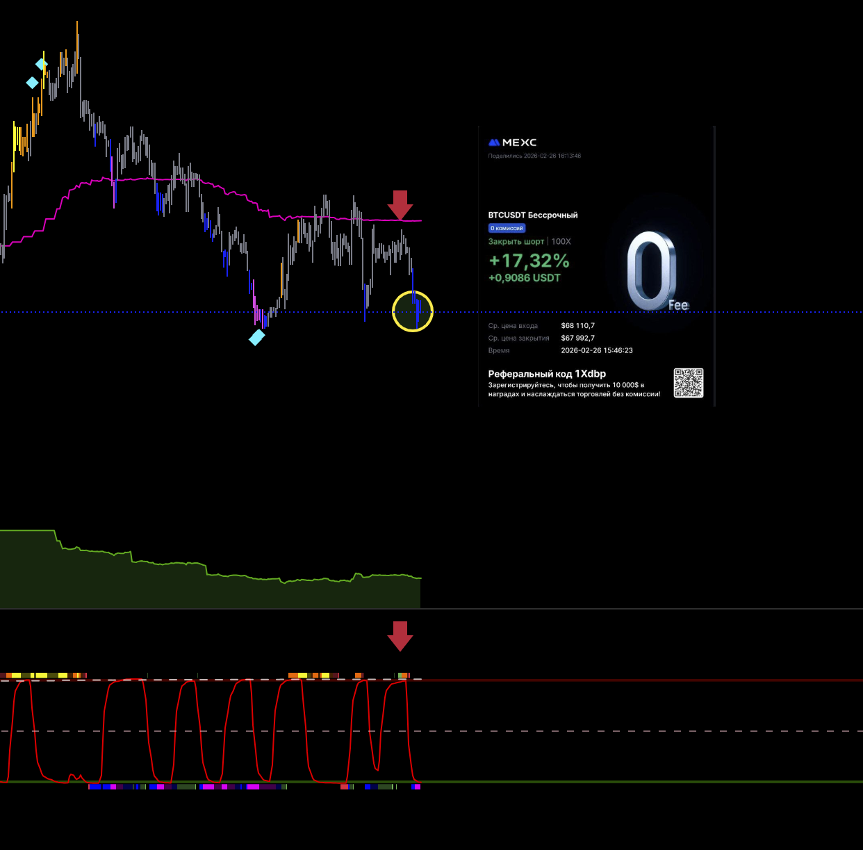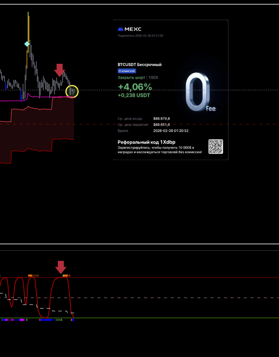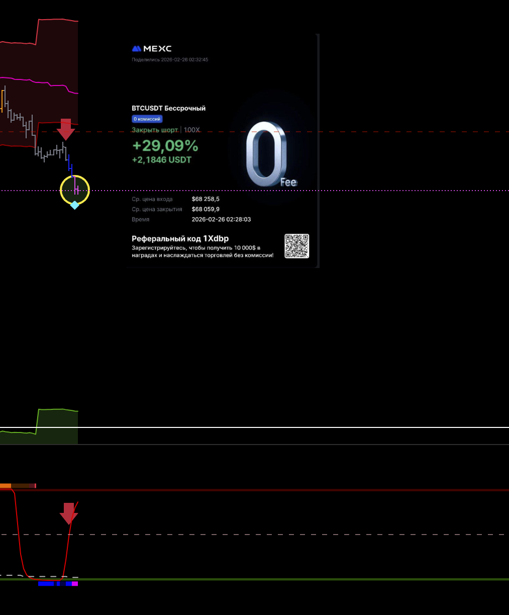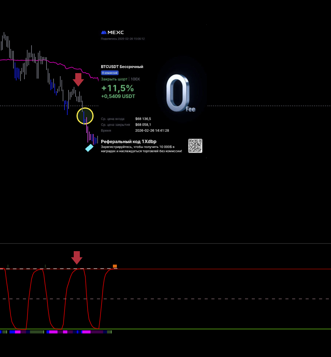 Первая идеальная сделка за эти сутки. Старшая линия цикла идет вниз. Локальная на хае. Горит сила пика. Цена под балансом. Как дошли до лоя вышел.