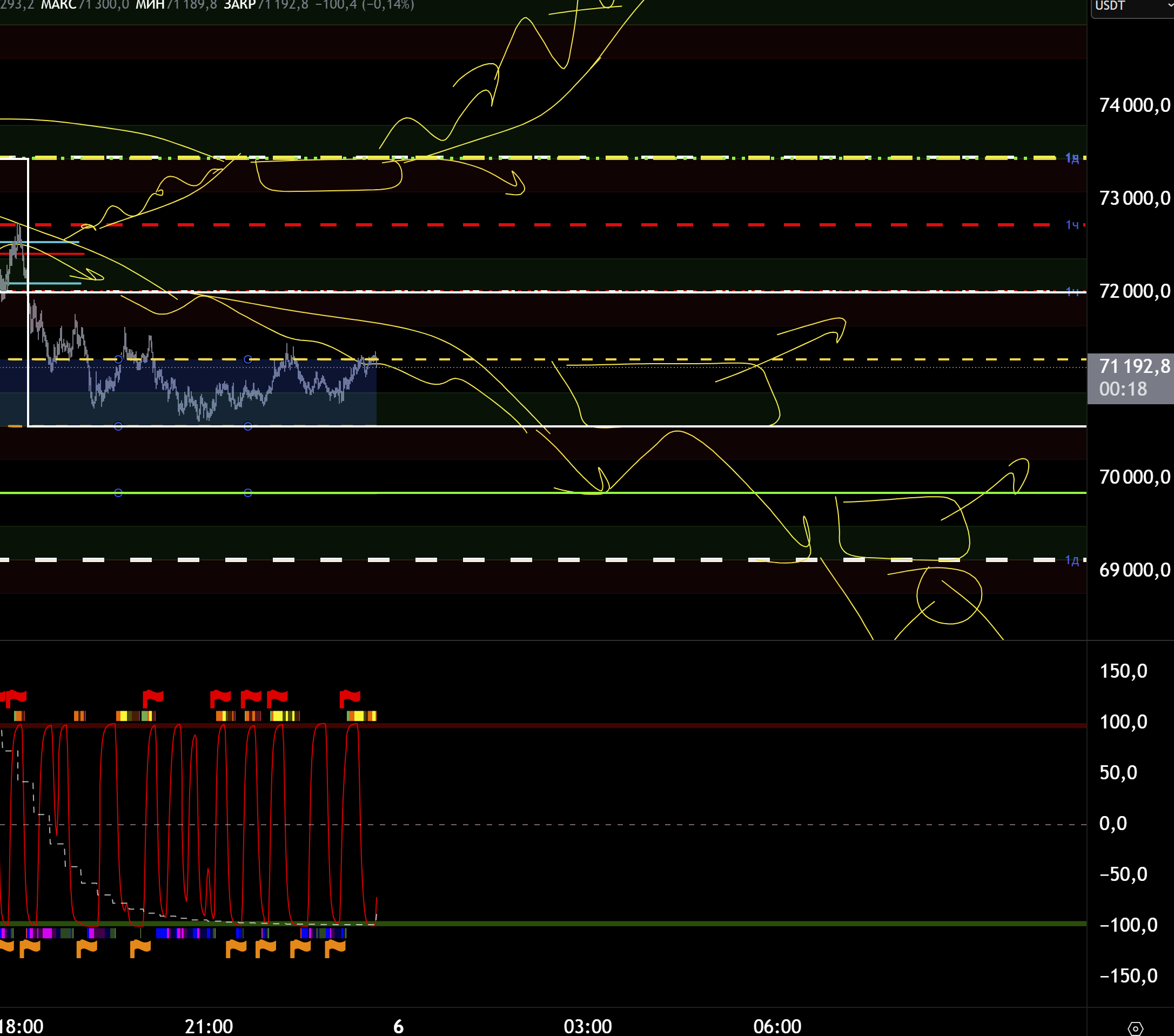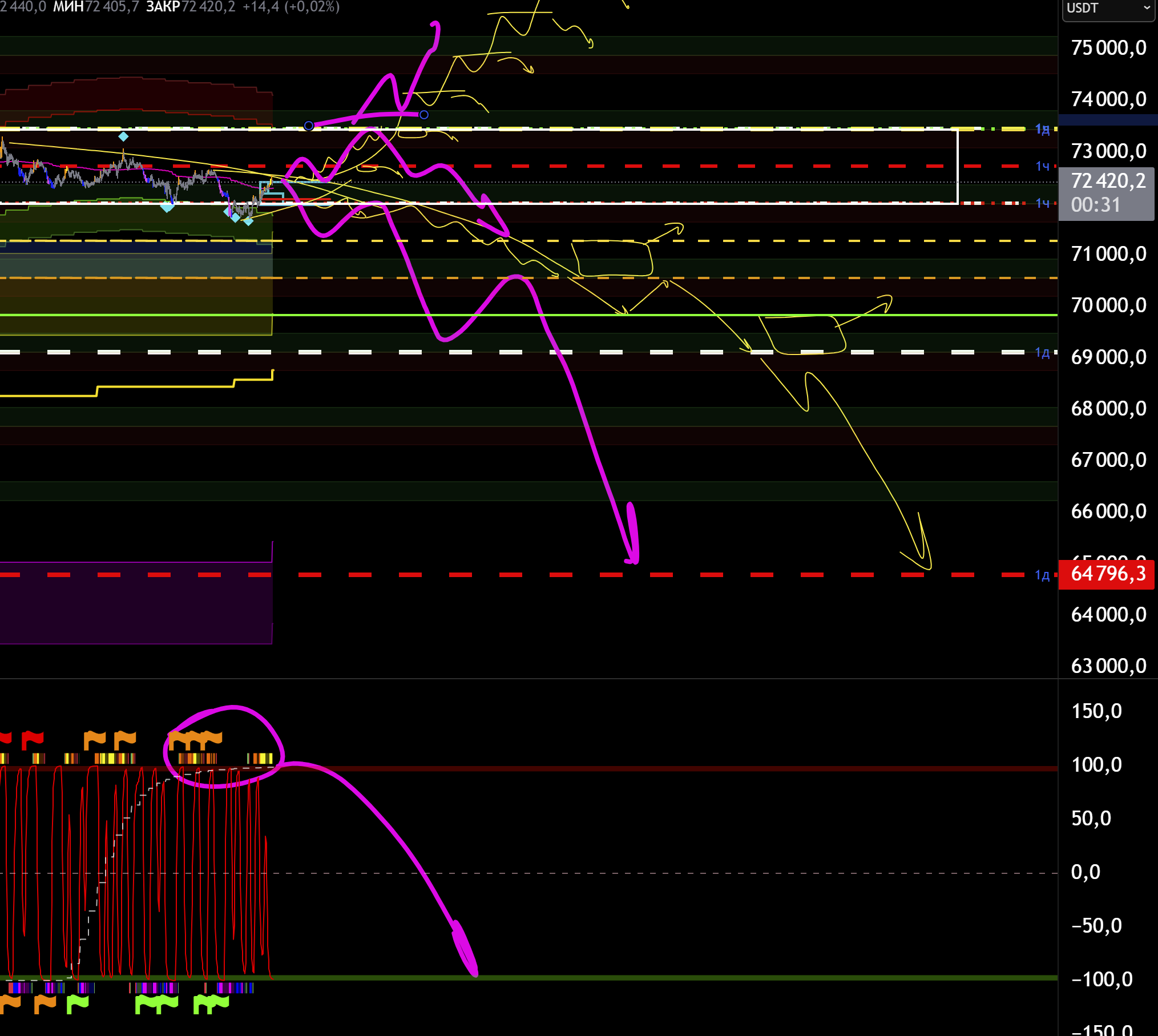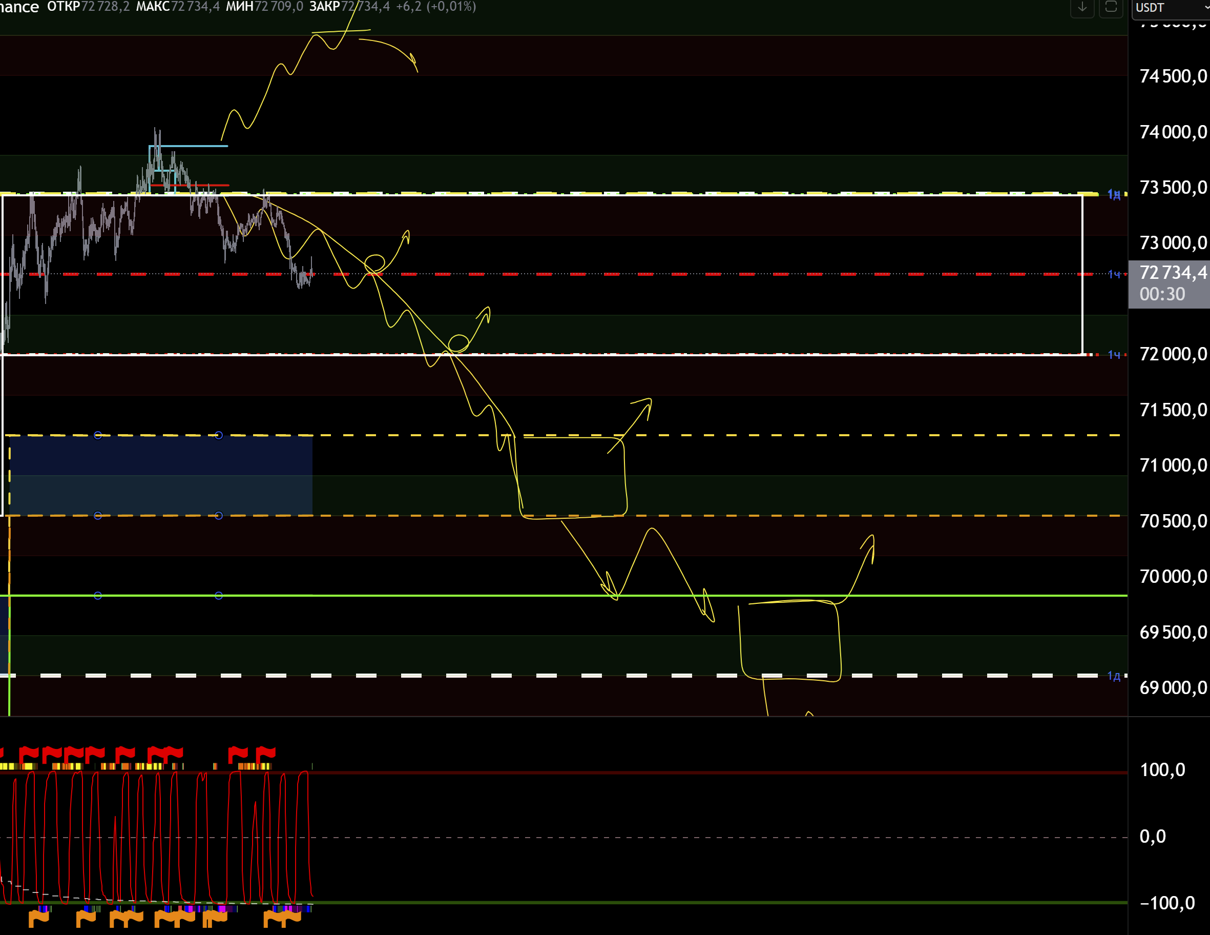 Если же ниже 70500 не упадет и не тейкнет 70к, то от туда возможно попытка разворота.