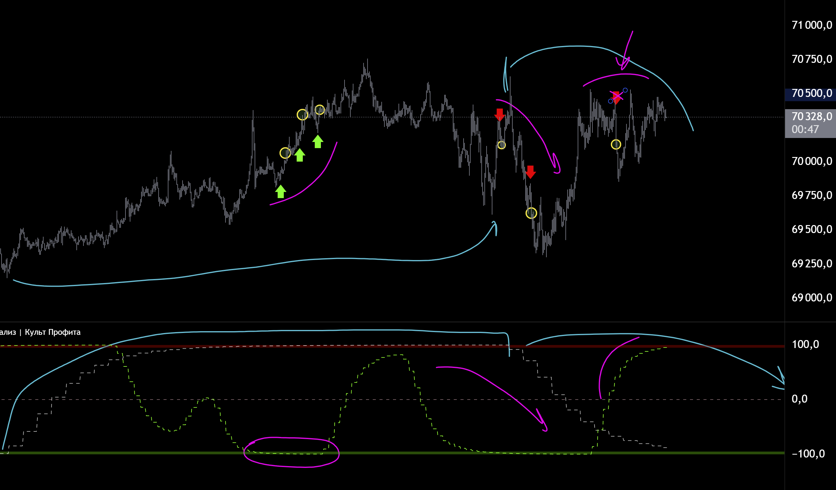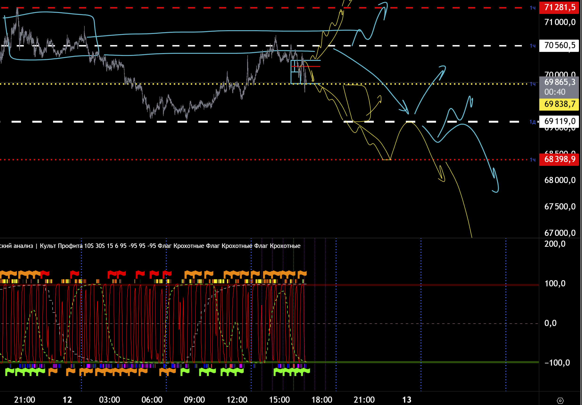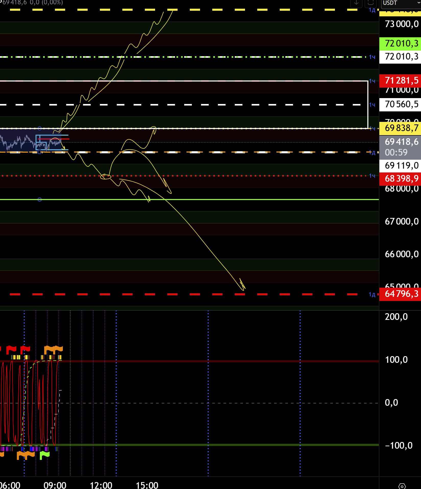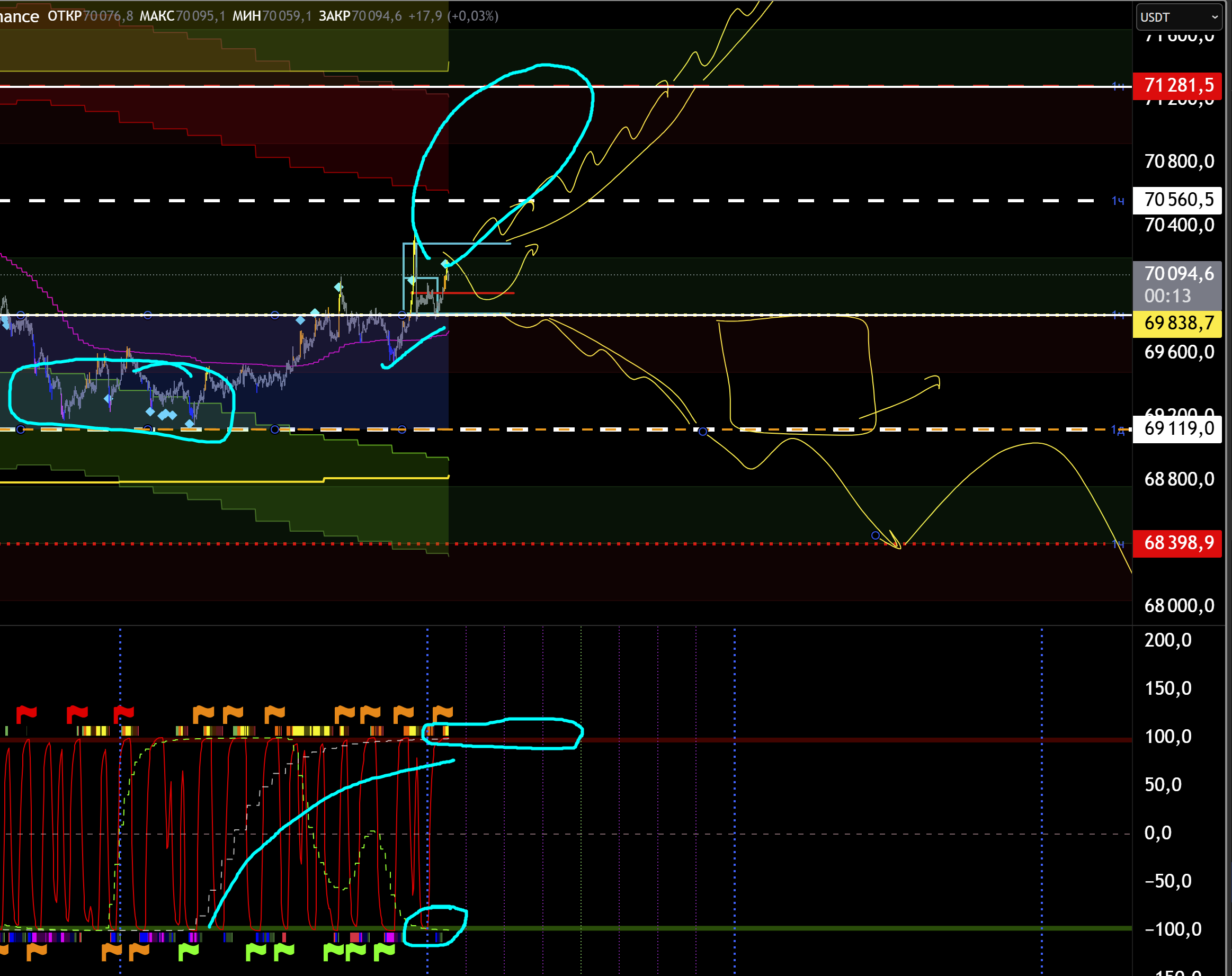 Да и в целом мы на хаях есть куда падать так то. СЦ хай. МСЦ лой. Ждать МСЦ хай и шортить на досос к 69100. Если упадем ниже 69100 еще лучше от хая шорта тоже. Ну вот такое ичо