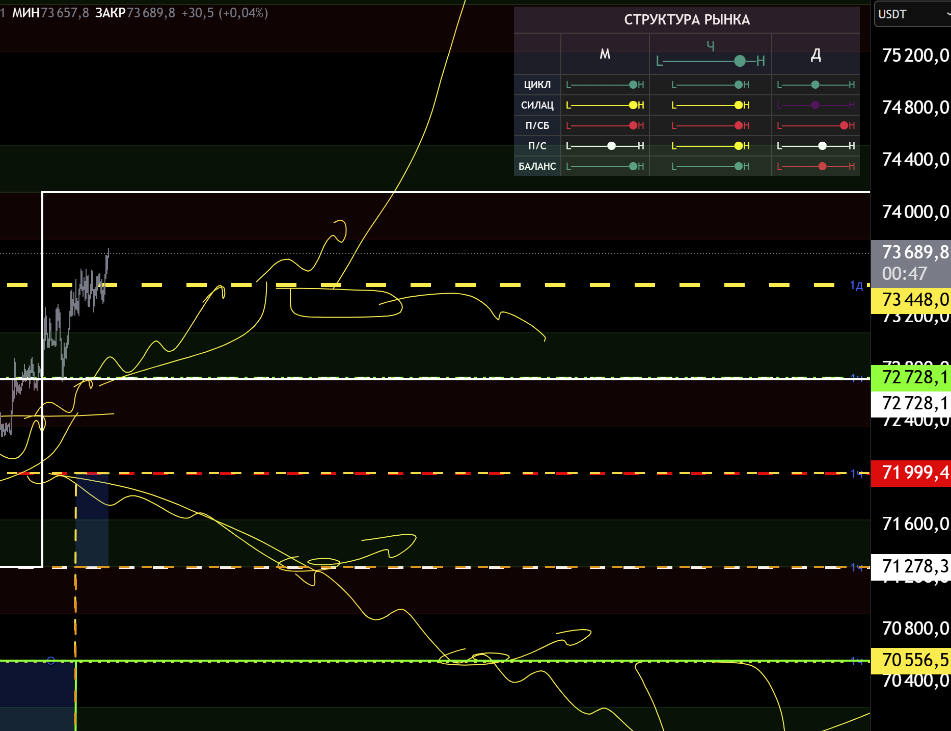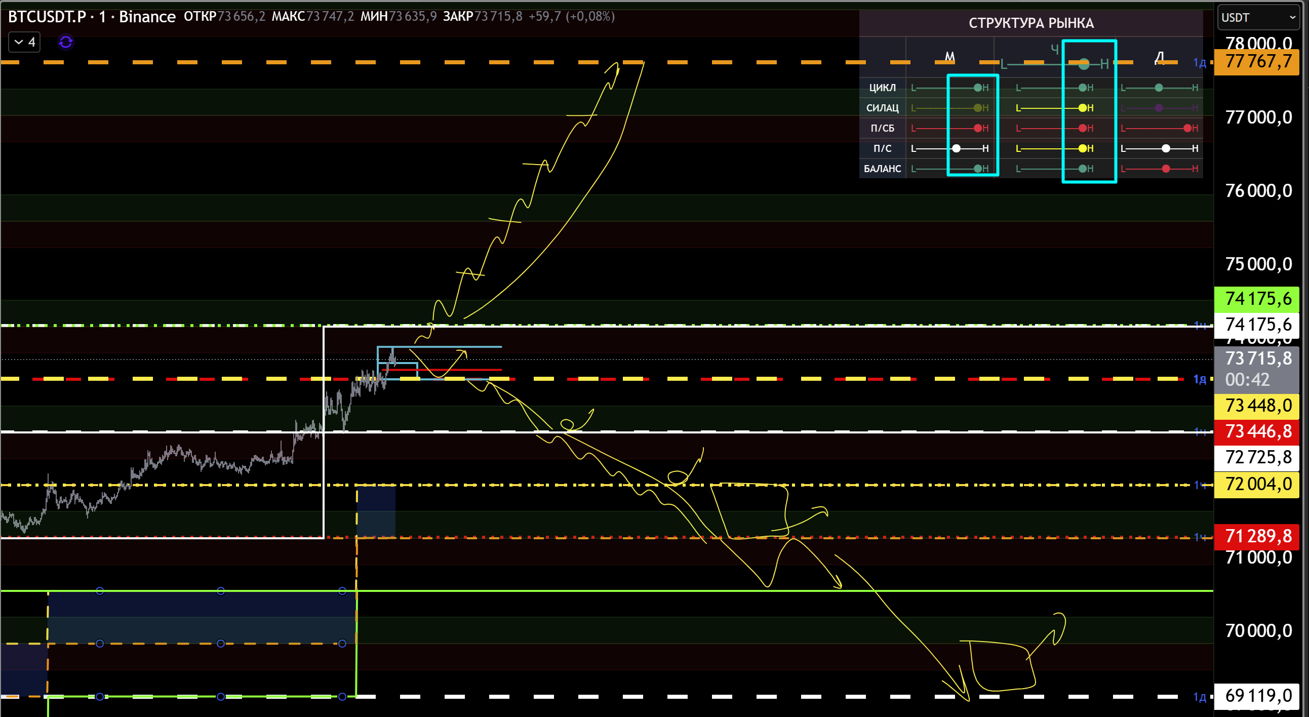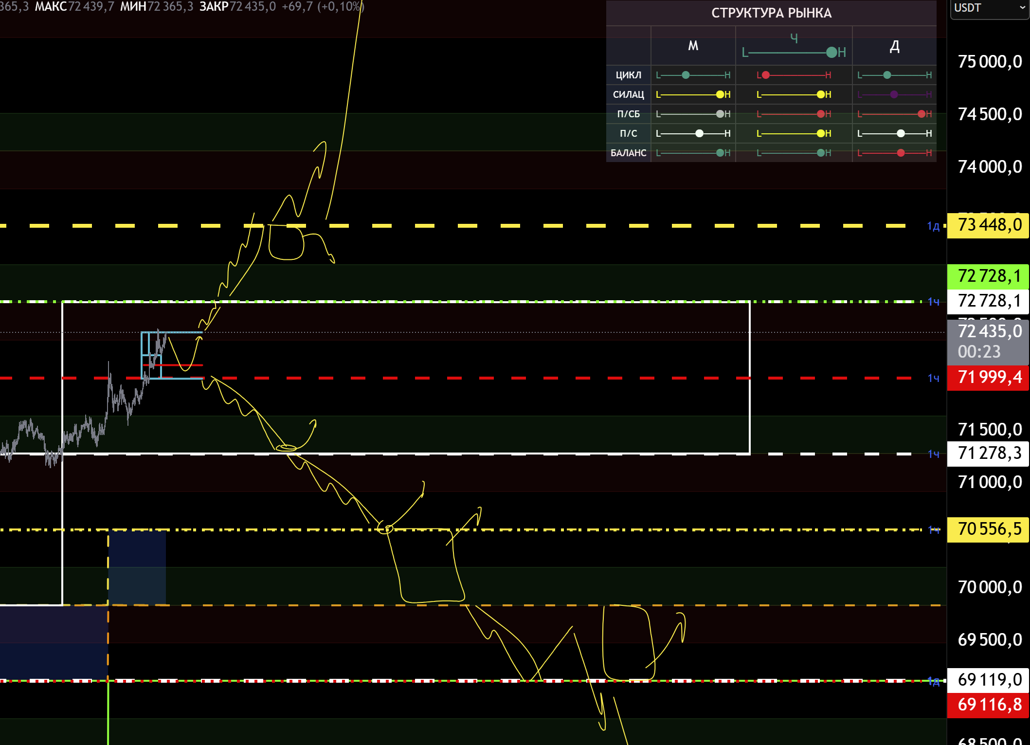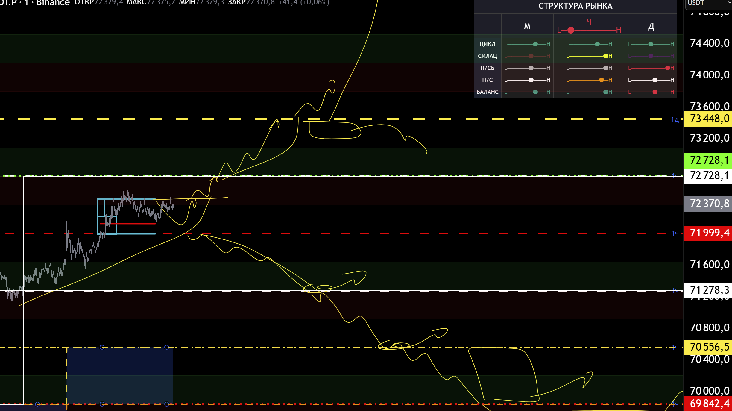 Снизу поддержка 71999, пробив её начнем откаты в зоны 71278 - 70556 - 69800 - 69100