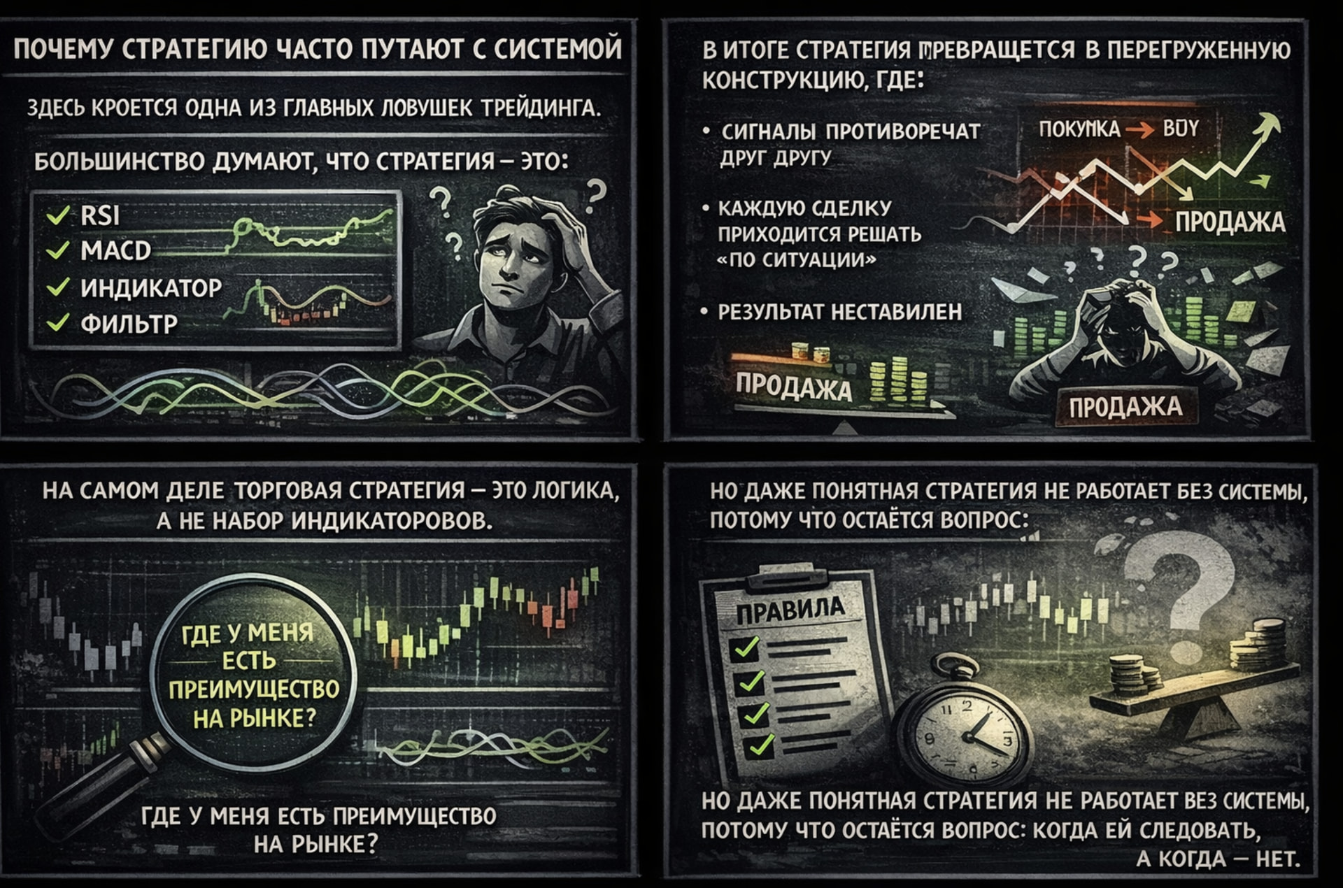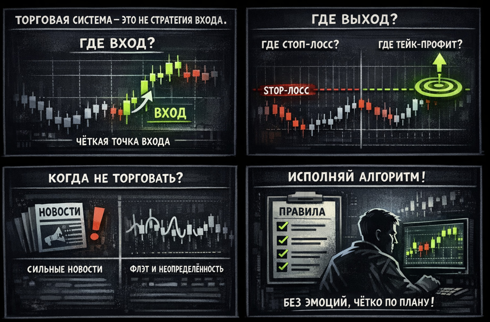 Торговая система — это набор заранее определённых правил, который отвечает на все ключевые вопросы ДО открытия сделки, а не во время неё: