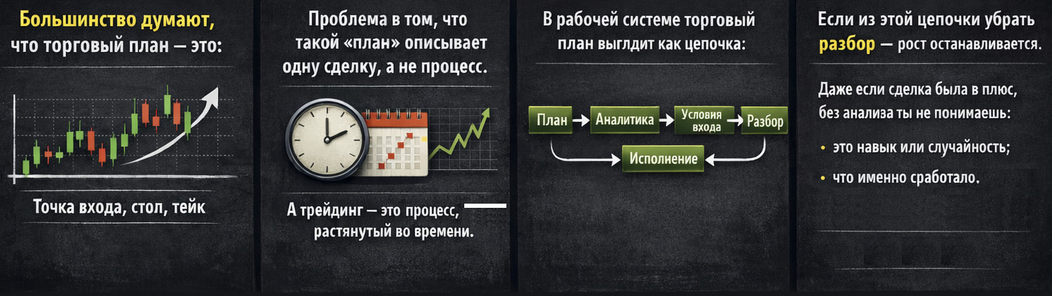 Поэтому торговый план — это не про «угадал рынок», а про управляемость действий.