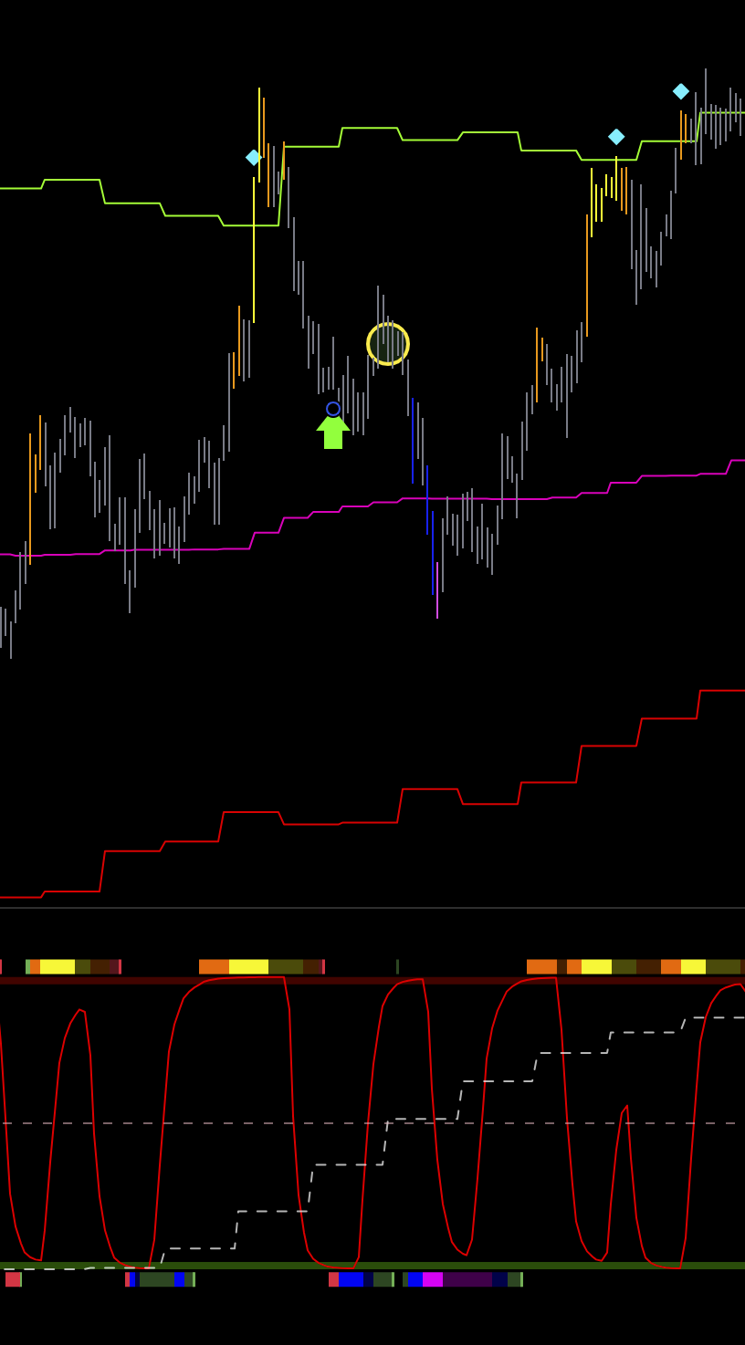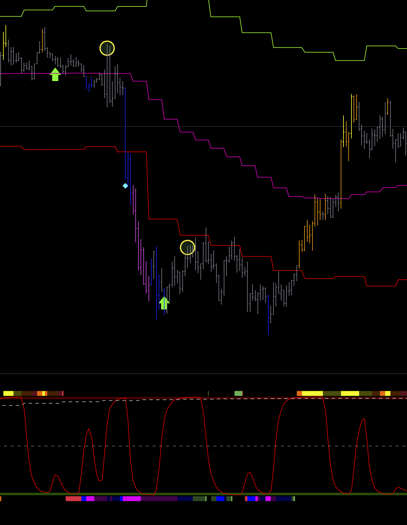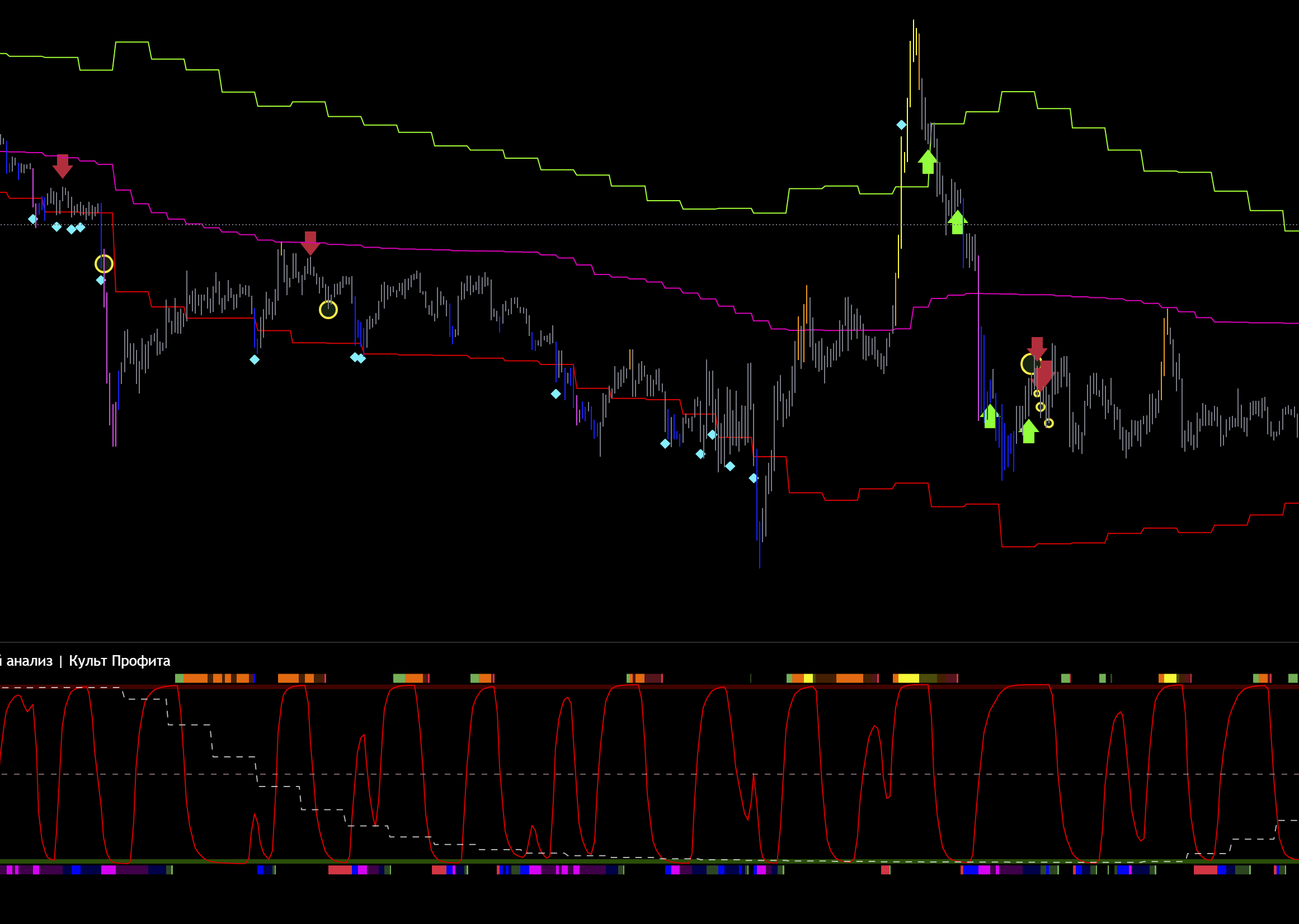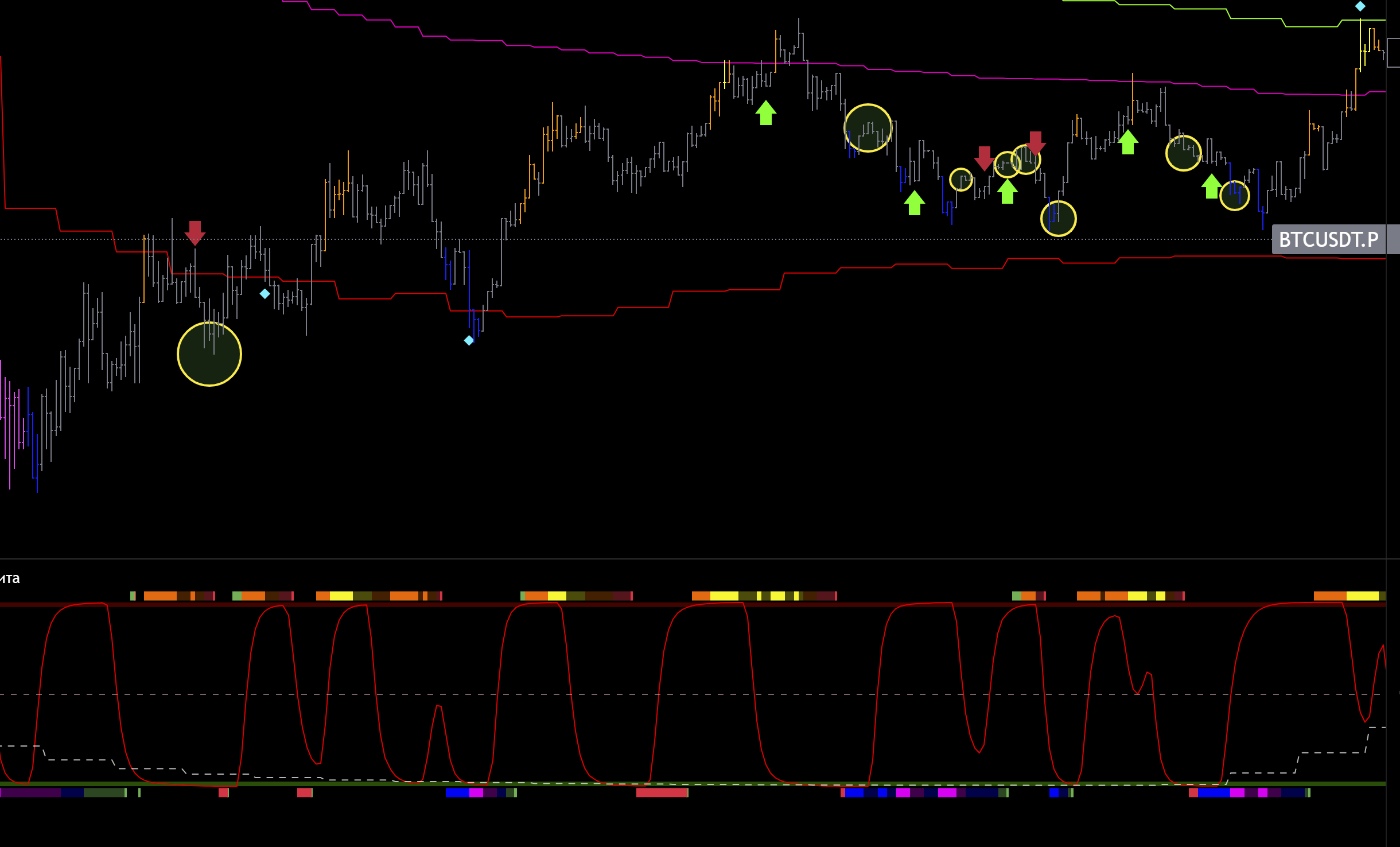 2 шорт на графике , так же линия цикла младшая снизу, и сила пика и спада снизу, входа не может быть.