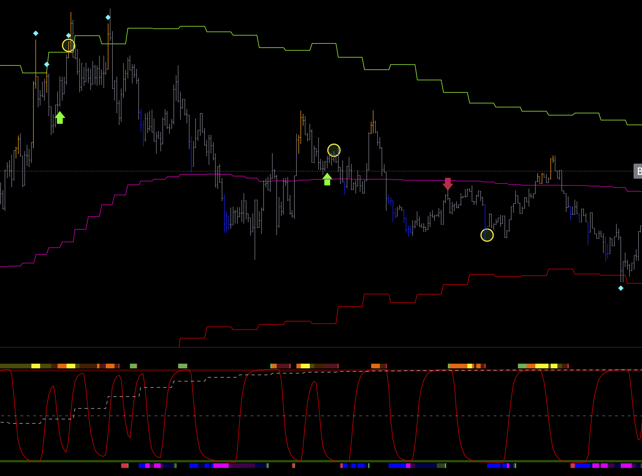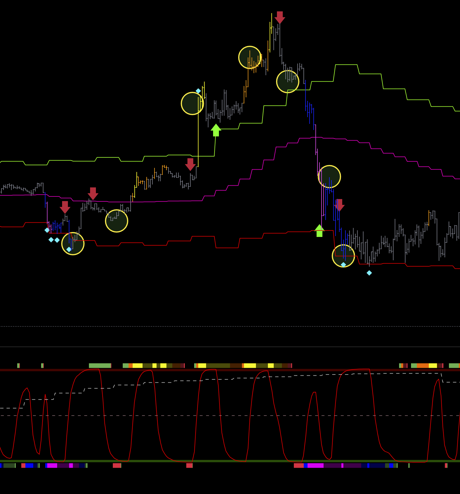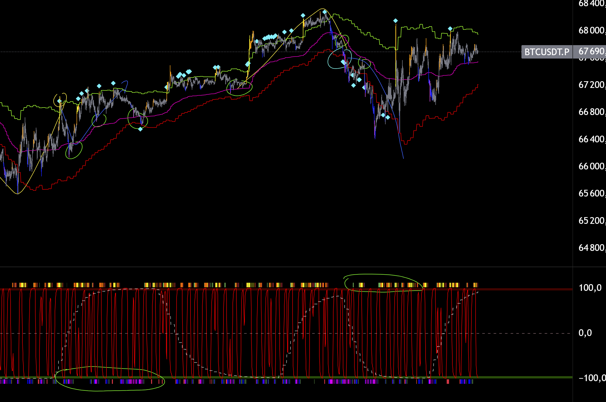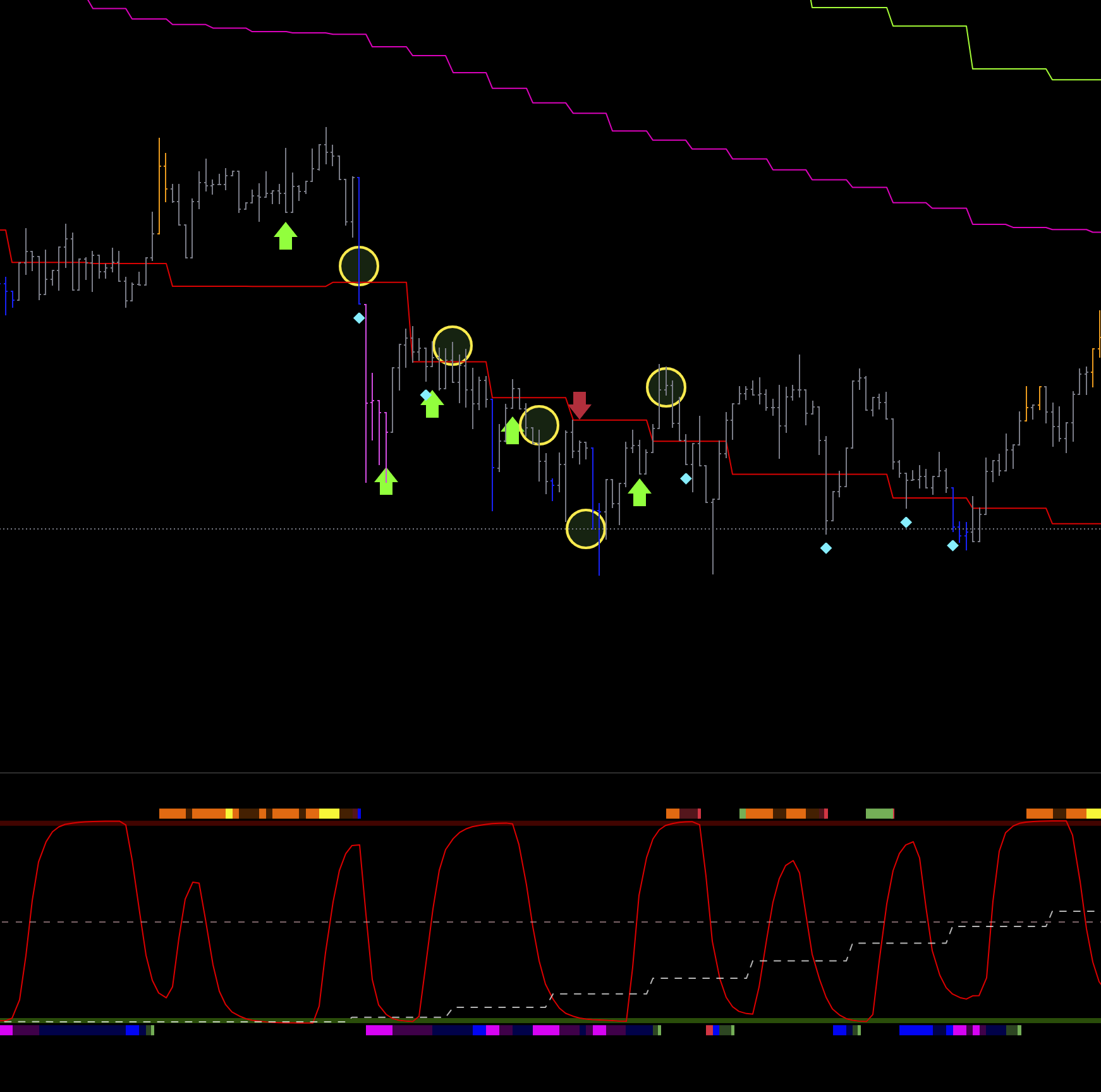 2 шорт на графике , так же линия цикла младшая снизу, и сила пика и спада снизу, входа не может быть.