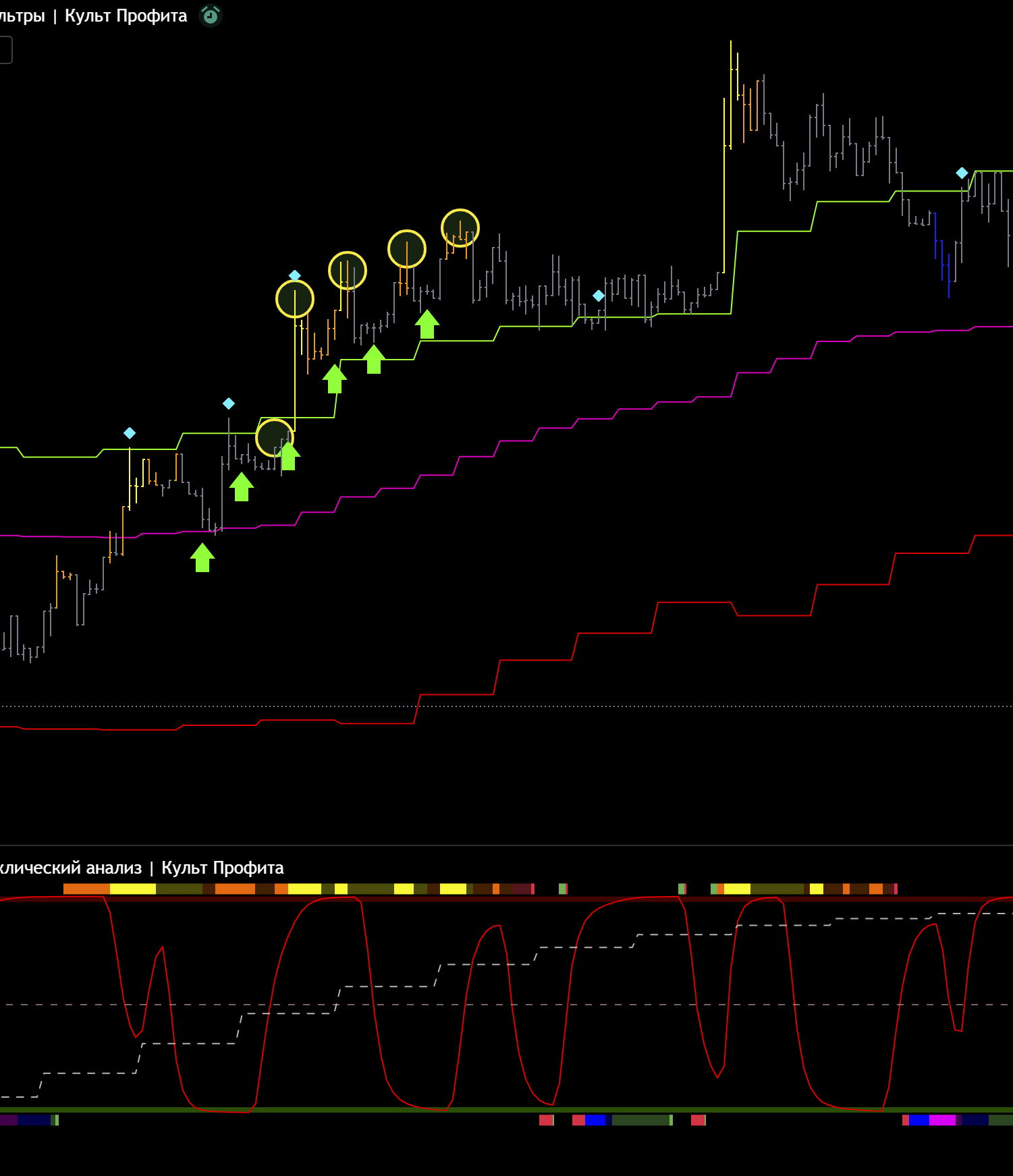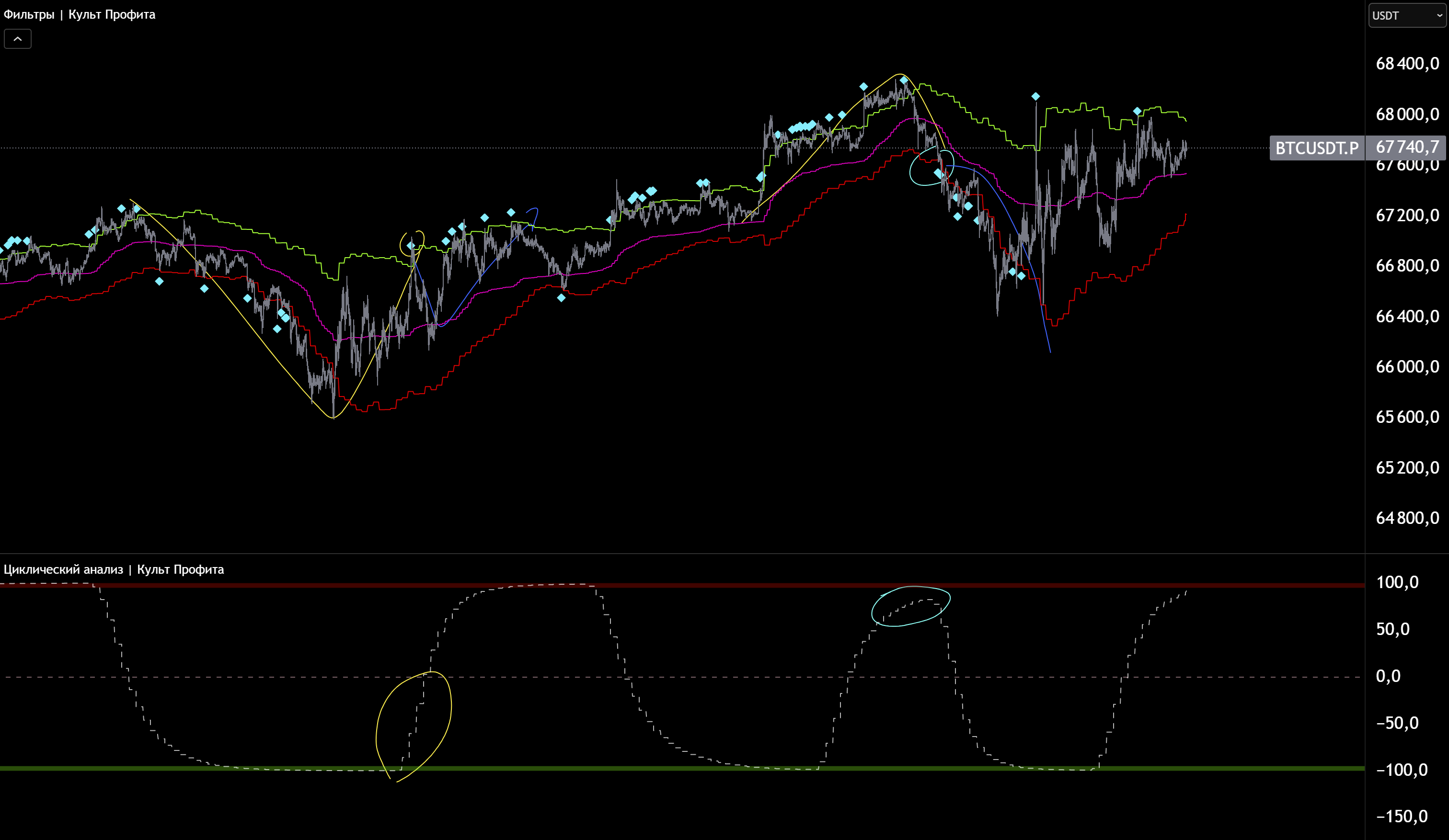 Ждем импульс в сторону тренда. Если линия цикла снизу, ждем импульс вверх.